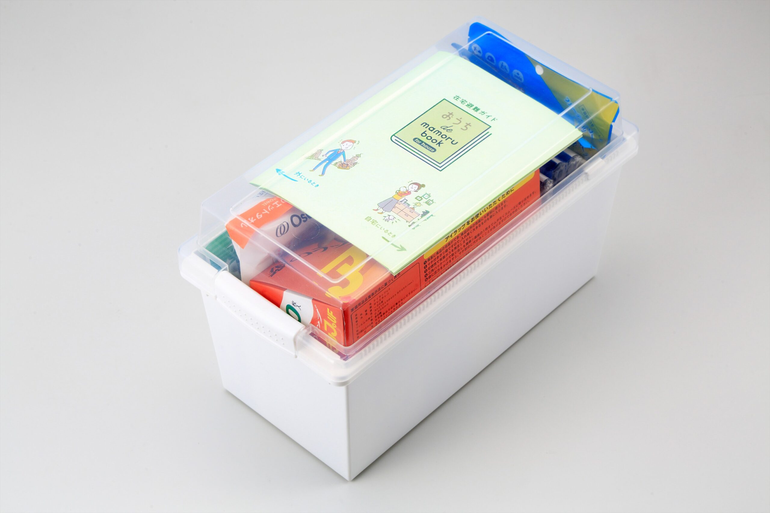 「おうち de mamoru box 」に収容されている全11品目と在宅避難ガイドブック「おうち de mamoru book」