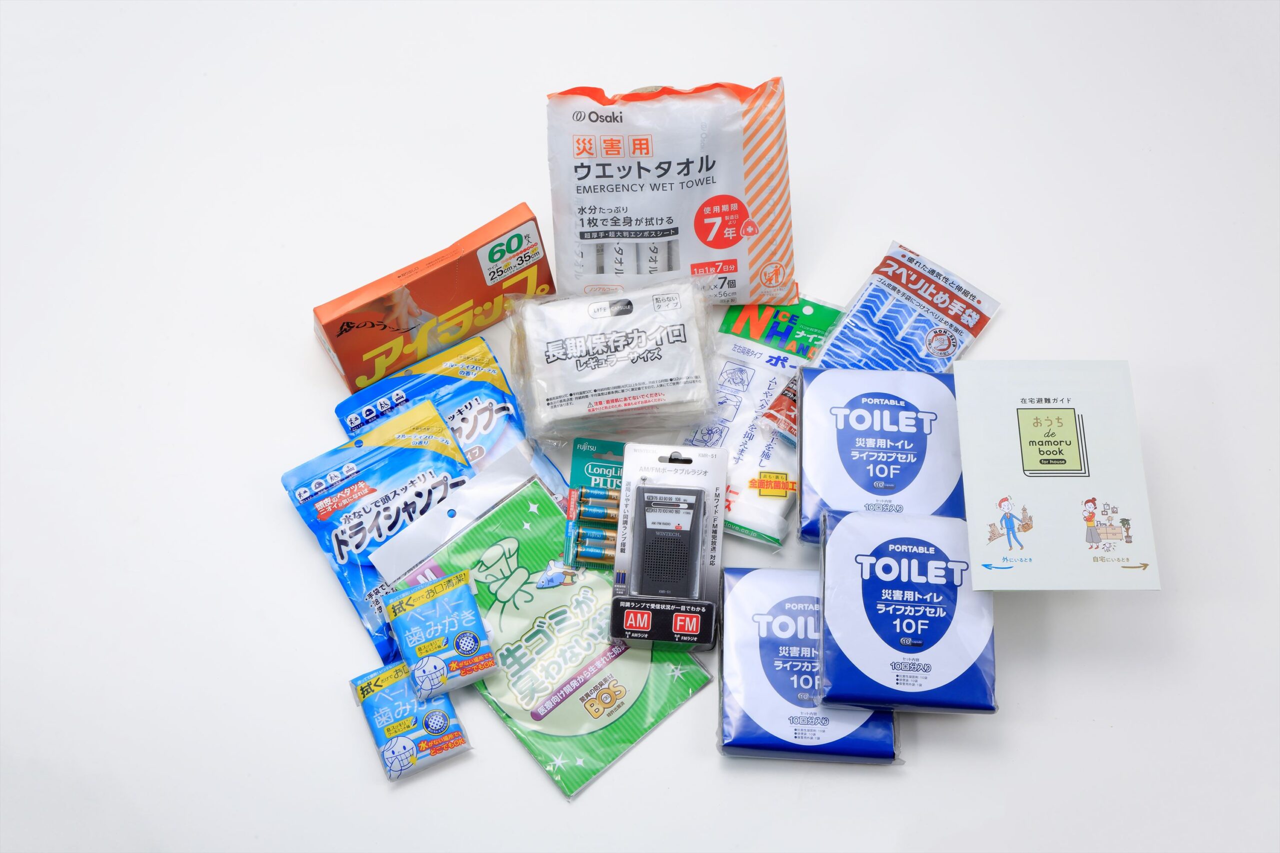 防臭袋は非常用トイレとしても、普段の生ごみ処理にも使える実用品。手回し不要のポータブルラジオも、誰でも扱いやすく、災害時に直ぐに情報を取れることを優先した選択です。