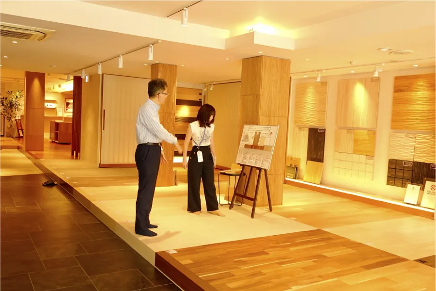 足裏に伝わる感触で床材の違いを実感できる体感型ショールーム。
