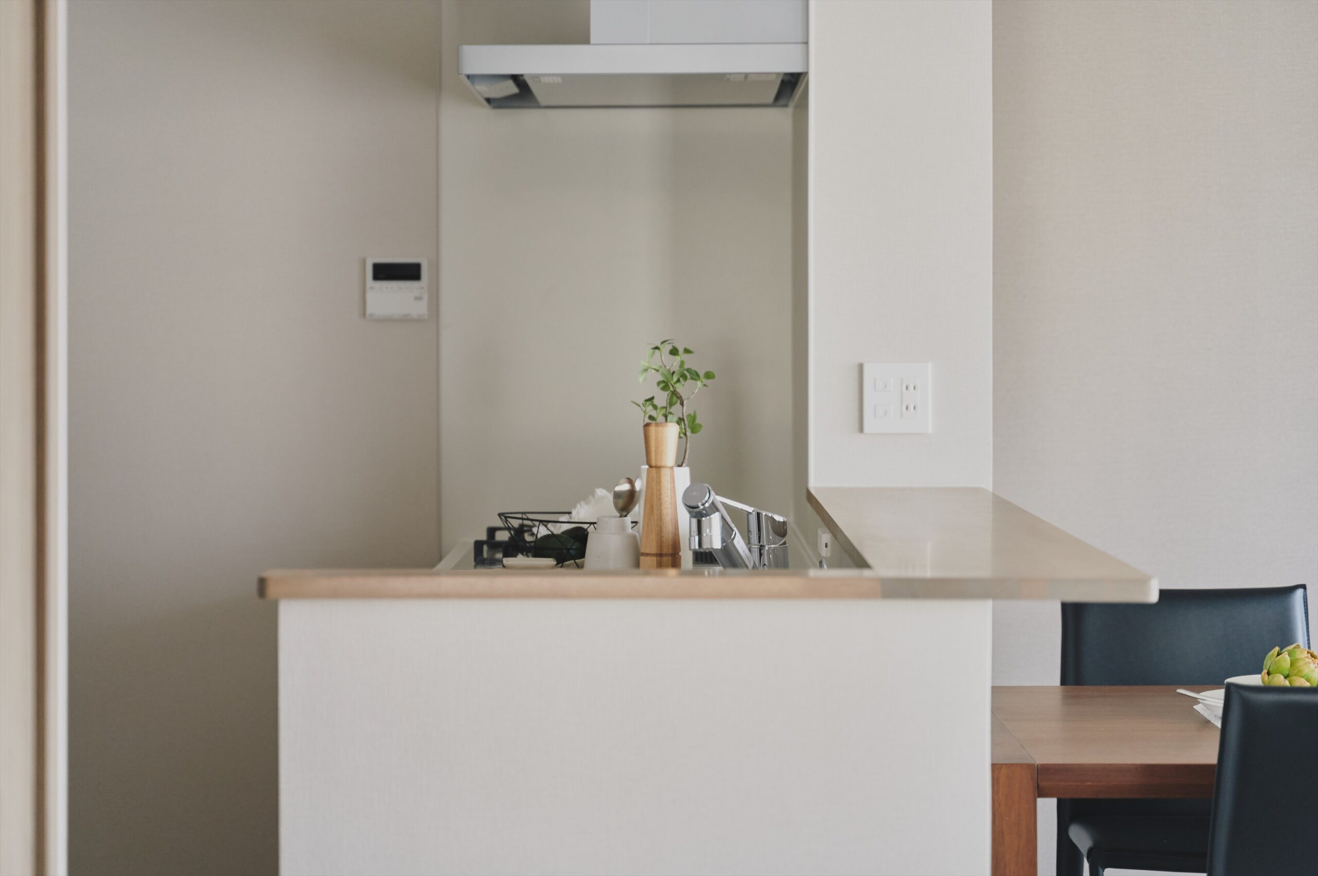 会話が弾む対面式キッチンは、デザイン性と機能性を兼ね備え、毎日の料理時間を快適にサポート。耐久性に優れた人造大理石カウンターは衝撃や汚れに強く傷がつきにくいので、毎日気持ちよく使えます。