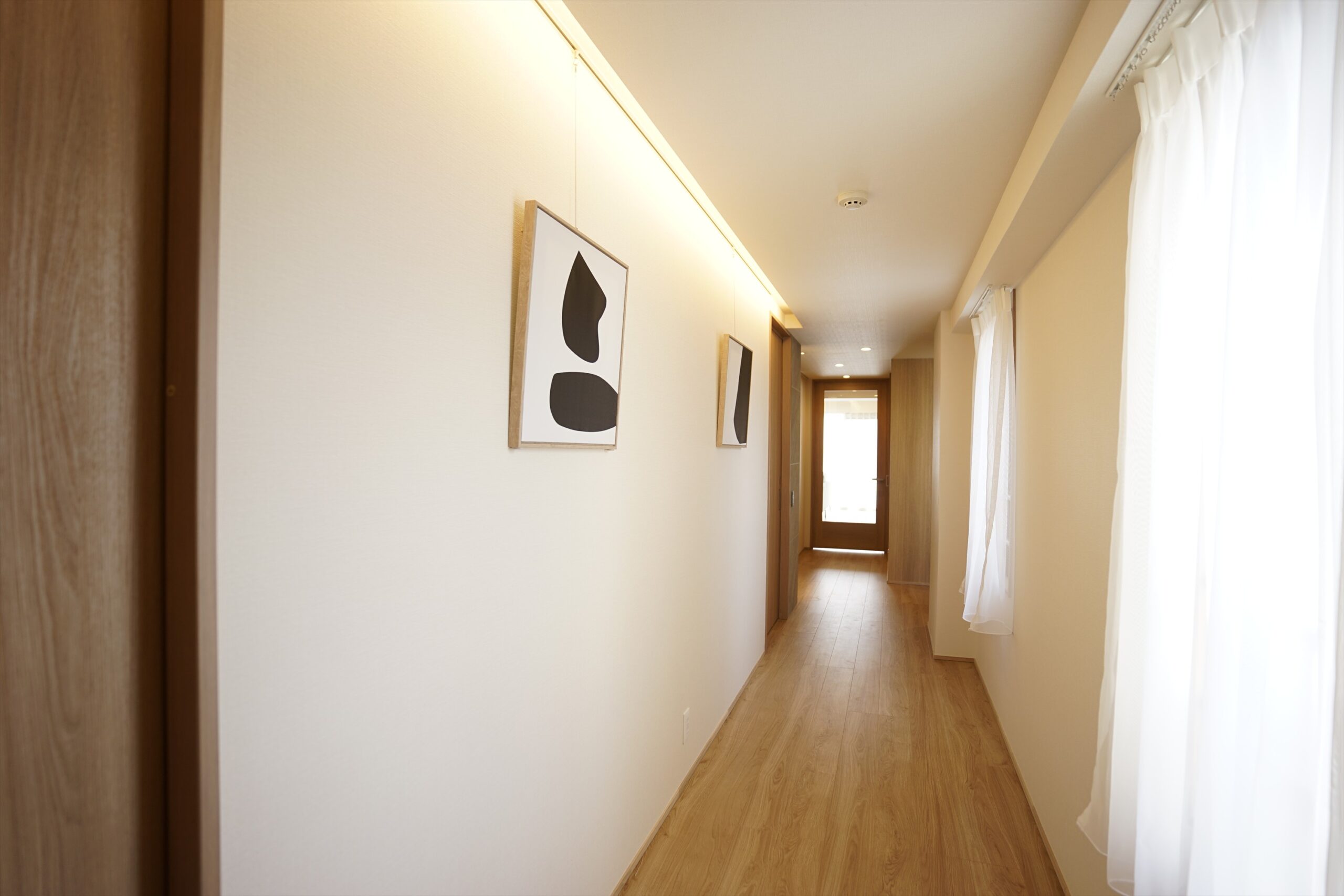 統一感のあるフロアタイルが足元から洗練された印象を与え、玄関から奥へと続く長い廊下は、まるでプライベートなアートギャラリー。お客様をお迎えする際も、この端正な空間が期待感と共に内部へと誘います。