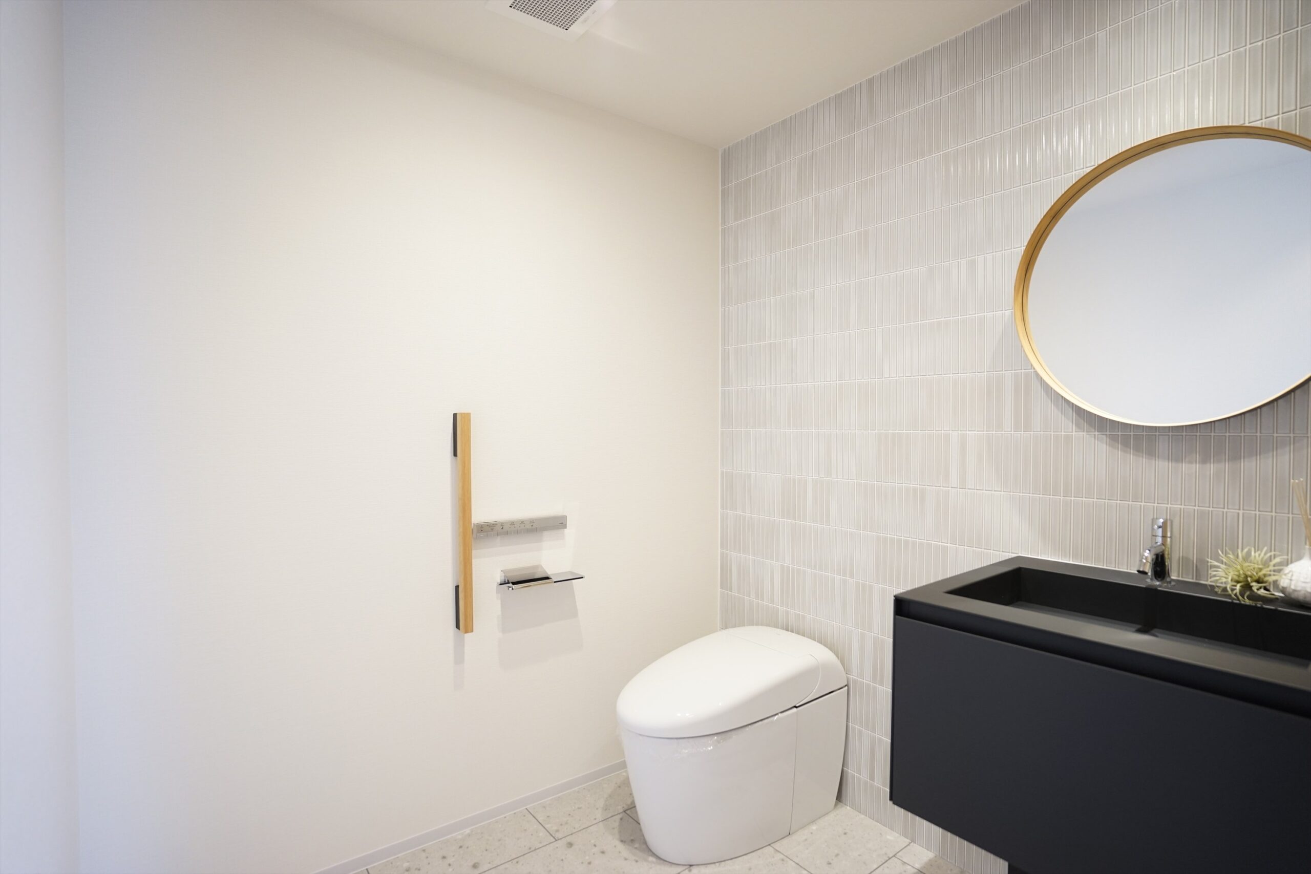 壁面タイルとフロアタイルがモダンな雰囲気を演出する広々としたトイレは車いすでも出入り可能な広さを確保しています。