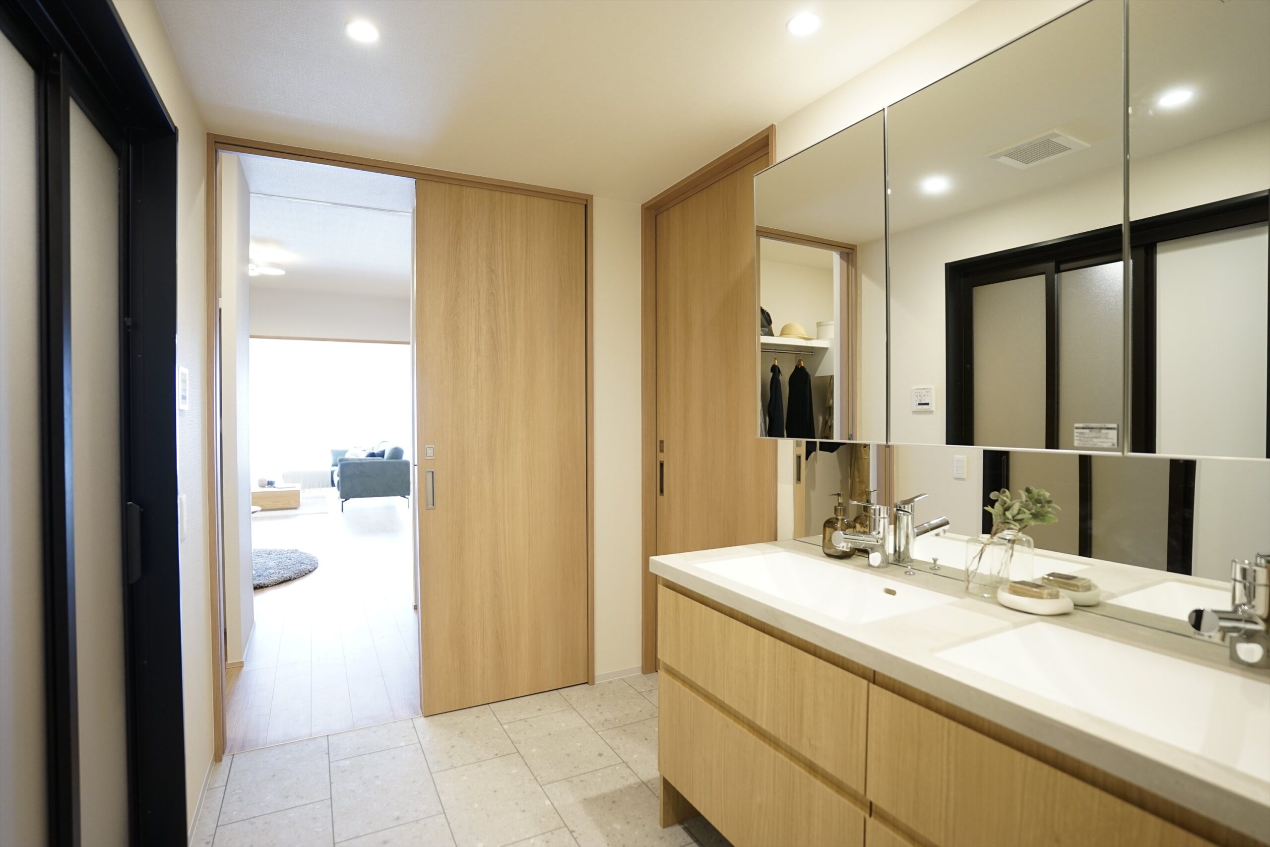 2ボウルの洗面化粧台を設置したワイドなパウダールーム。フロアタイルを採用し、素材の切り替えがさりげないアクセントに。清潔感を保ちながらも単調にならず、空間に落ち着いた深みをもたらします。また、生活感の出てしまう洗濯機は扉の中へ配置し、豊富な収納スペースを確保することで空間をすっきりと演出します。