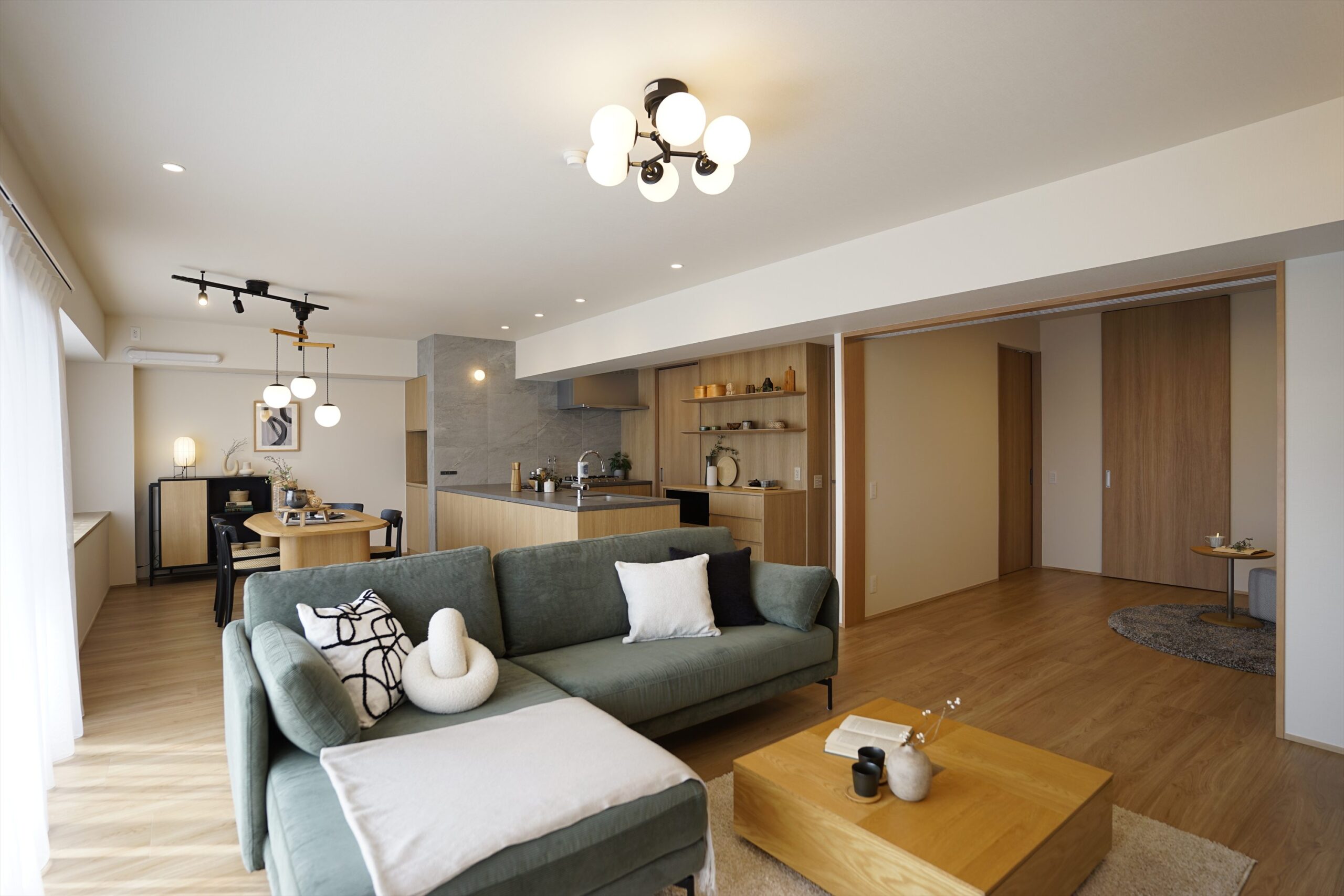 リビングから繋がる洋室は、三連引戸を閉めれば独立した洋室に。落ち着いた雰囲気の洋室はセカンドリビングとしても、趣味に没頭する空間としても大活躍。洋室から繋がるウォークインクローゼットを抜ければ洗面室に繋がる回遊動線も魅力です。