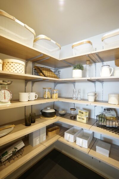 キッチンは、開放感のあるL字型。作業スペースを確保しやすく、下ごしらえから盛り付けまでの流れが自然にまとまります。天板にはフィオレストーンを採用し、機能性だけでなく落ち着いた質感がLDK全体の印象を引き締めます。また、カップボードとパントリーを備え、食器やストック類を収めやすい構成。作業面の上をすっきり保ちやすく、日常の整いが長続きします。