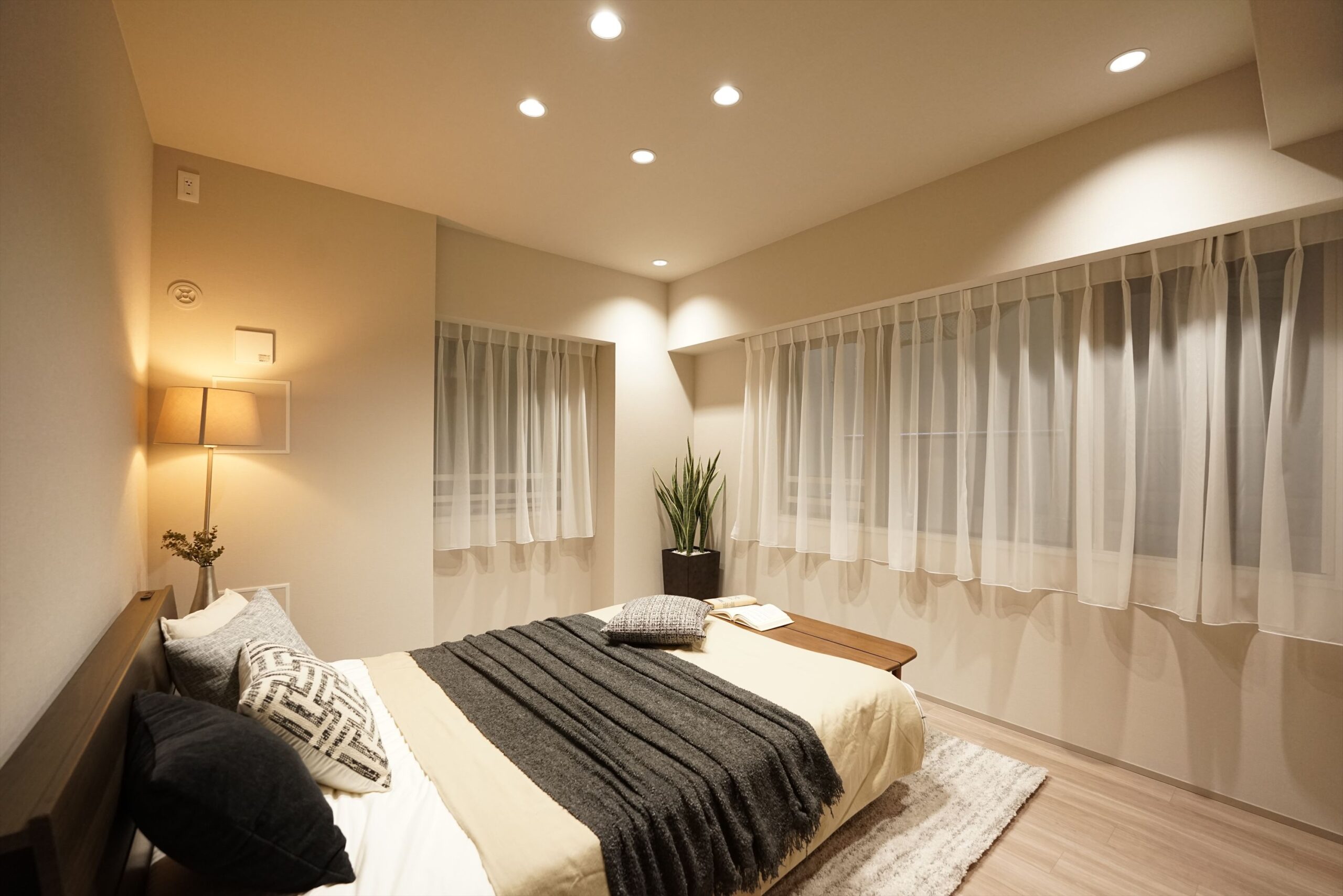 主寝室にもLDKと同様に遠藤照明を採用。時間帯や過ごし方に合わせて光の表情を整えられるため、夜は明るさを落として一日の緊張をほどき、朝は穏やかな光で自然に目覚めを促します。さらに、WICを備え、衣類や季節物をまとめて収められる構成。寝室をすっきり保ちやすく、上質な休息空間を支えます。