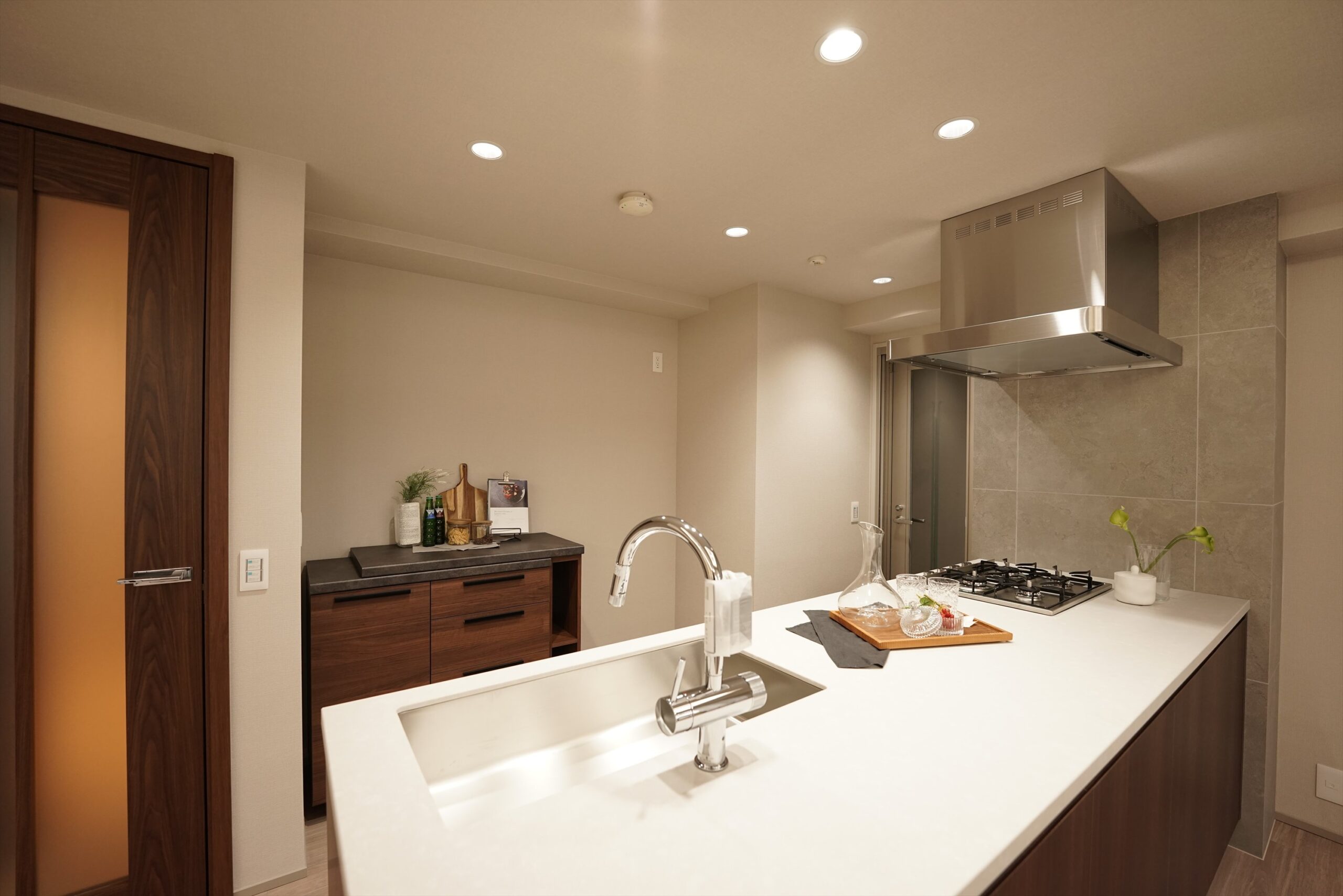 キッチンはKOBESTYLEのオーダーキッチンを採用。空間の主役にふさわしい佇まいが、LDK全体の完成度を高めています。天板にはフィオレストーンを採用し、作業スペースも広く確保できるなど、落ち着いた質感と手入れのしやすさを両立。日常の所作を端正に受け止める素材選びが、住まいの上質感につながります。