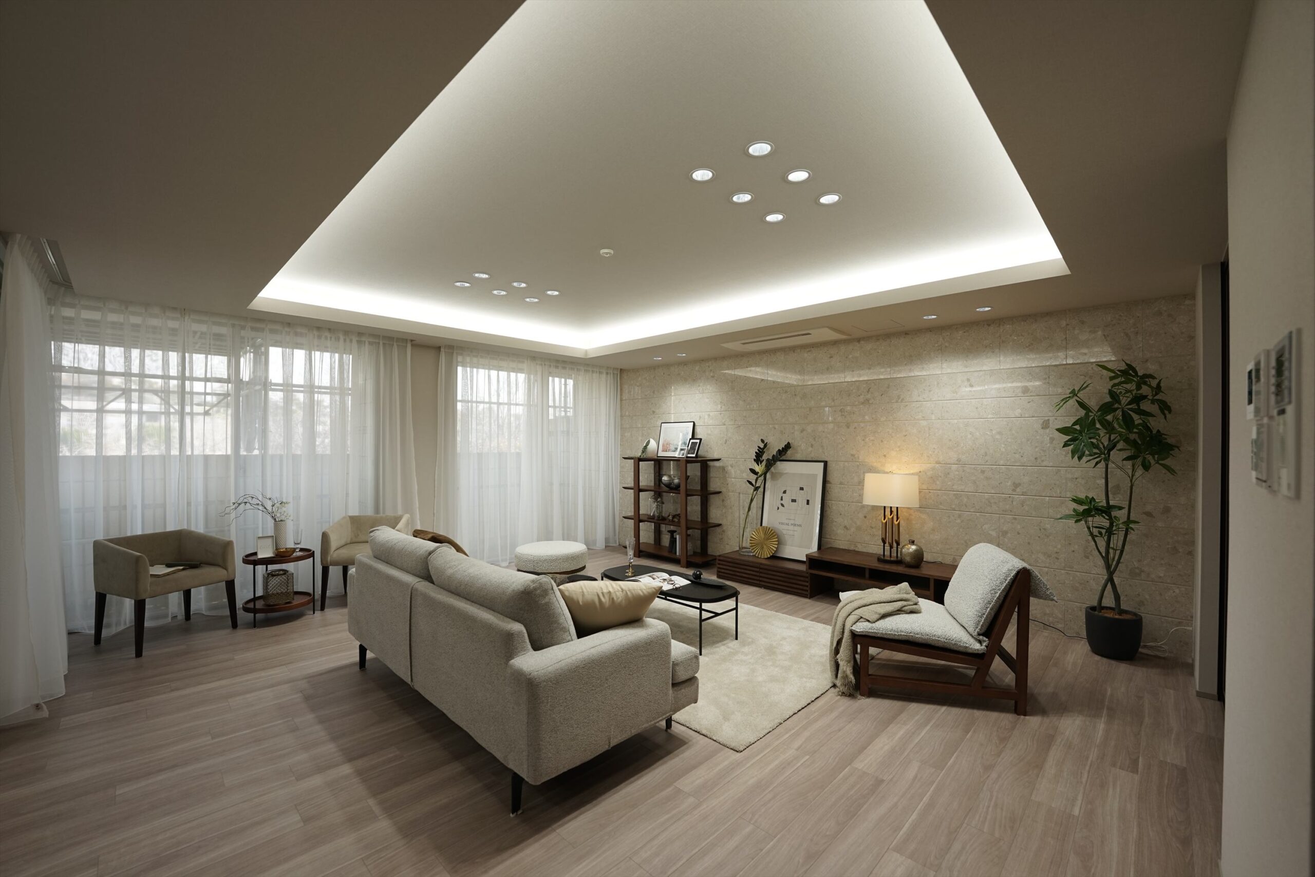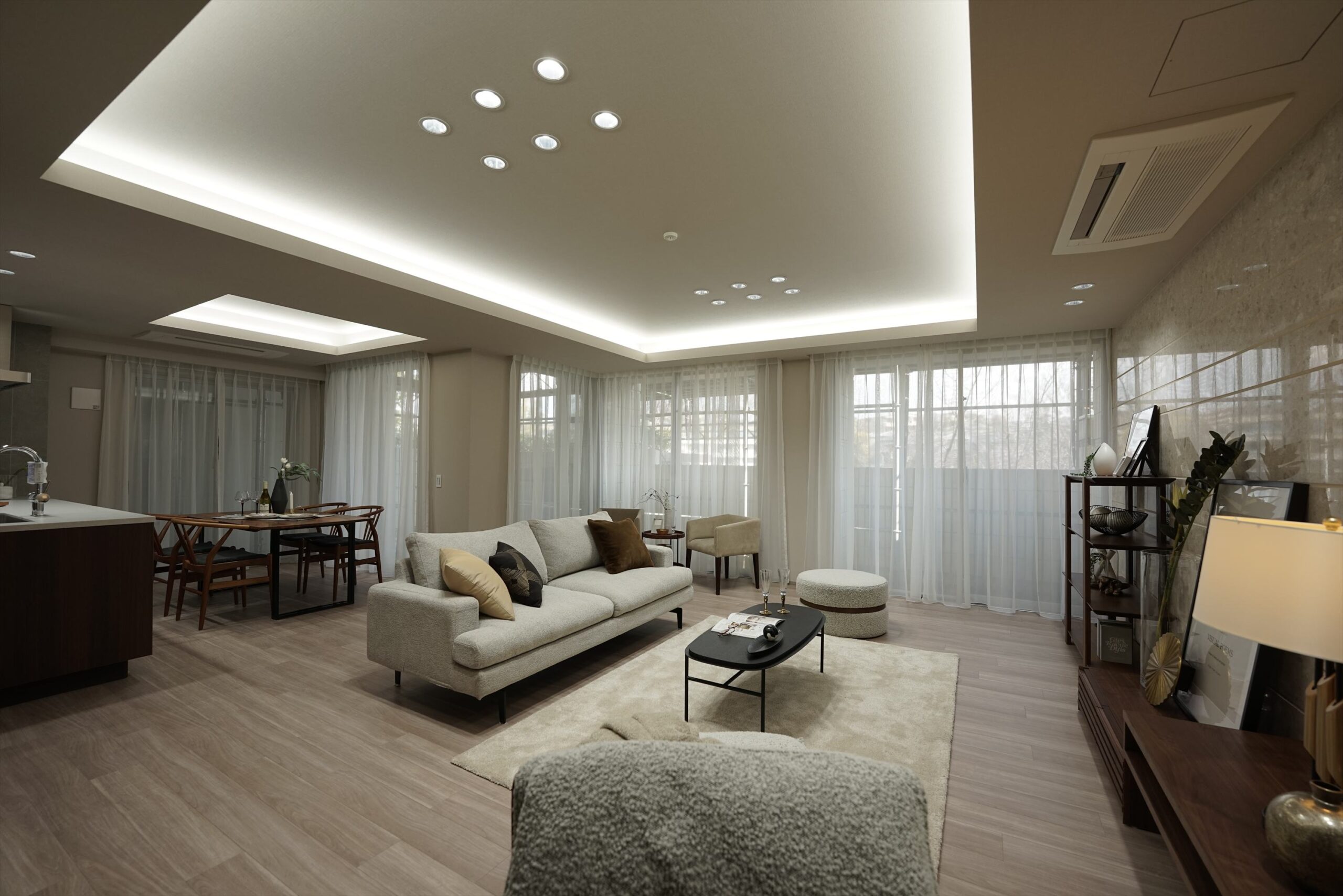 LDKの大きな窓から差し込む、温かな自然光。そこに重なるのが、遠藤照明によるこだわり抜かれた照明計画です。シーンに合わせて色味や明るさを調節でき、食事の時間は落ち着いた灯りで、家族団らんはやわらかく、学習の時間は明るく、同じ空間でも過ごし方に応じて表情を変えられます。部屋からの眺めは自然にあふれ、窓辺に立つだけで視界が潤い、室内にいながら季節の移ろいを感じられる住まいです。