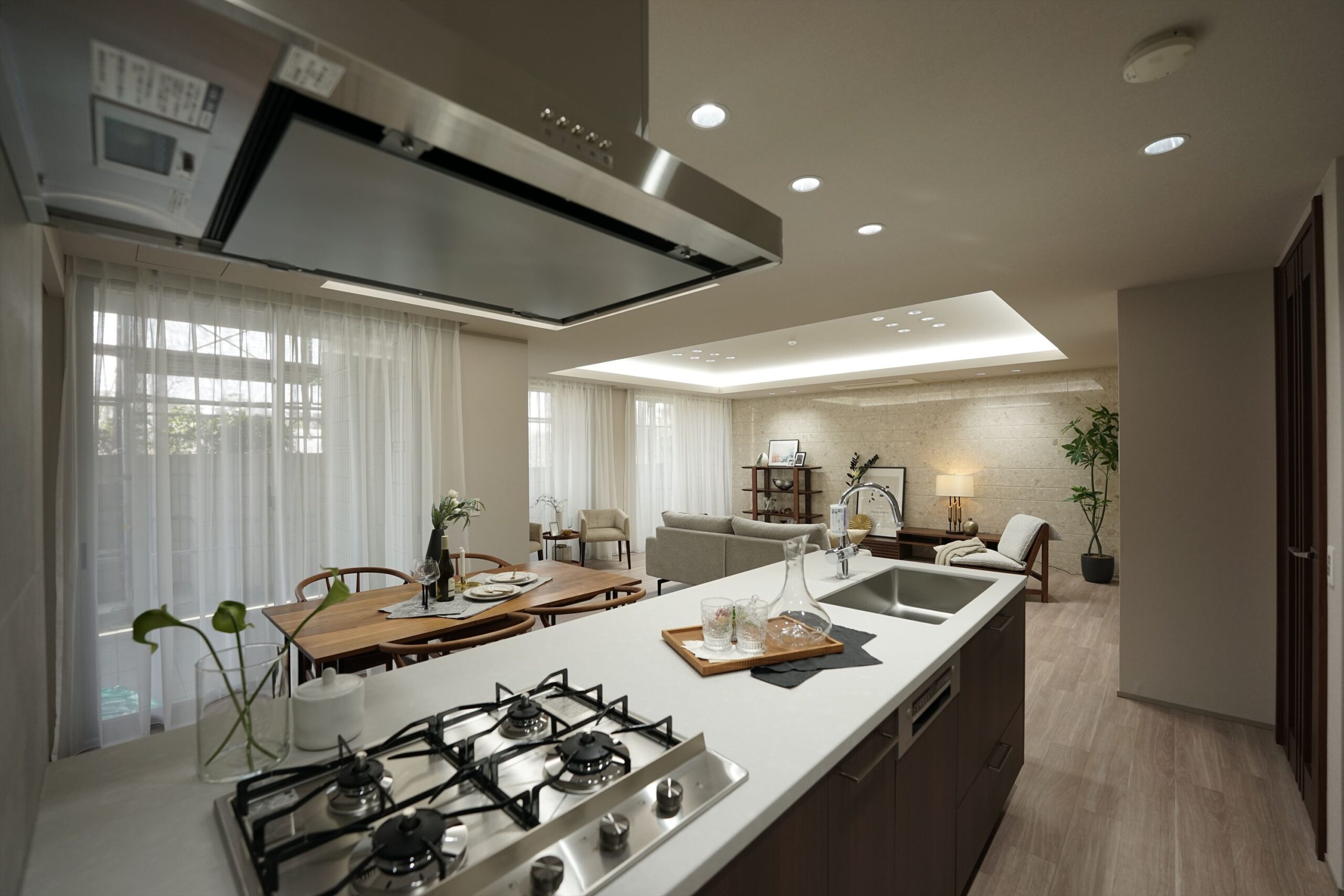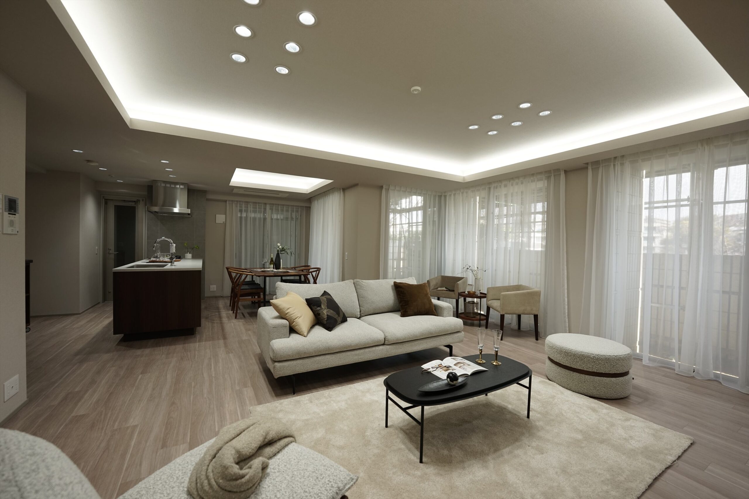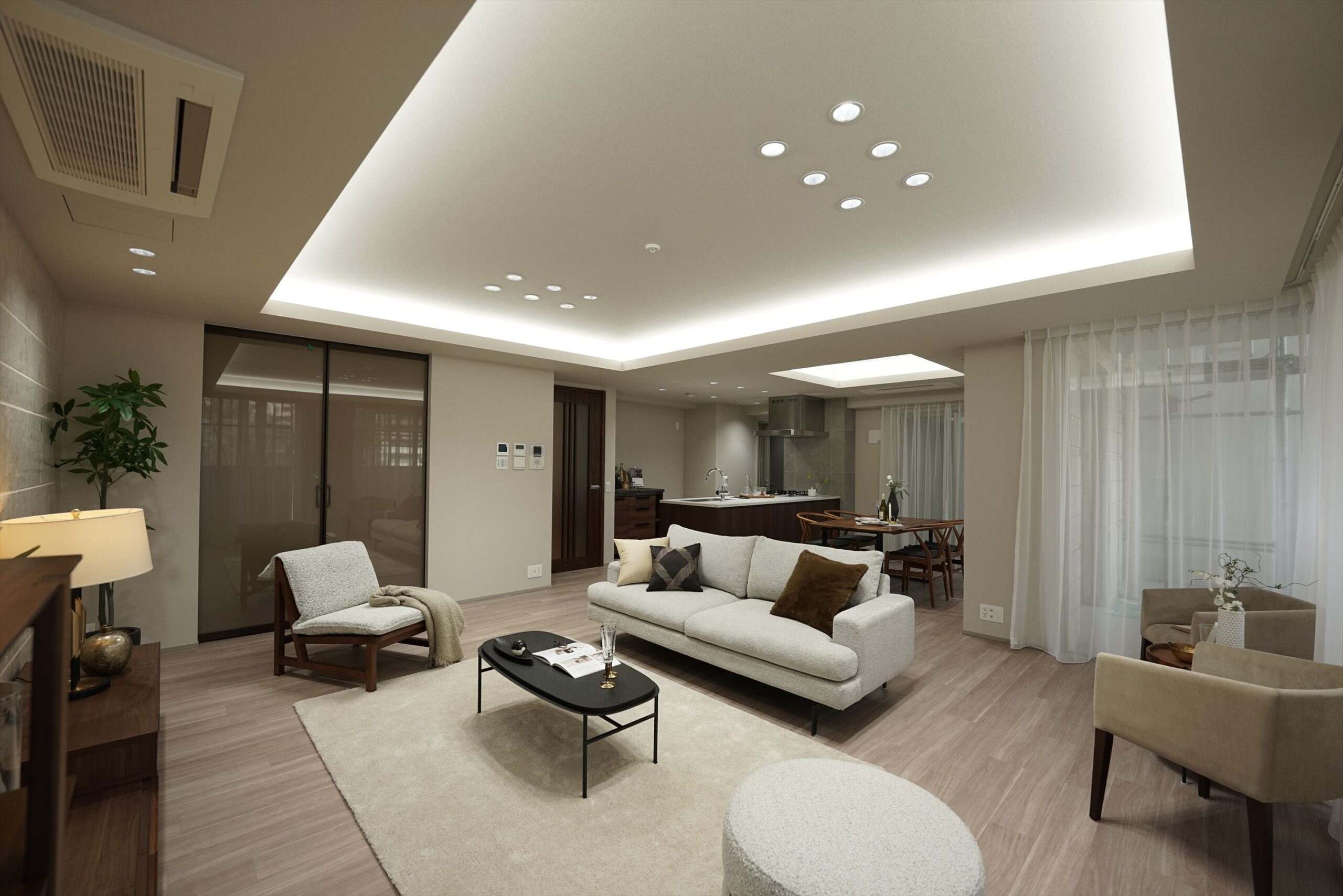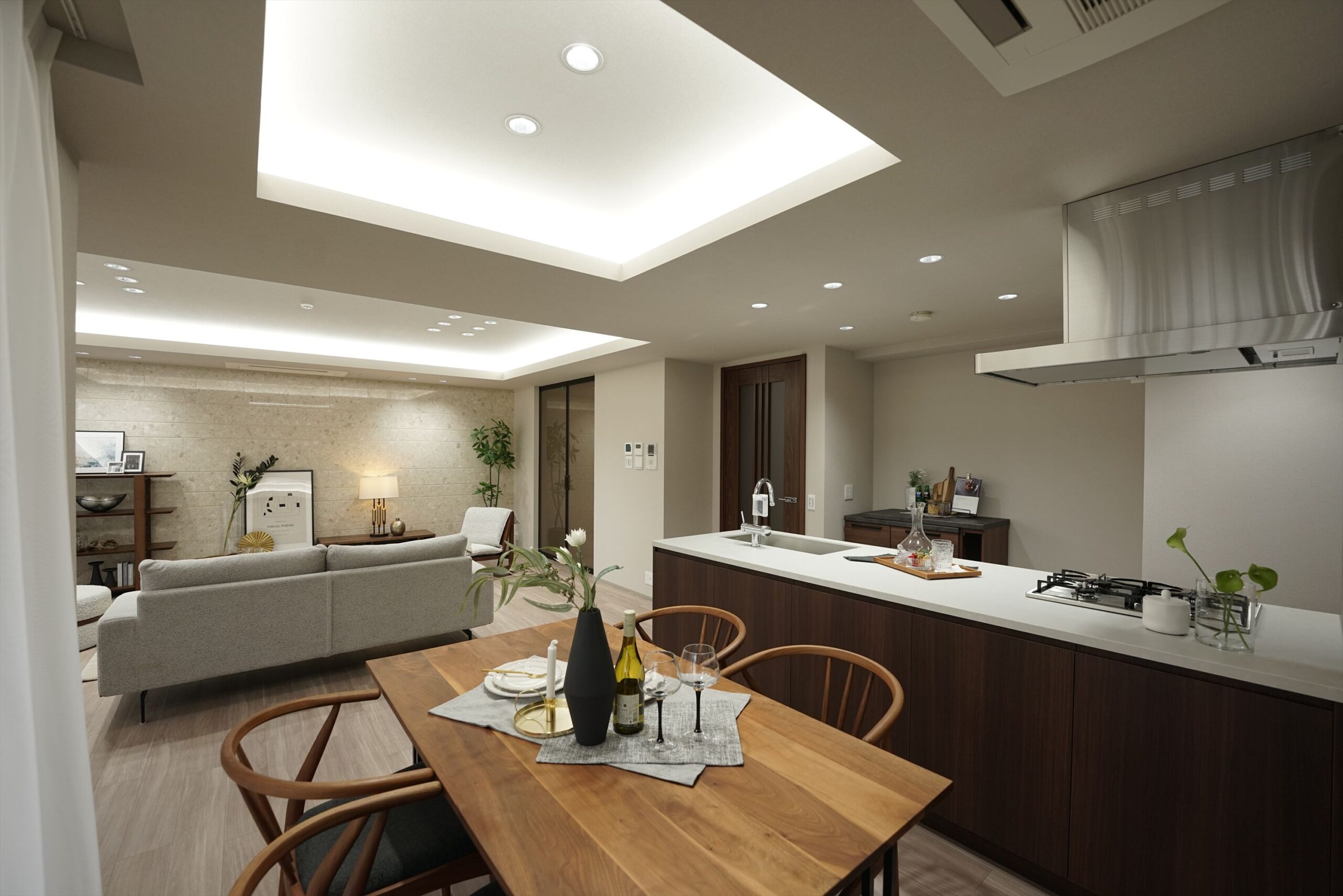 自然光と照明計画が織りなすLDK、オープンキッチンを中心に広がる家族の時間。「プラウド夙川名次町」は、緑の潤いを日常に取り込みながら、住まいの質で毎日を整えていく、夙川・苦楽園エリアならではの一邸です。