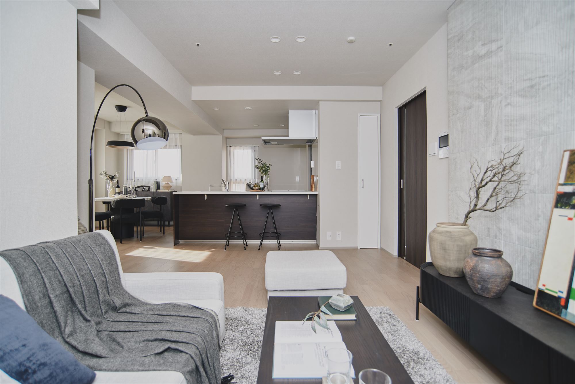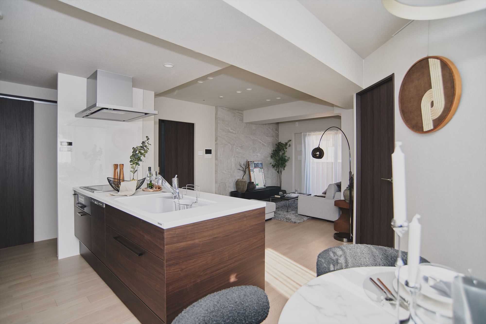 室内の主役は、約20.3帖のLDK。住まいの中心となるLDKを広くすることで、都心立地でありながら、室内ではゆとりと開放感が感じられる計画です。さらに魅力なのが、三方から光が入ること。朝はやわらかな光が室内をすみずみまで照らし、昼は陰影が空間に表情をつくる。季節ごとの光の変化を感じられるのは、京都で暮らす醍醐味のひとつです。