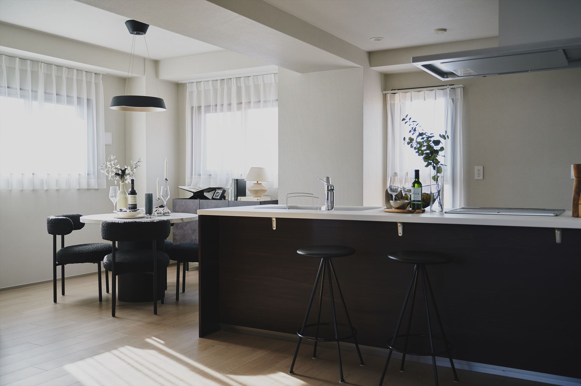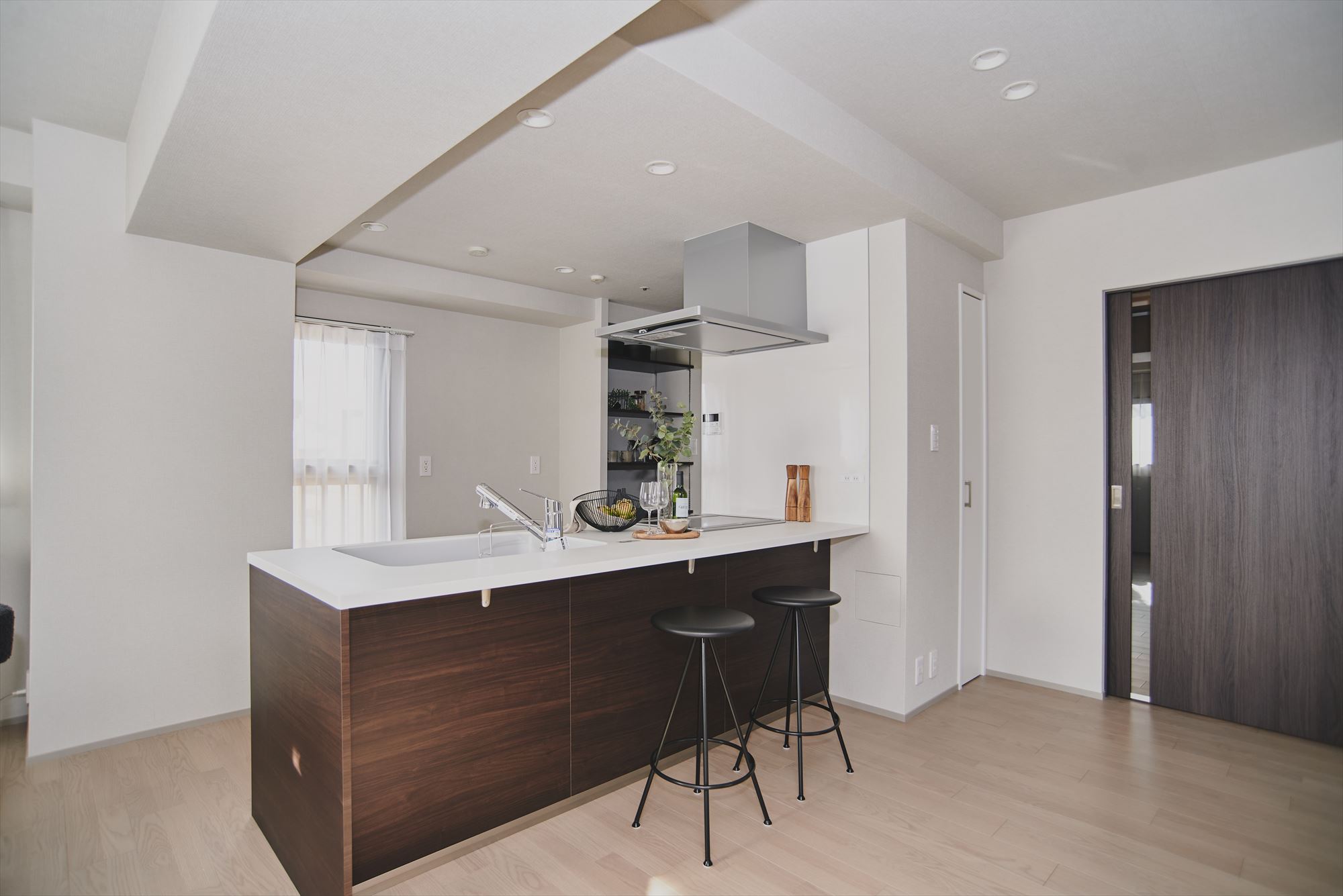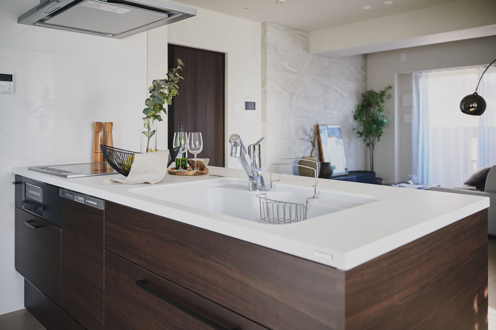 ペニンシュラ型のキッチンにはテノールカウンターを採用。作業のしやすさだけでなく、手元の質感が空間全体の印象を引き締め、日常の所作を少しだけ丁寧にしてくれます。
