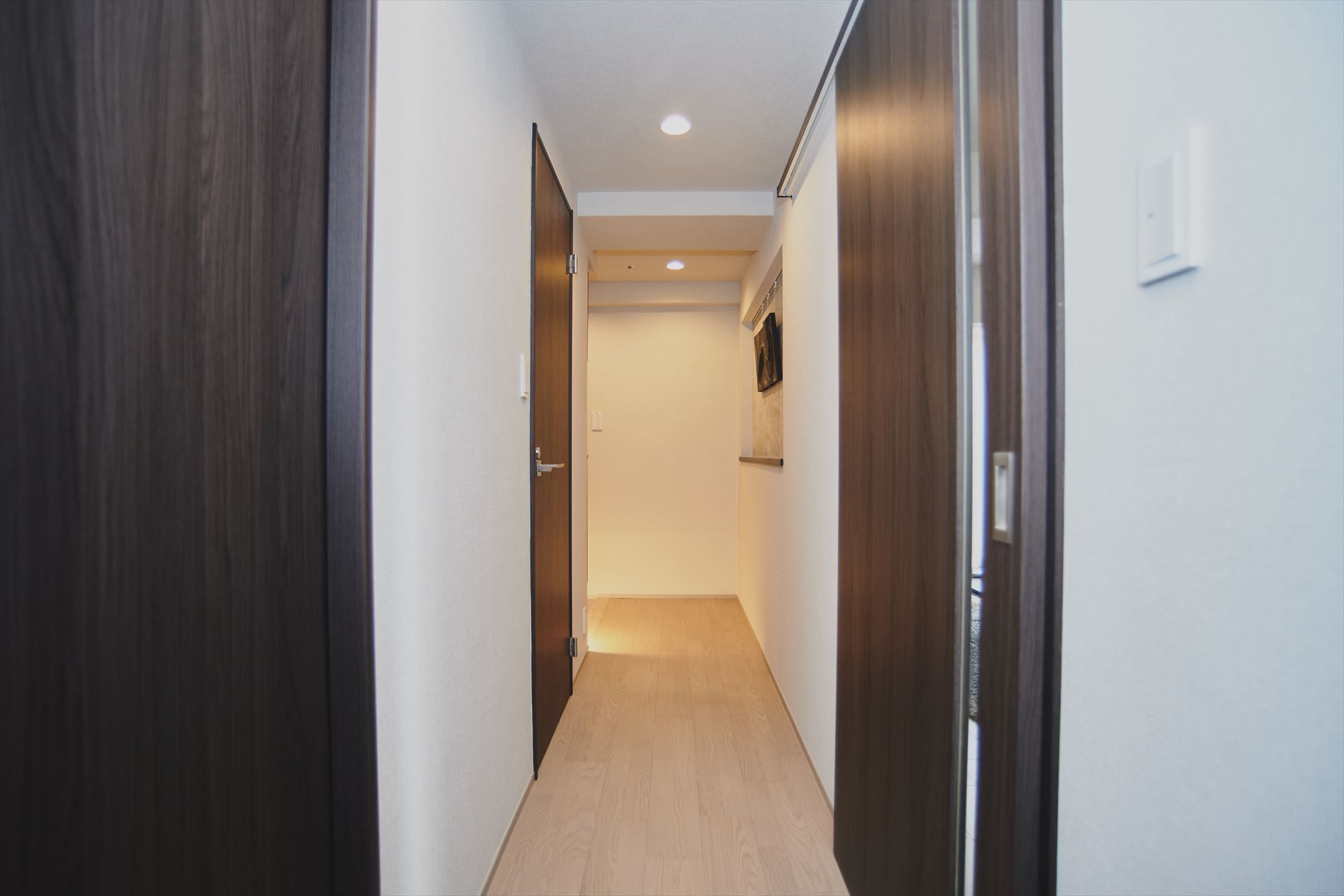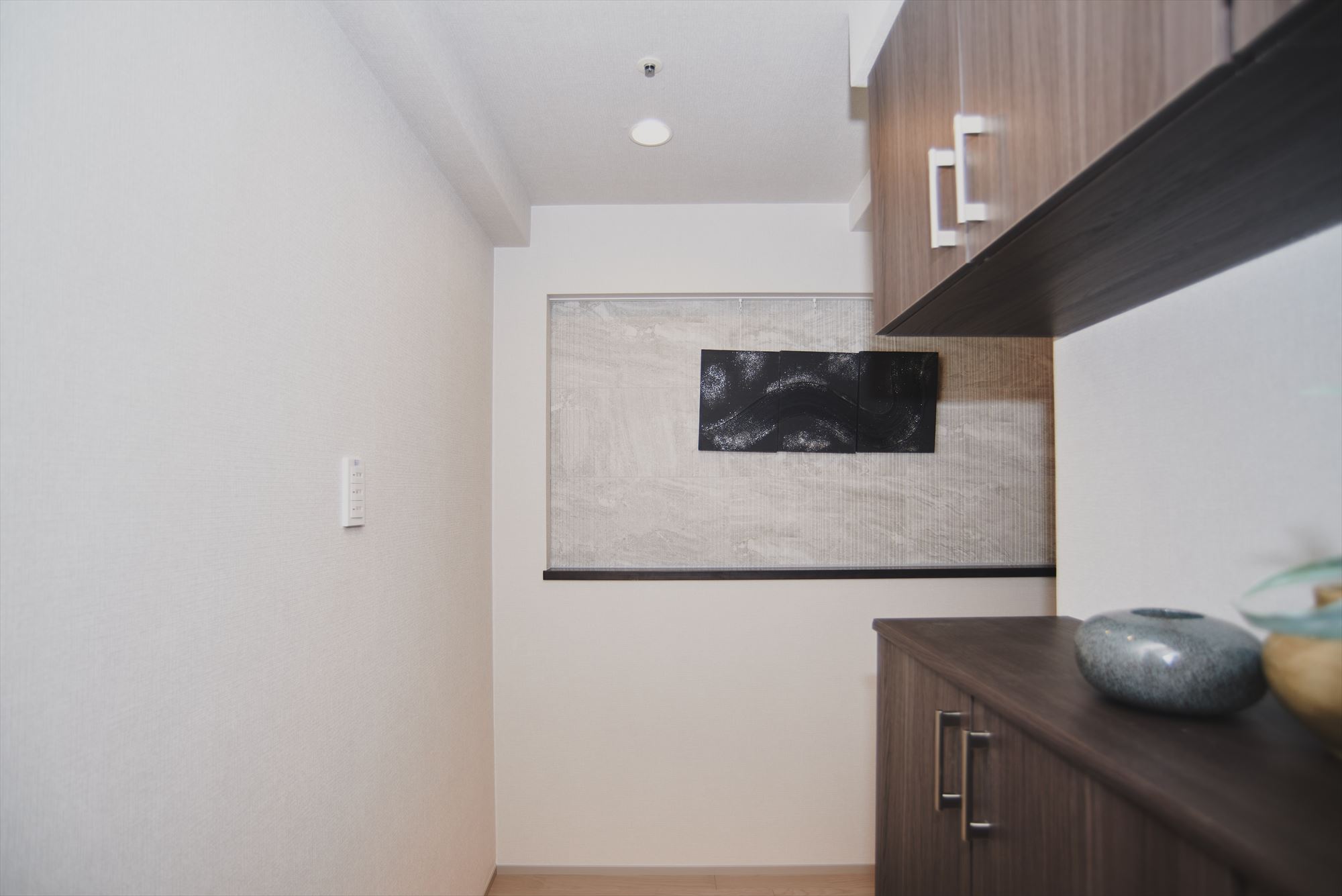 家の顔となる玄関正面に設けたニッチカウンターは、壁面にタイルを貼ることでアクセントを加えています。ピクチャーレールを設置しているため、お気に入りの絵画やアートを気軽に飾っていただけます。