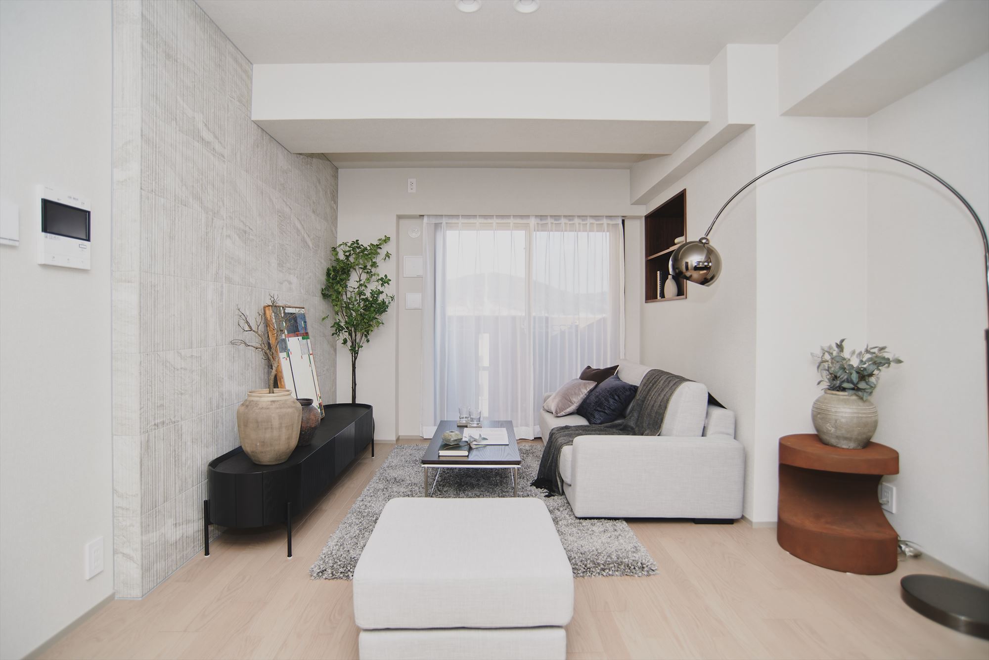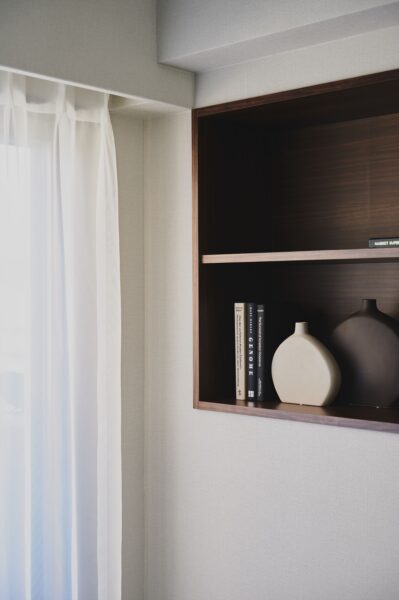 リビングに設置された飾り棚は、本棚として活用したり、趣味のアイテムをディスプレイしたりするのにぴったりのサイズです。収納と見せる楽しさを兼ね備えた実用的なスペースです。
