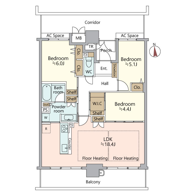 ゆとりある3LDKを、さらに暮らしやすくするのが収納計画。各居室に収納を備え、加えてファミリークローゼットとなるWICも確保。買い置きや日用品、季節ごとのお布団などの置き場があるだけで、居室や廊下に物があふれにくくなります。