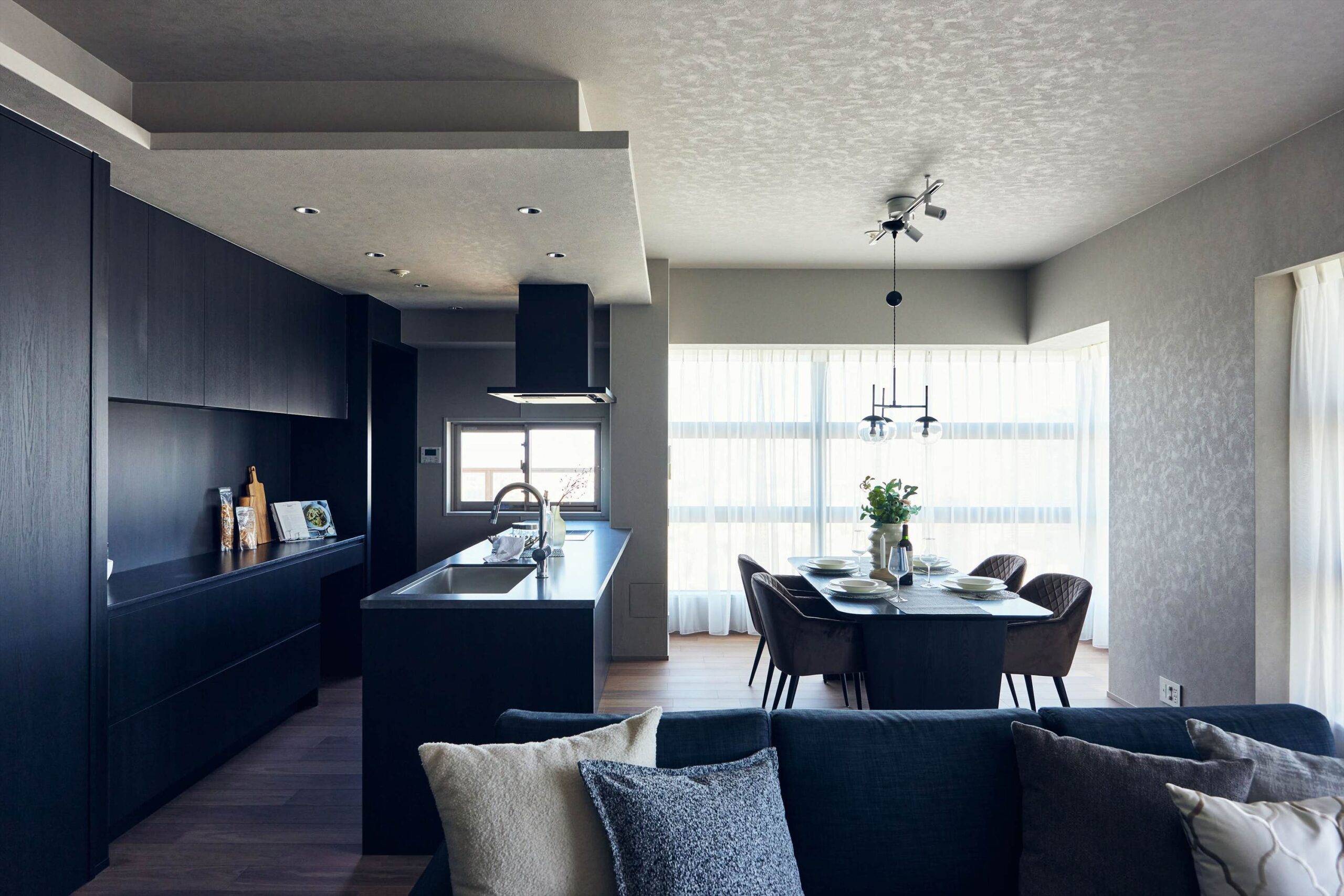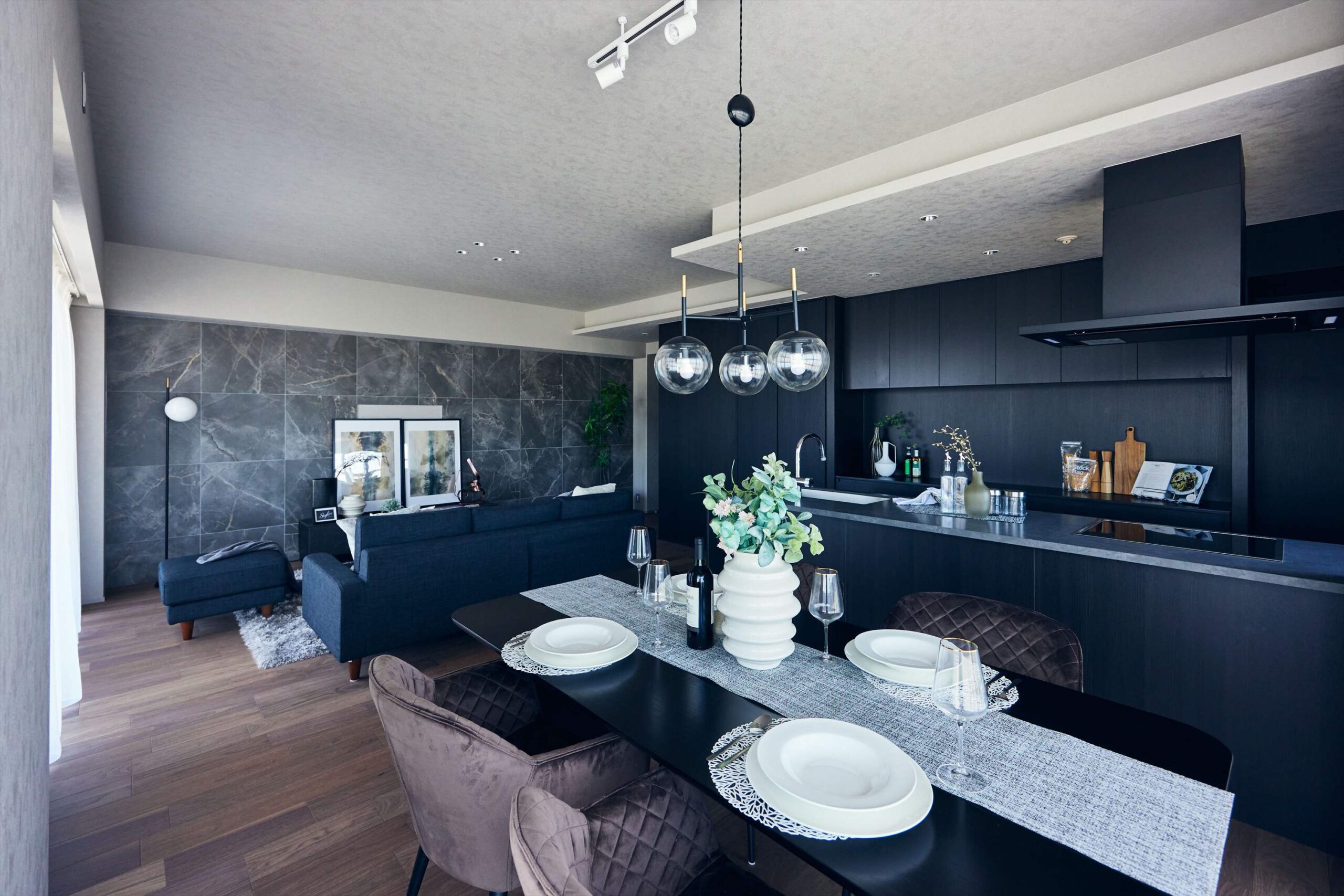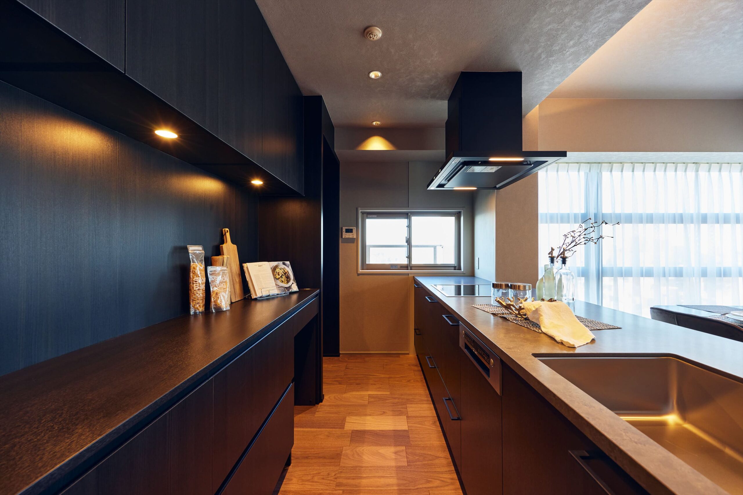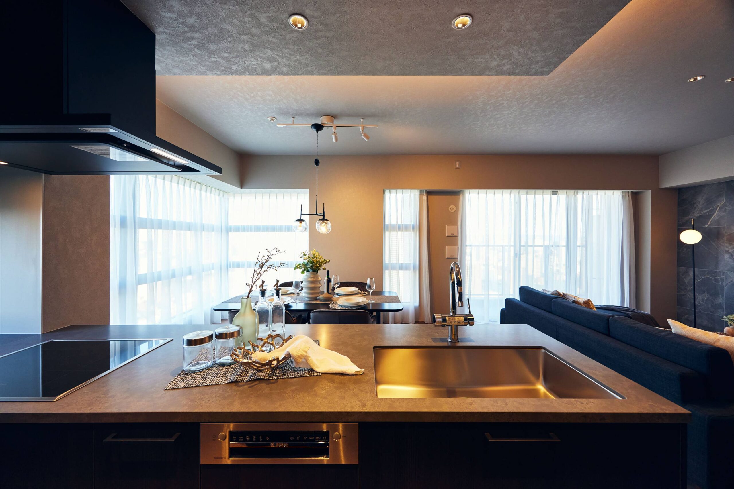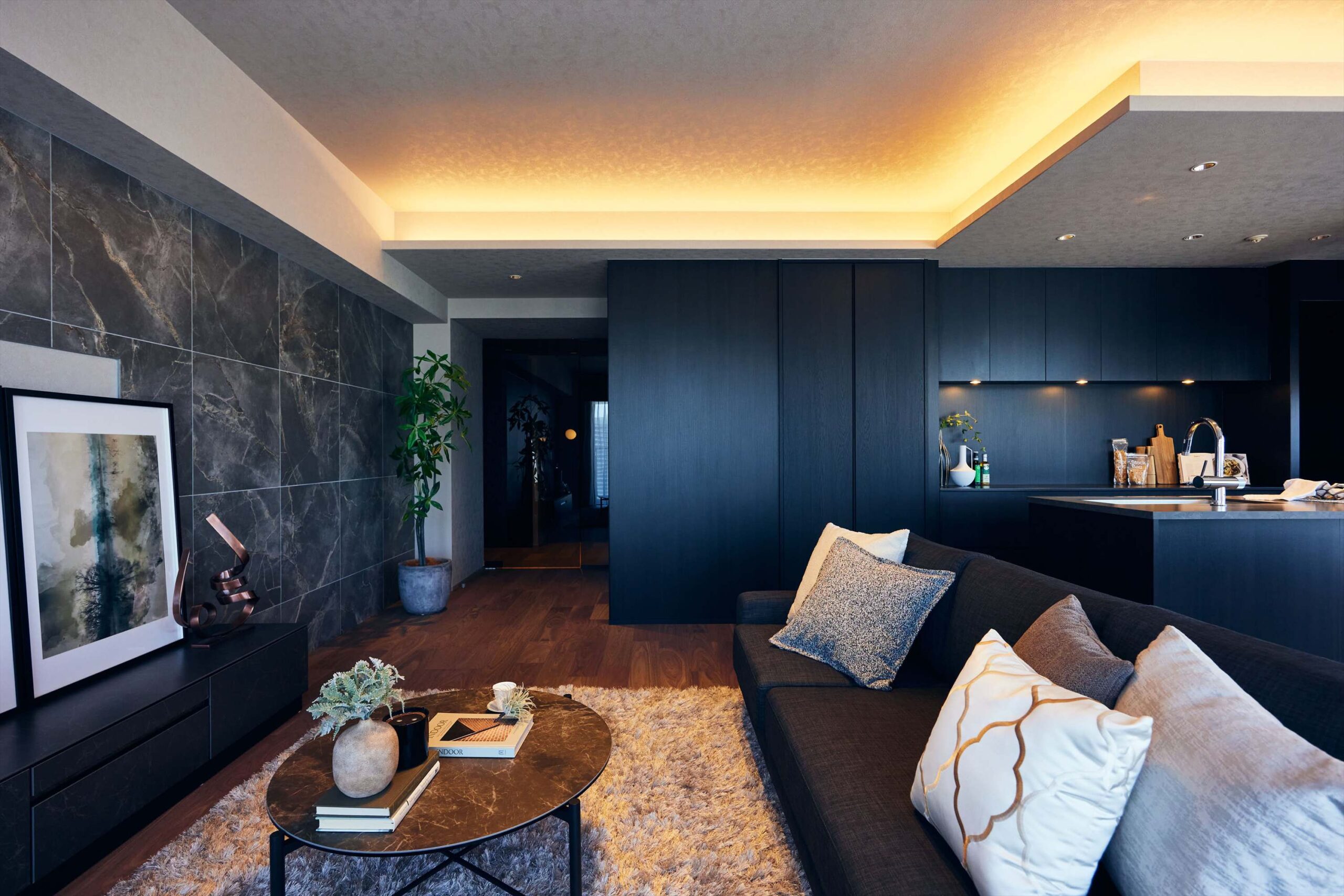 住まいの中心となるのは、約25帖を超えるLDK。ゆとりある面積が、家具配置の自由度と居場所の幅を生み出します。また、空間は落ち着いたトーンで整えられ、上質さを過度に主張しない「静かな洗練」が基調。キッチンは壁面収納まで統一感のある意匠でまとめられ、人造大理石カウンターの端正な質感が空間に品格を添えます。