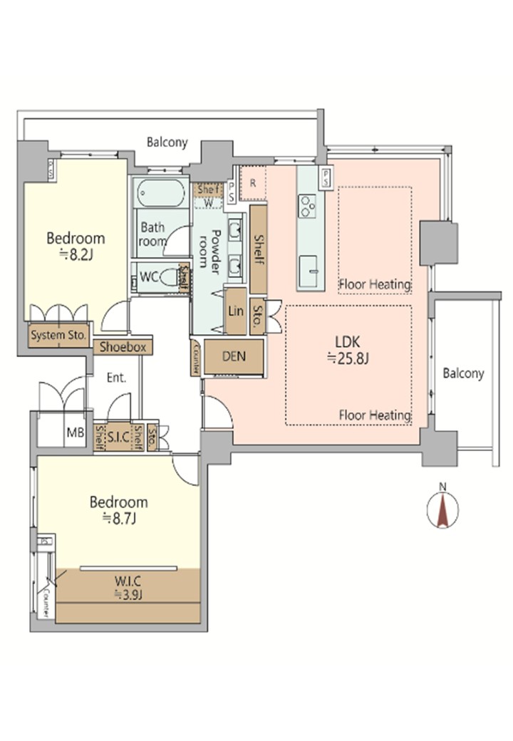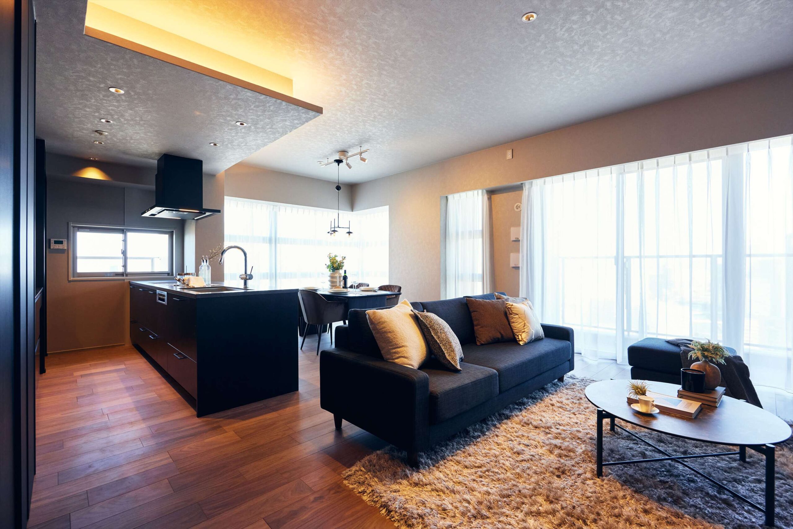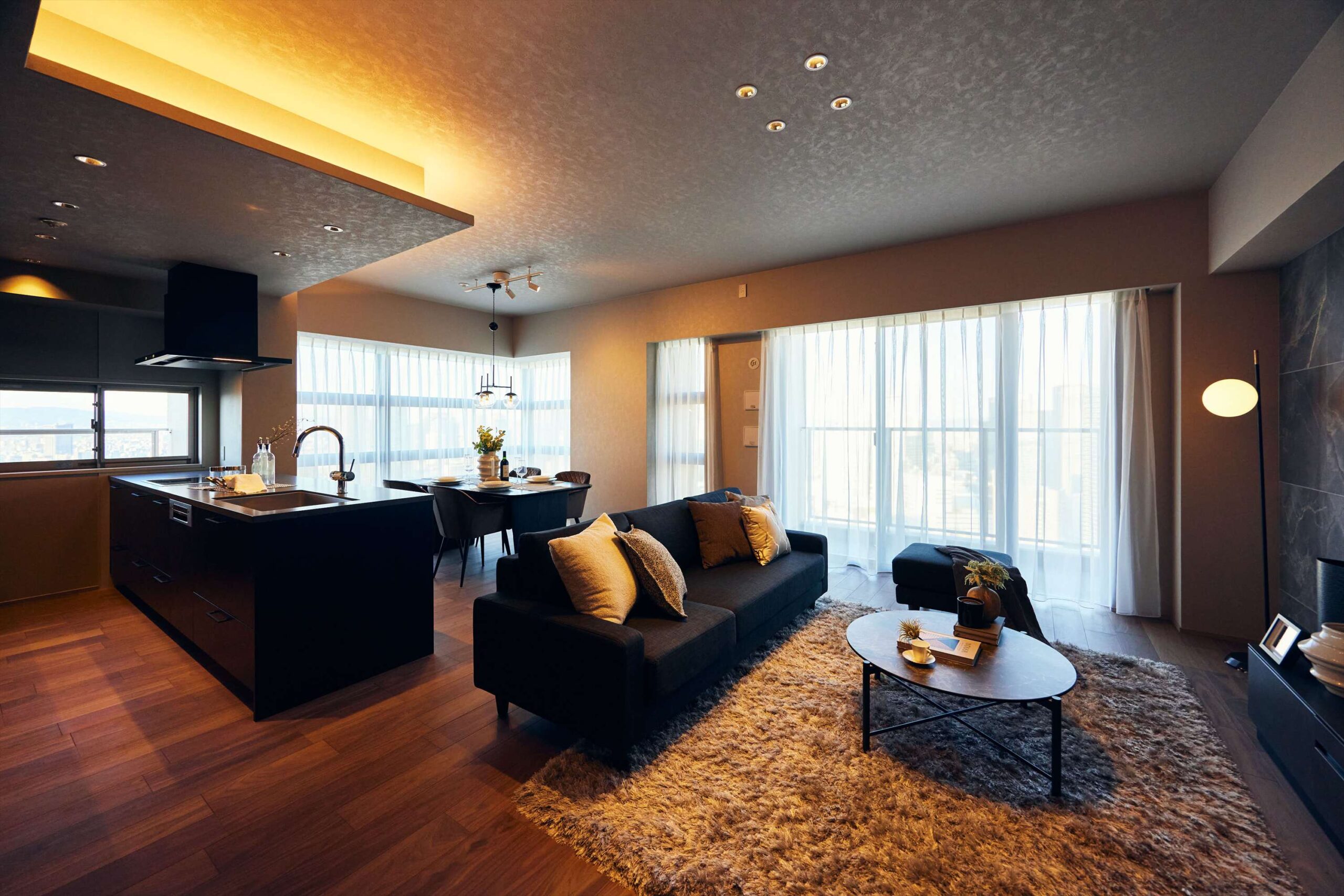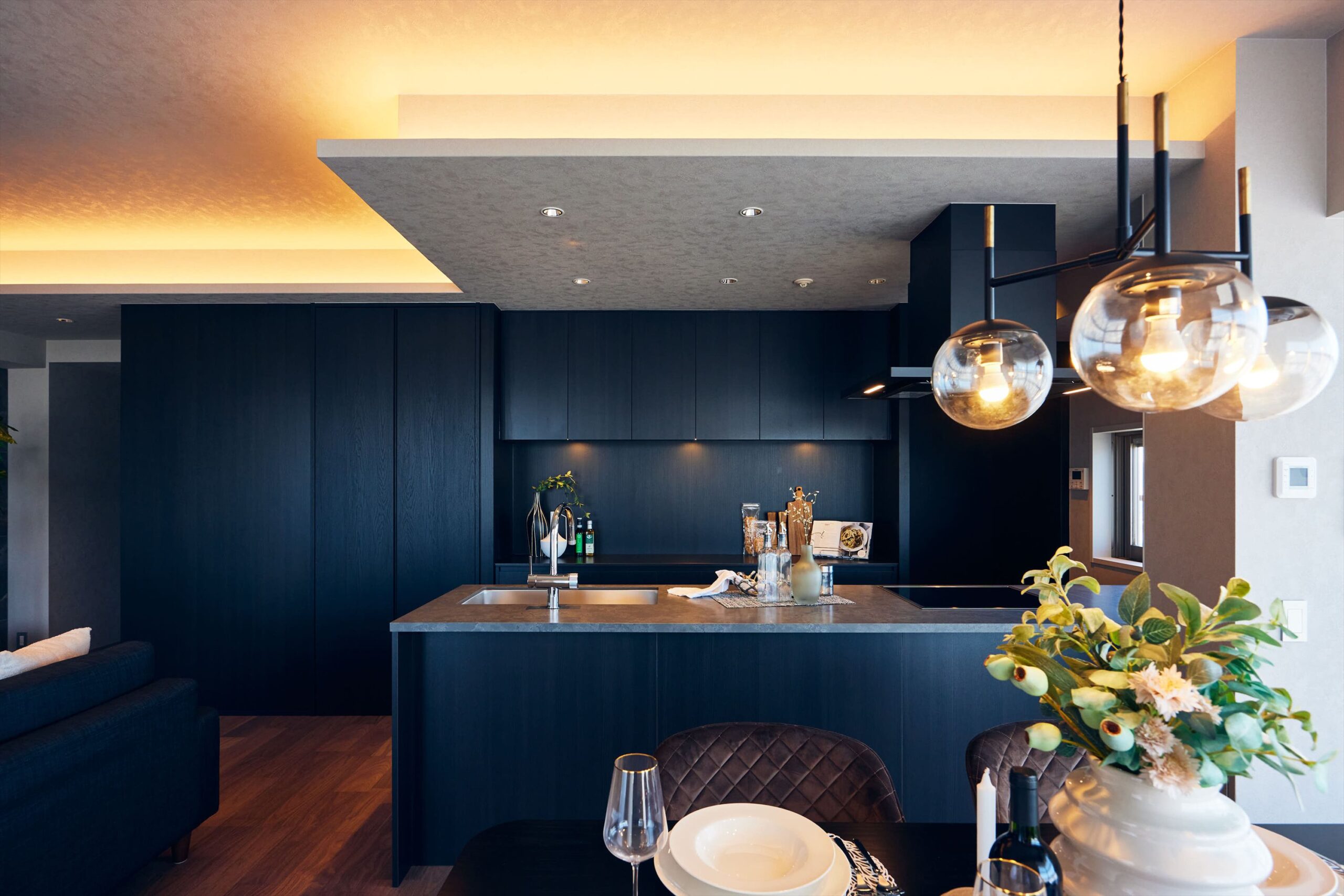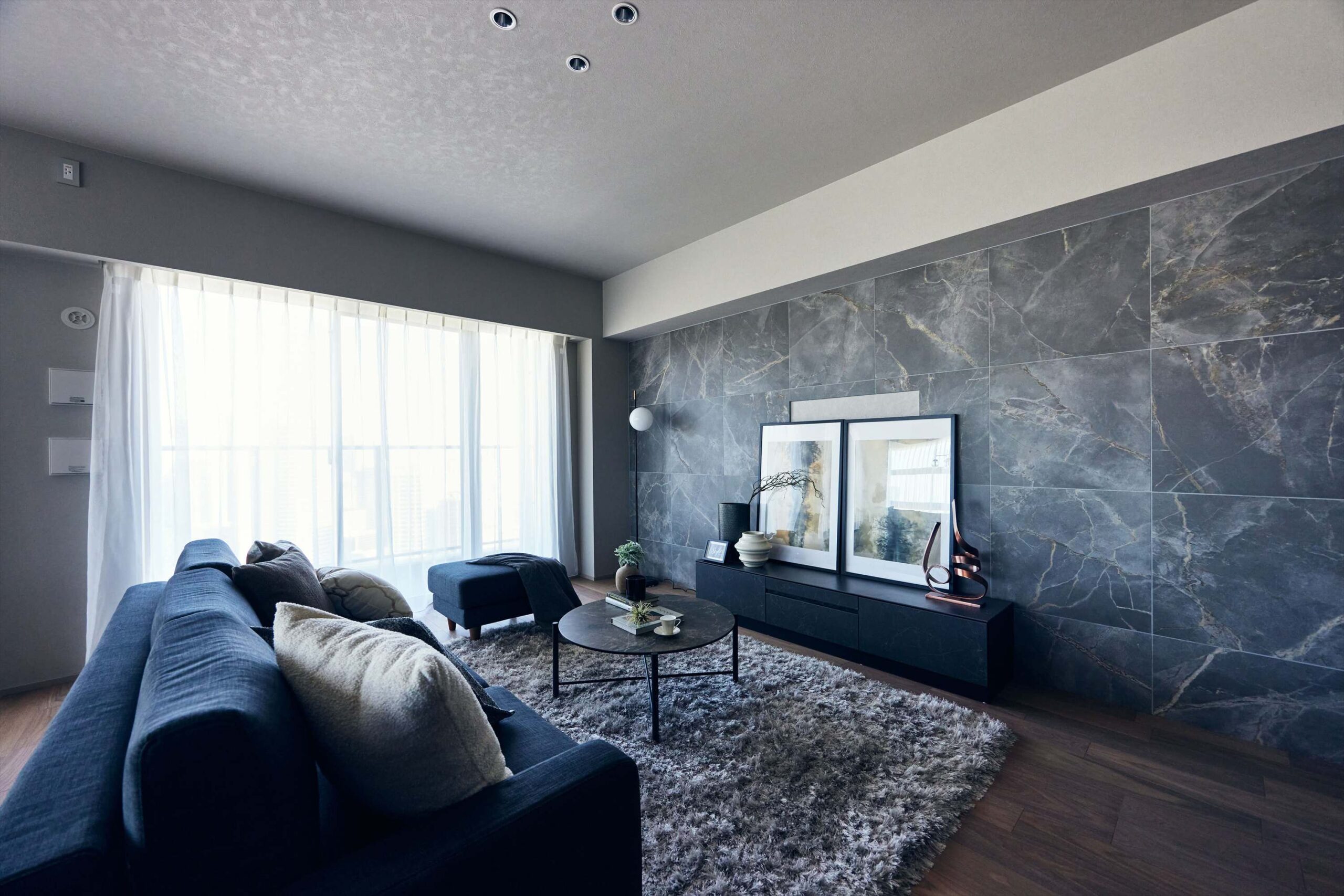 住まいの中心となるのは、約25帖を超えるLDK。ゆとりある面積が、家具配置の自由度と居場所の幅を生み出します。また、空間は落ち着いたトーンで整えられ、上質さを過度に主張しない「静かな洗練」が基調。キッチンは壁面収納まで統一感のある意匠でまとめられ、人造大理石カウンターの端正な質感が空間に品格を添えます。
