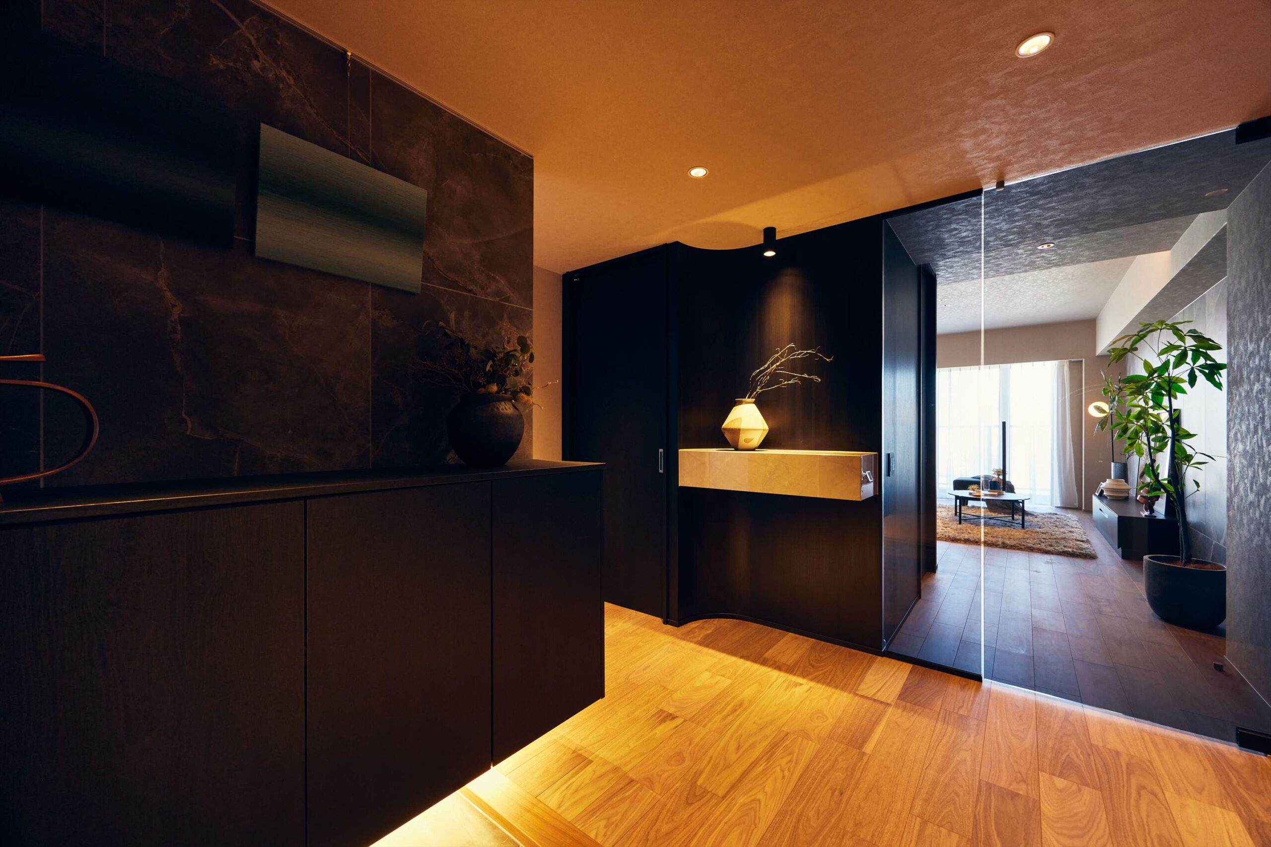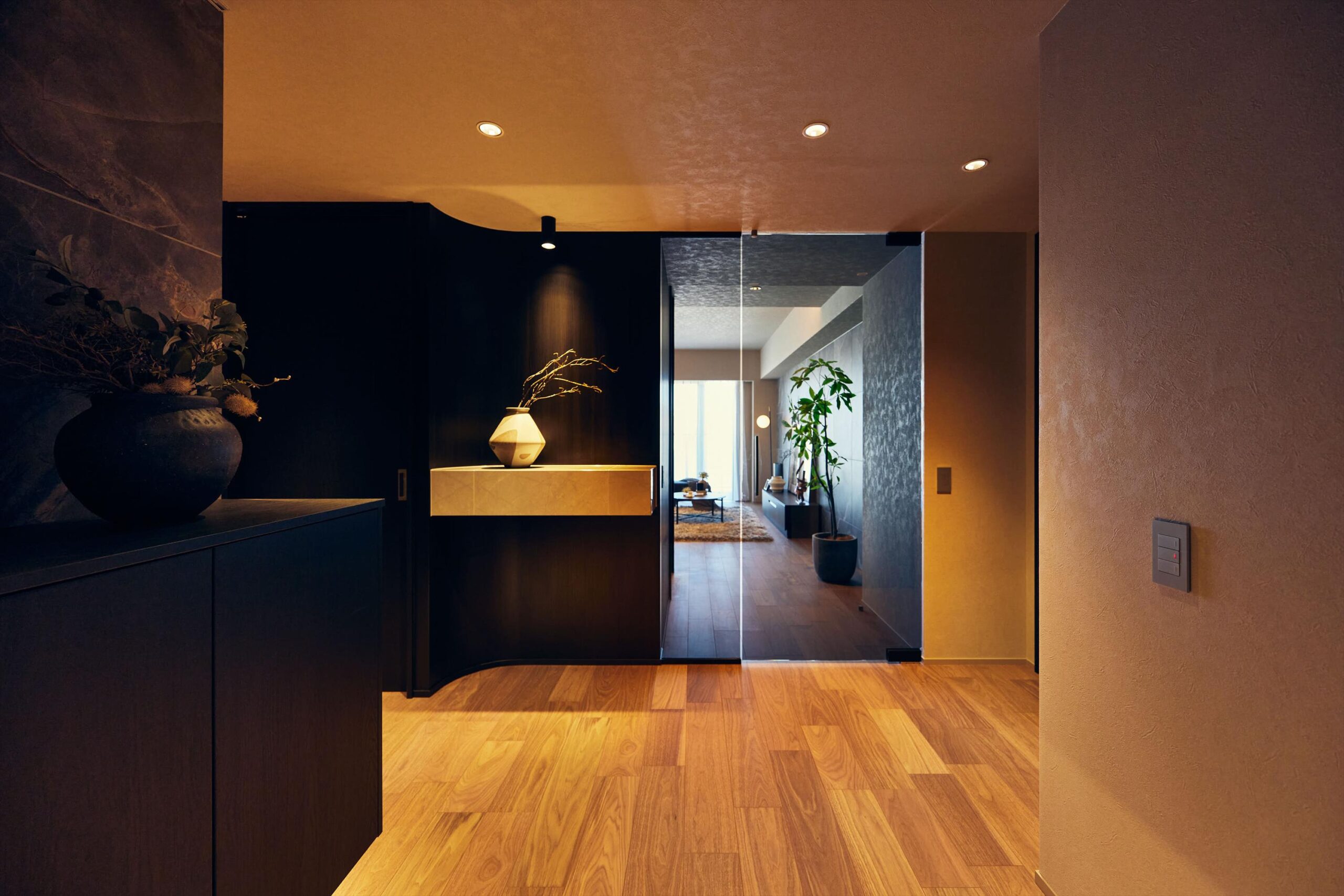 ガラス建具越しに眺望が広がる開放的なエントランスホールは、自然光が差し込む明るさと季節を彩る設え。大切なゲストをお迎えする際にも住まい手の美意識と品格が伝わる、洗練された空間です。