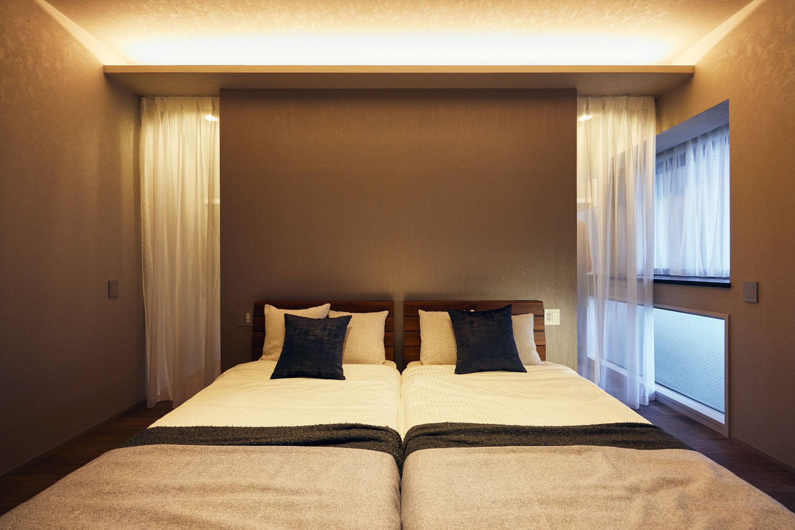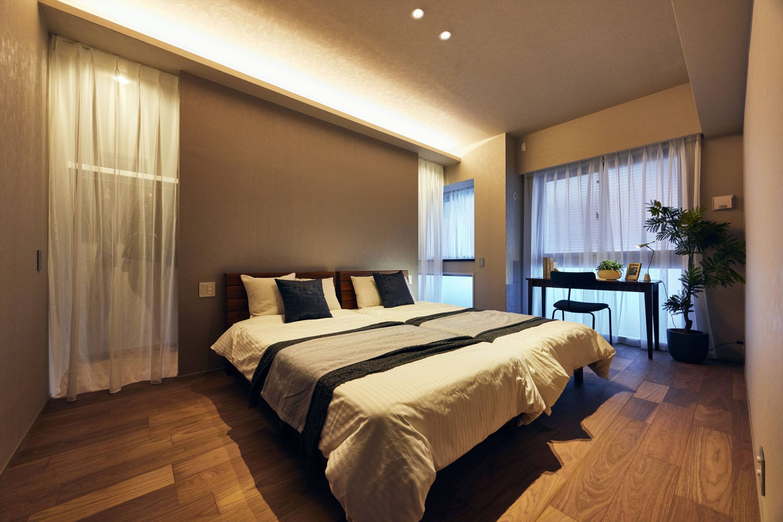 一日の終わりに、落ち着いた雰囲気と静謐な空気が迎える主寝室。心身ともに深く休まり、明日への英気を養う、寛ぎの空間です。