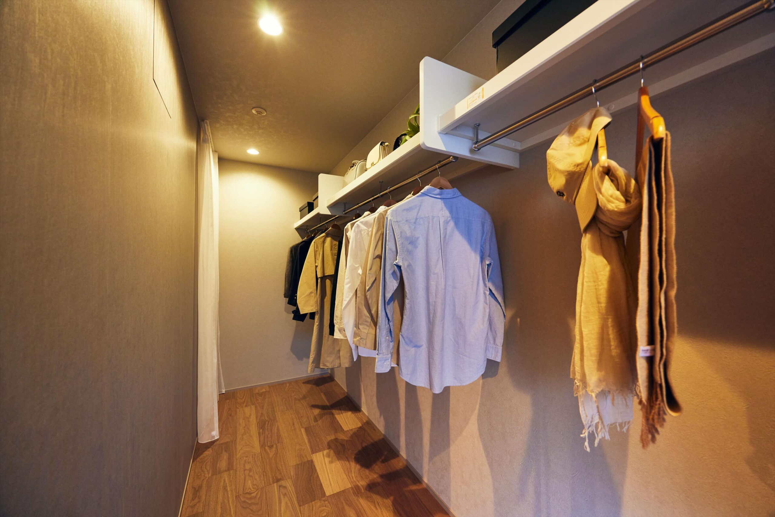 また、主寝室からカーテンで緩やかに仕切られたウォークインクローゼットは、朝の身支度がスムーズになる快適な動線と、ゆとりの収納力で、美しい暮らしを支える機能的な空間です。