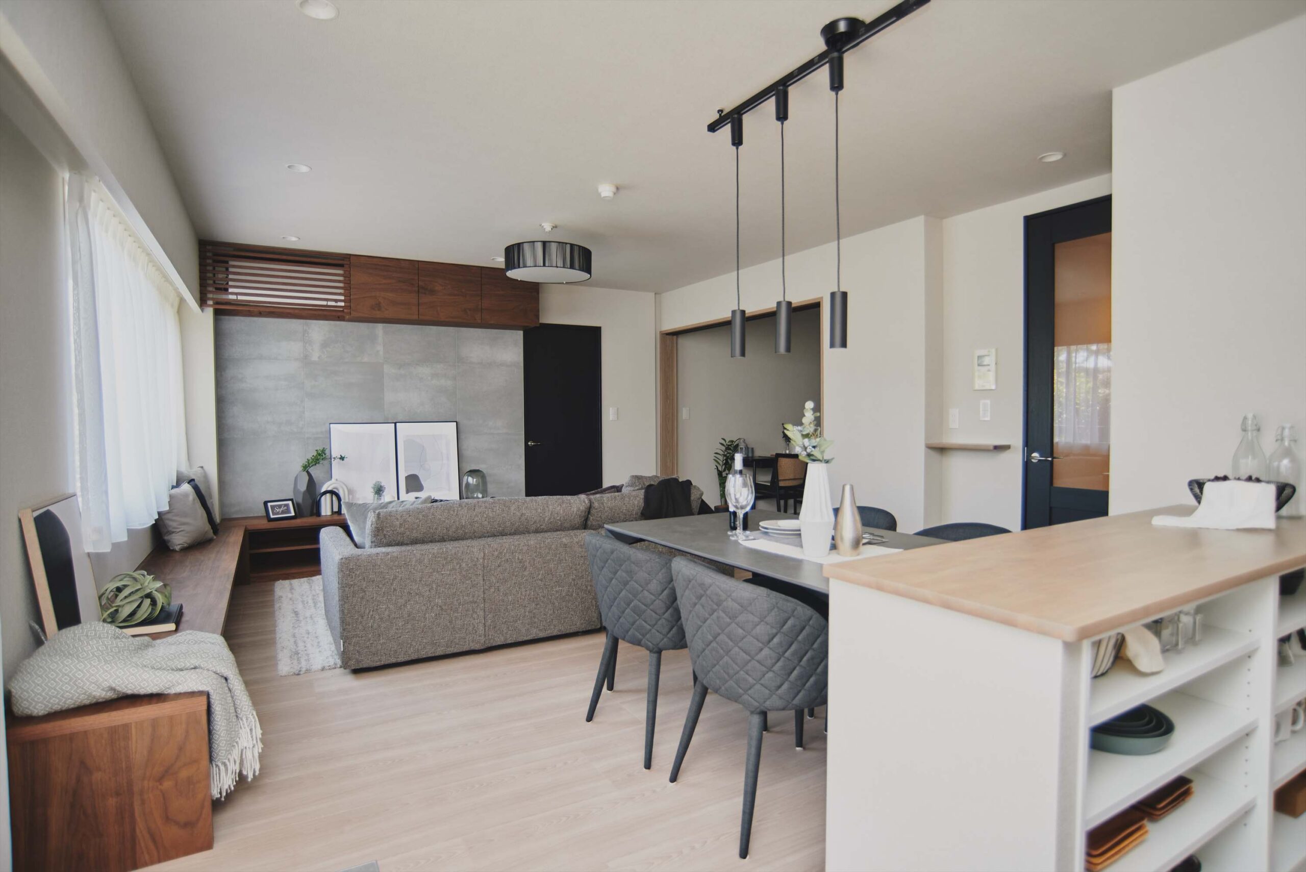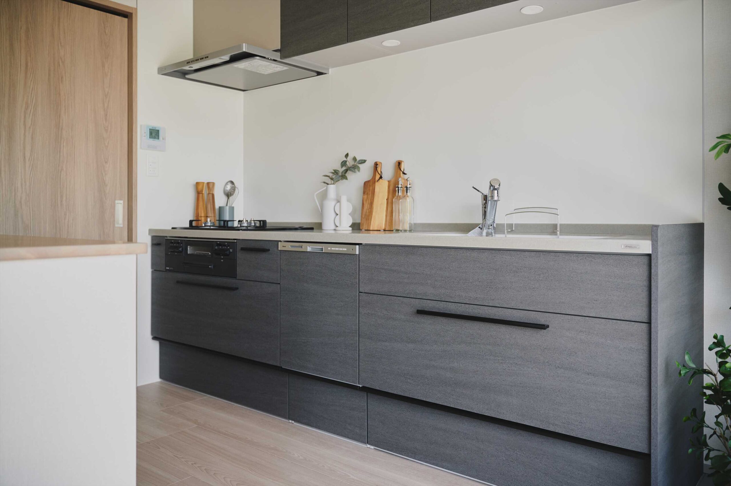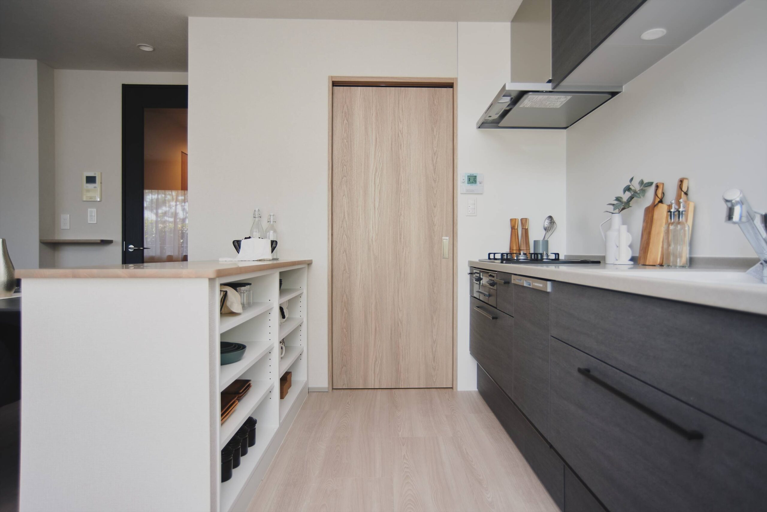 キッチンには、作業台に便利なカウンターを設けました。カウンター下部は日常使いの食器収納に便利なオープン収納となっており、調理・配膳・片付けの流れがスムーズで、家事の“詰まり”を減らしてくれます。さらに、暮らしを支えるのが大型パントリー。食品ストックや調理家電、日用品までまとめてしまえると、キッチンまわりの生活感が出にくく、LDKの空気はいつもすっきり。ネットショッピングでまとめ買いをしても、片付けがあっという間に終わる。そんな小さな快適さが積み重なります。