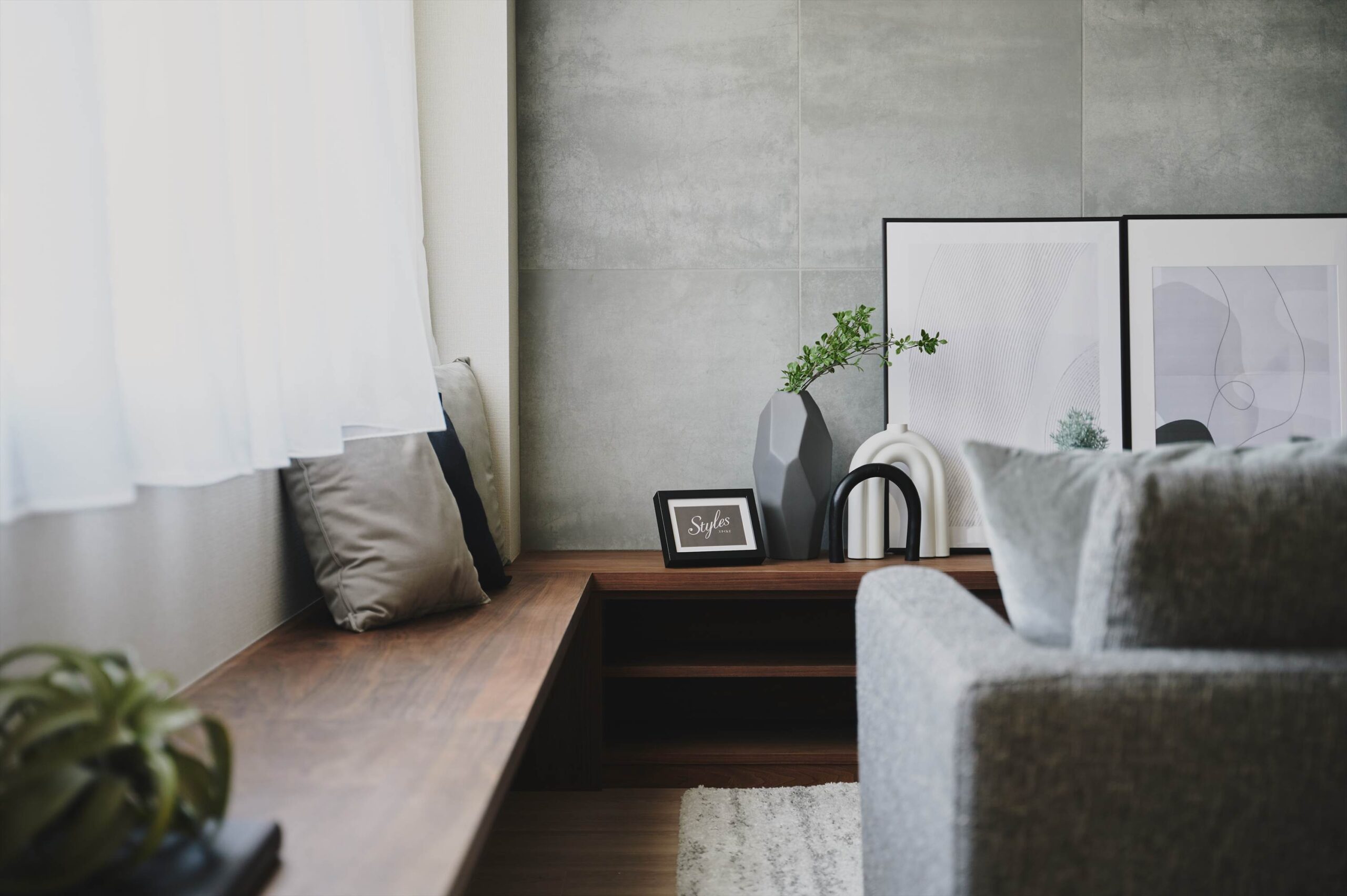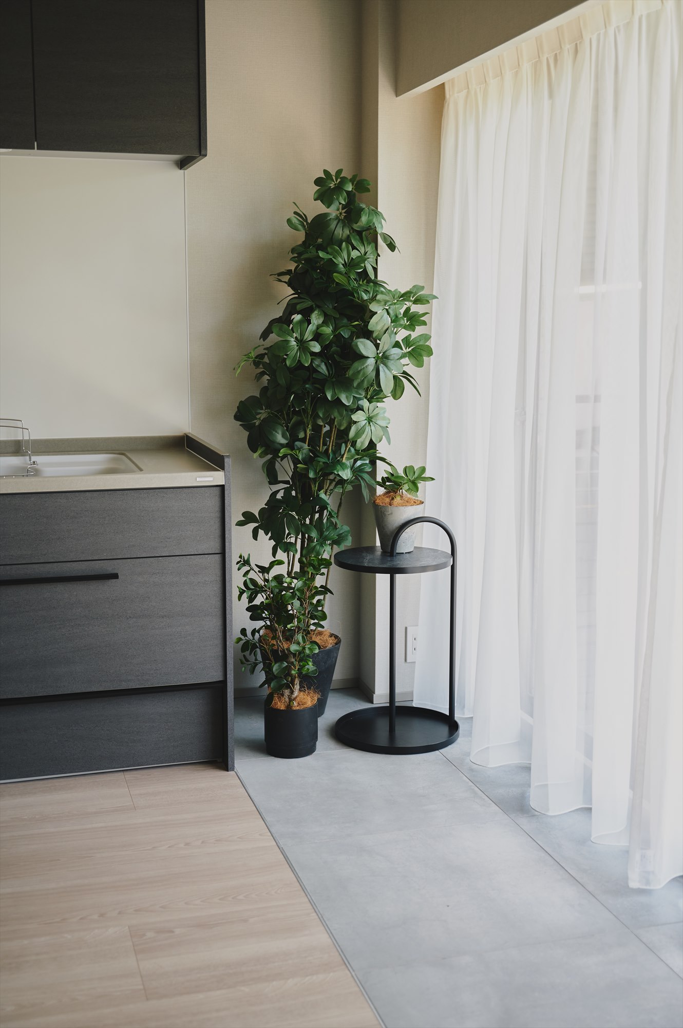 リビングダイニングの窓辺には「くれ縁」を思わせるタイル貼りの空間を。水がかりが気にならないので、グリーンを並べて小さな植物コーナーにしたり、季節の花を飾って室内に彩りを足したり。日がよく当たる窓辺は観葉植物を育てるのにもぴったりです。さらにリビングには、テレビボードと一体のベンチを計画しました。天気の良い日は窓辺で読書をしたり、友人を招いたホームパーティでは自然とリビングに人が集まったりと居心地の良さを実感します。