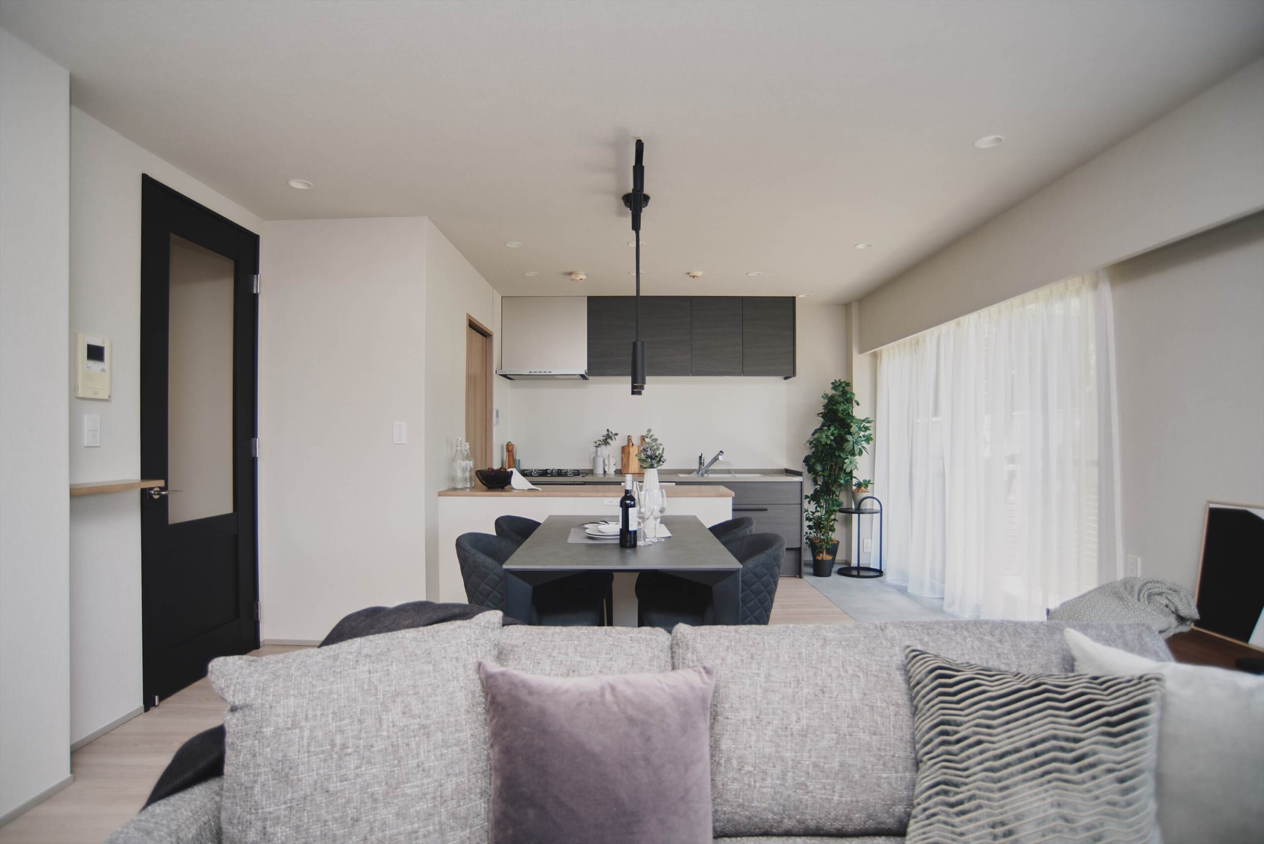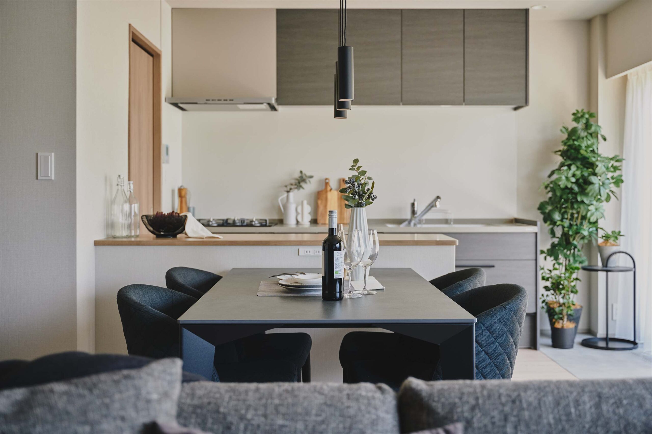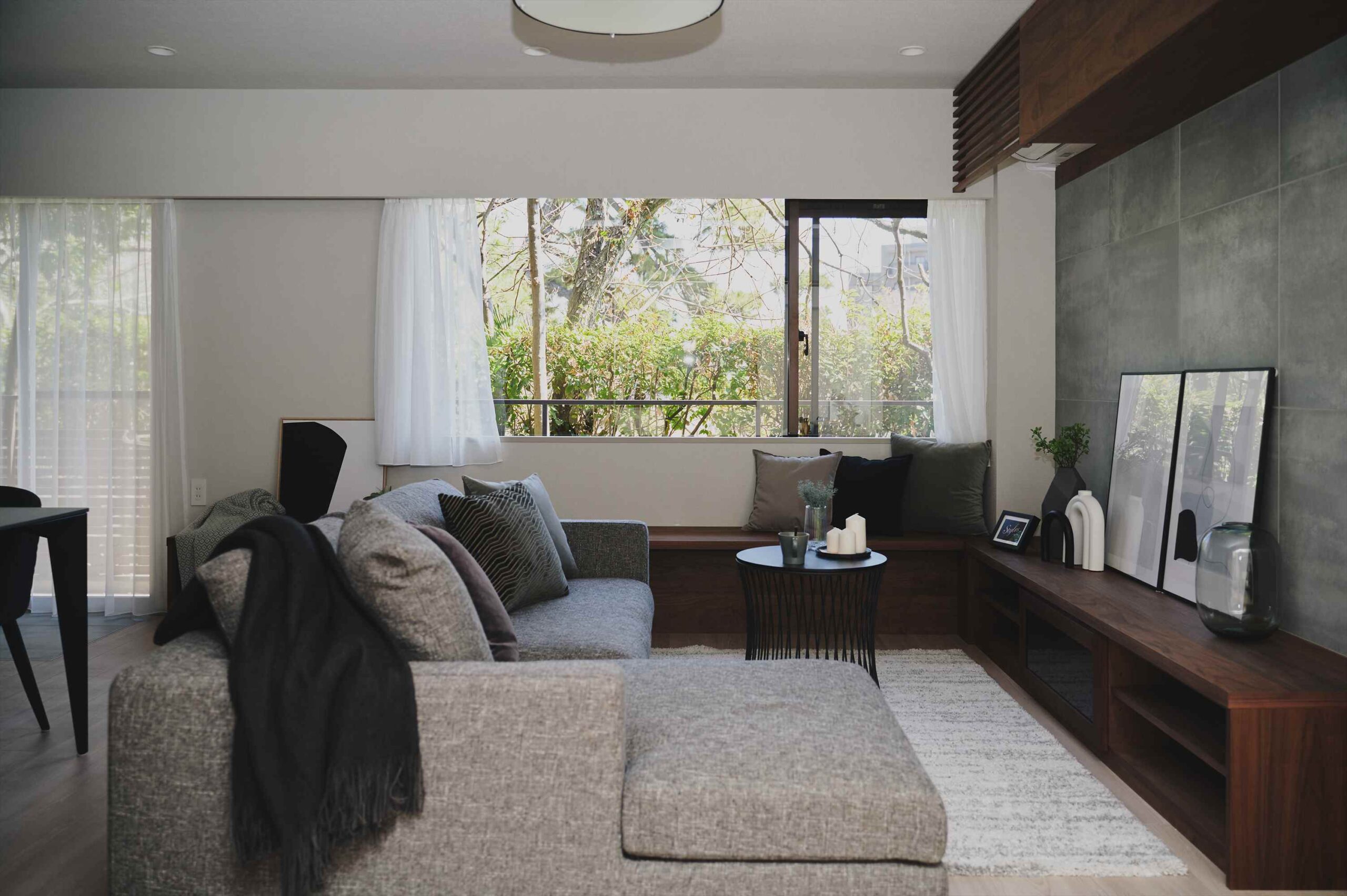 内装はブラックのリビング建具やキッチンが都会的な洗練を感じさせながら、全体は落ち着いたカラーでまとめられ、長く心地よく過ごせる空気感に整えています。リビングダイニングで過ごしているときも深田池や木々の緑を眺められるのは1階に位置するこのお部屋の一番の魅力。水面の表情が時間とともにゆっくり変わっていくのを眺められ、心を癒してくれます。