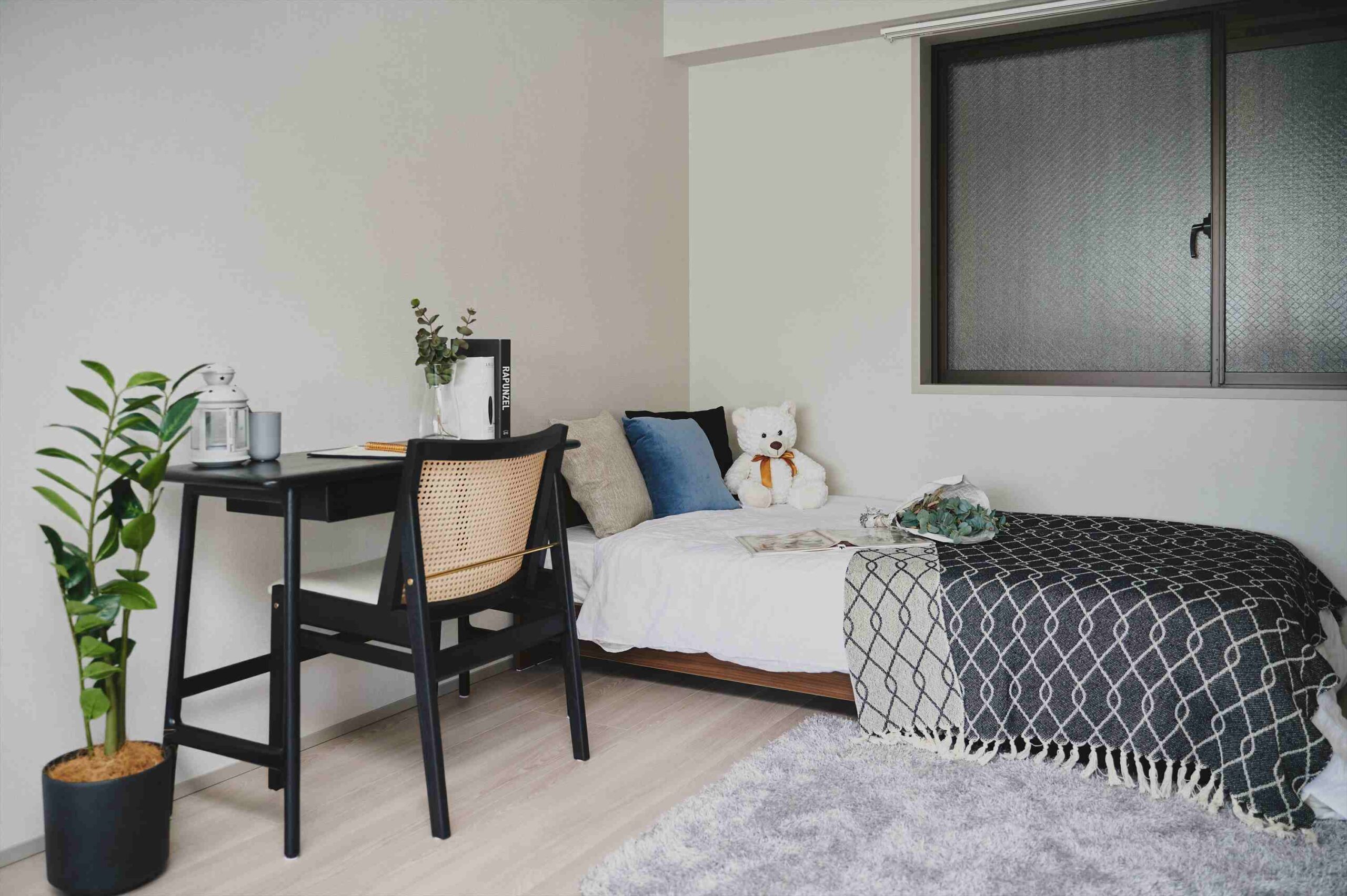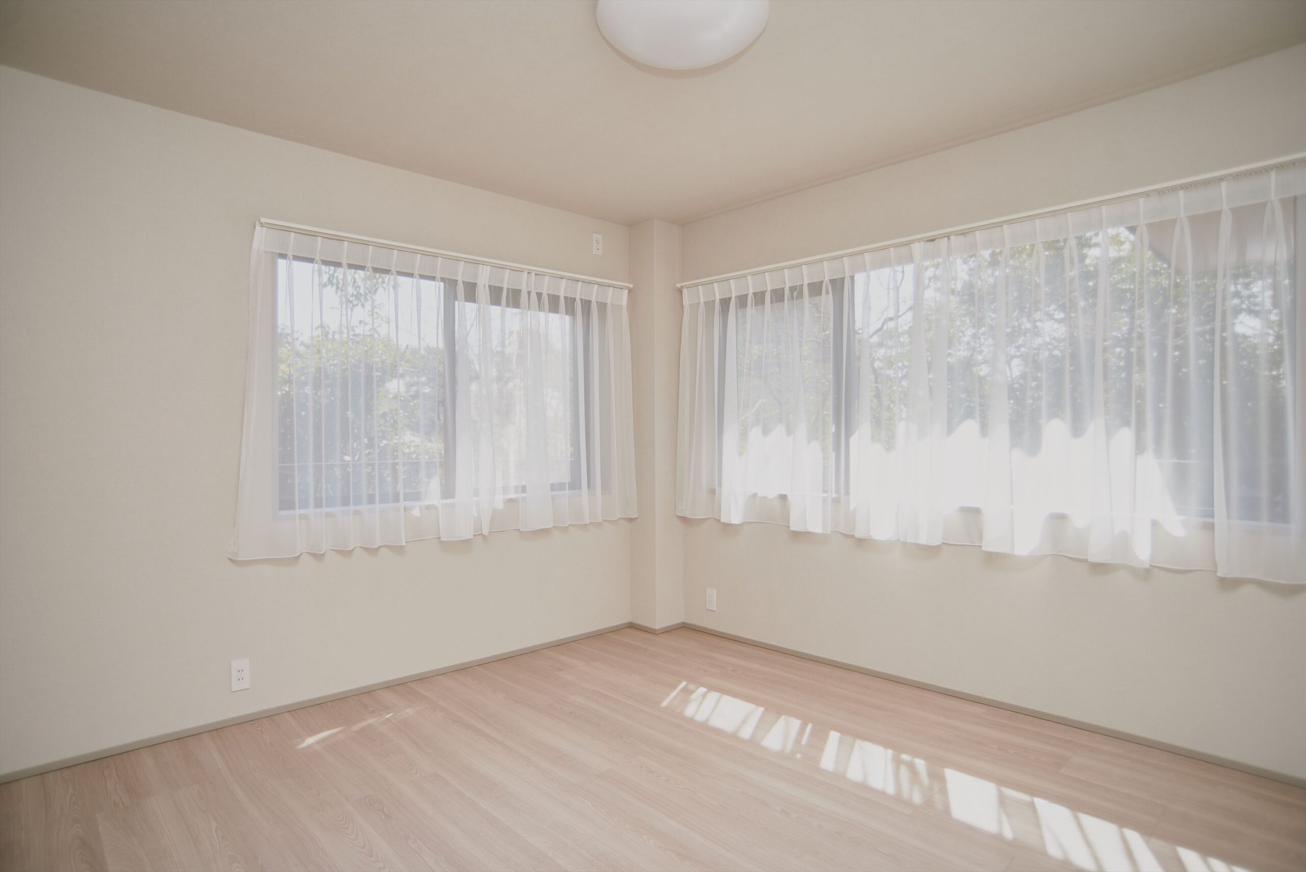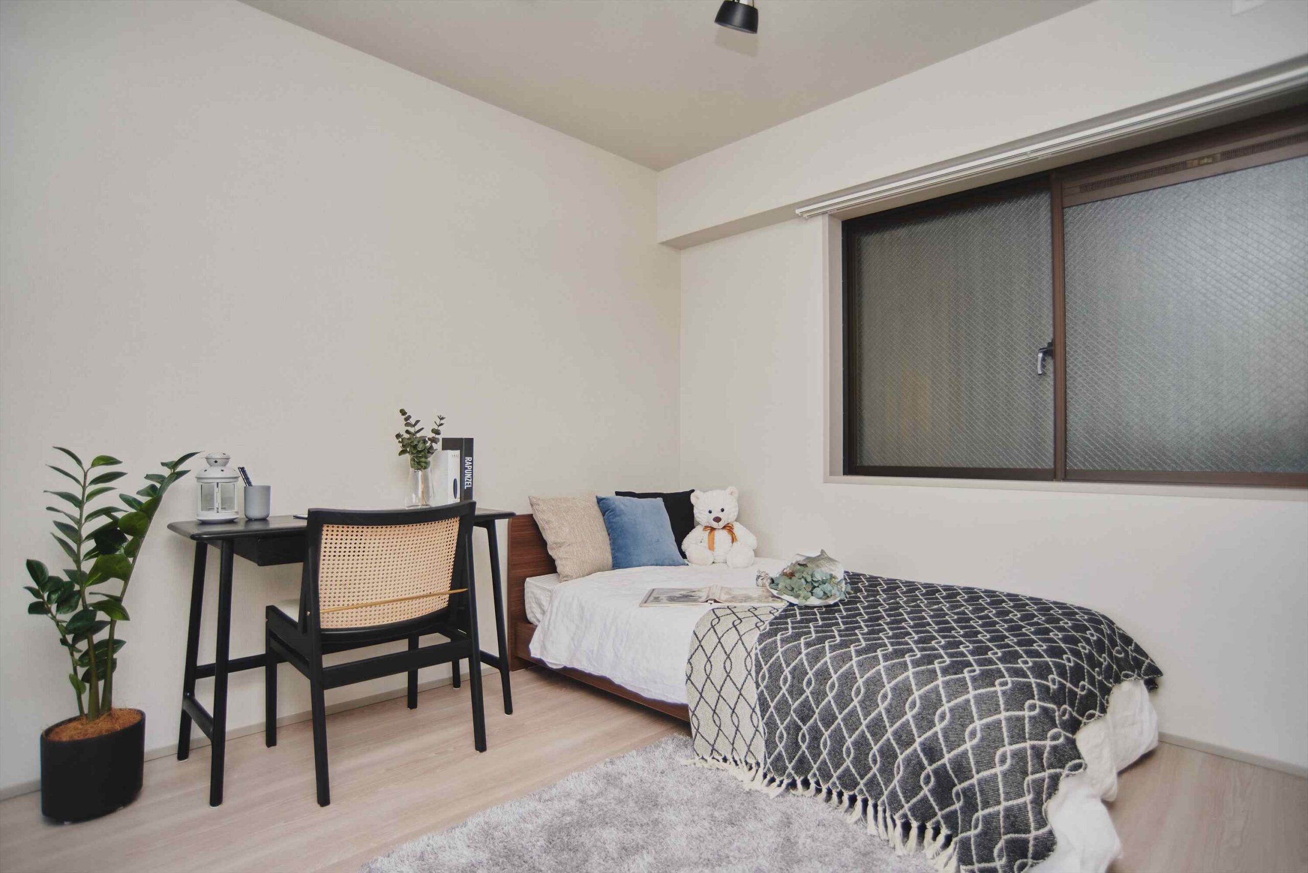 中洋室は、リビングと一体で使えるつくり。普段は扉を開けて、LDKの延長として過ごせば、空間に奥行きが生まれます。来客時や在宅ワークのときだけ“さっと個室に戻せる”柔軟さも魅力です。また、約7.5畳の主寝室は二面に窓を備え、光を取り込みやすい設計。時間帯によって明るさの表情が変わり、自然光が気持ちを軽くしてくれます。窓辺には花台(フラワースタンド)も設けられており、小さなグリーンや季節の花を飾れば、部屋の空気がふっとやわらぎます。