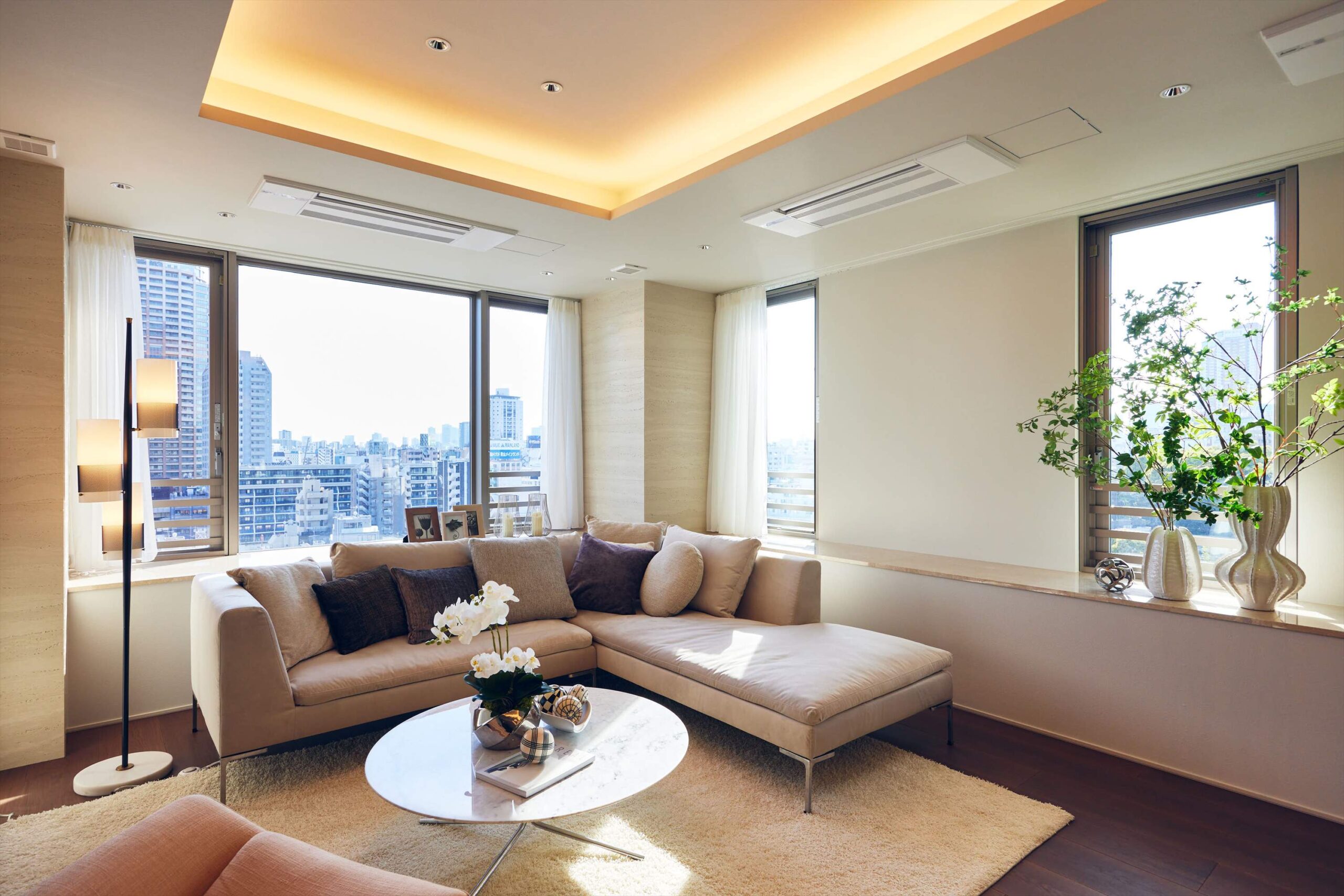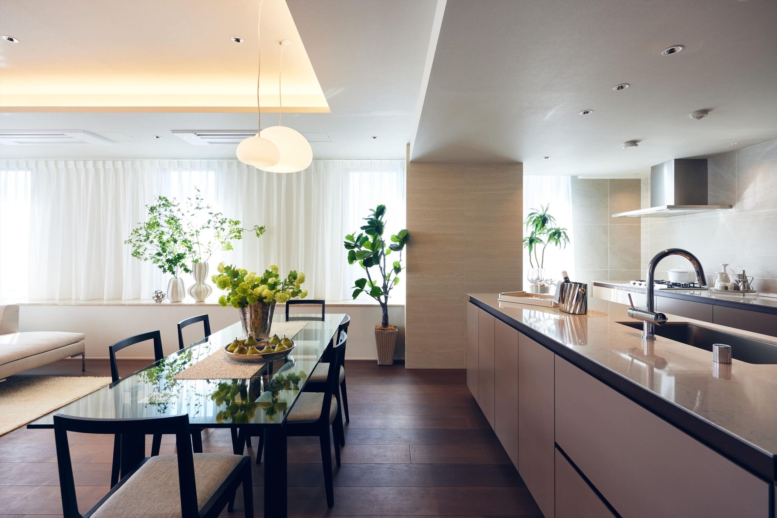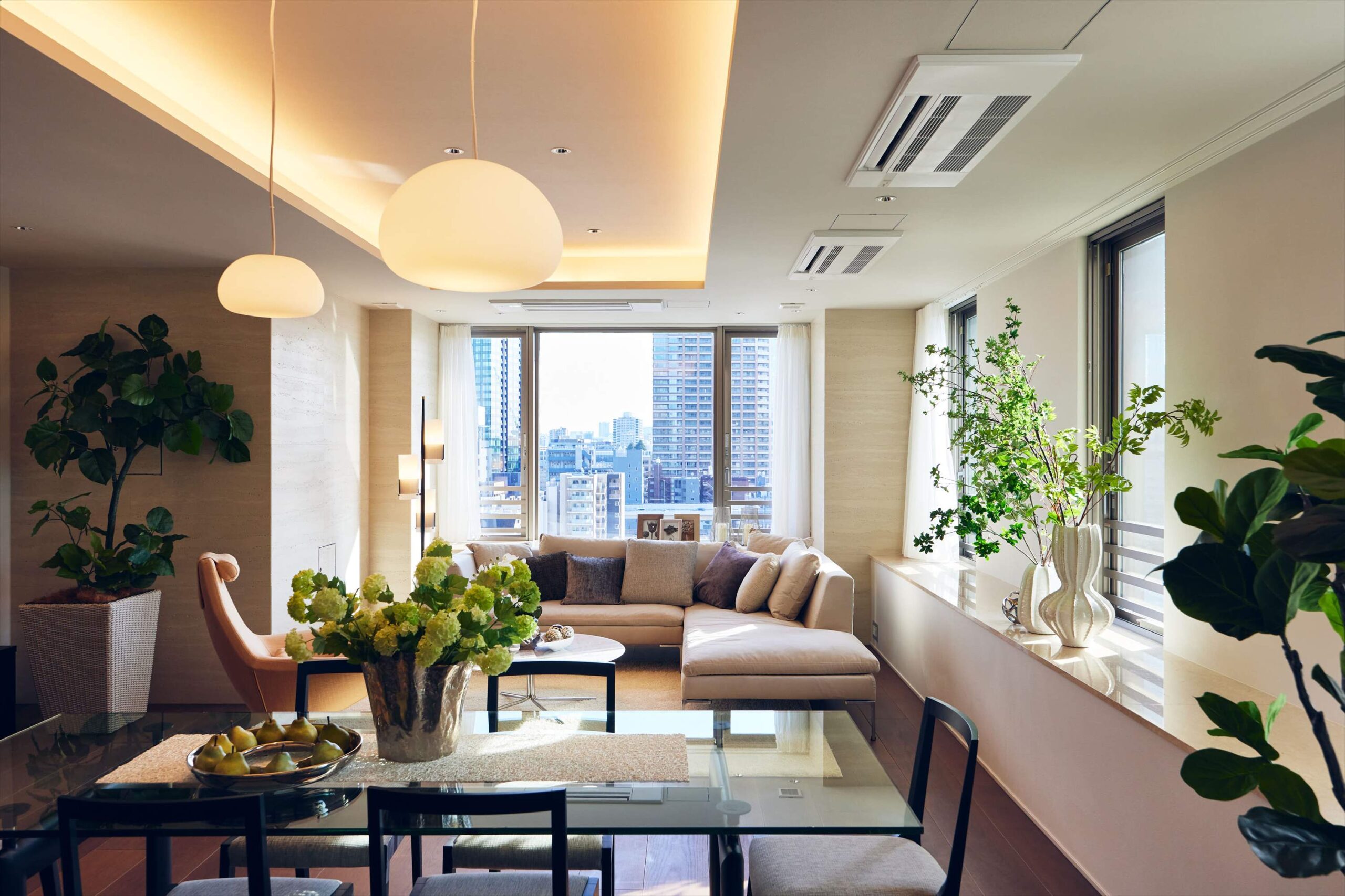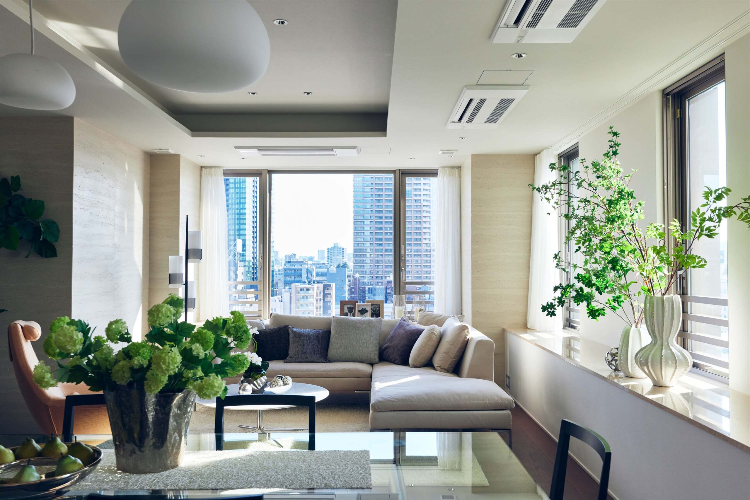 リビングは二方向を窓に囲まれた開放的な空間。光がたっぷりと回り込むことで、広さそのものがいっそう引き立ち、都心の住まいであることを忘れるほど伸びやかな時間が流れます。家族でくつろぐひとときにも、ゲストを迎える場としても、余裕ある美しさを感じさせてくれます。