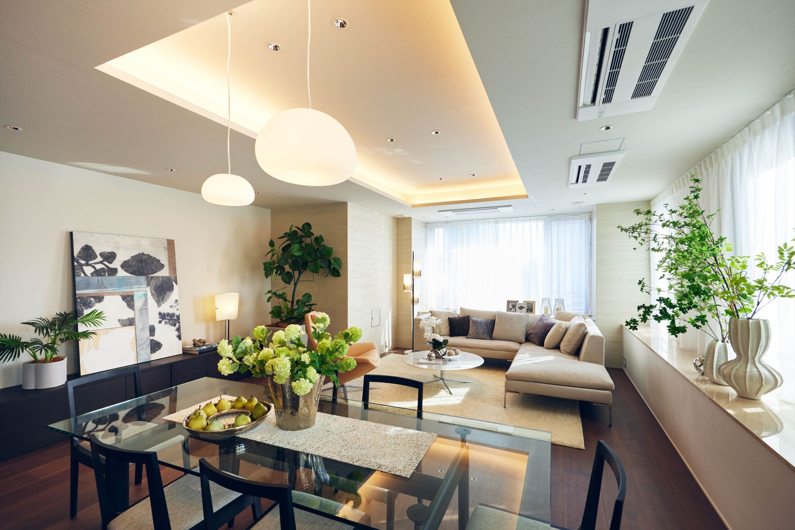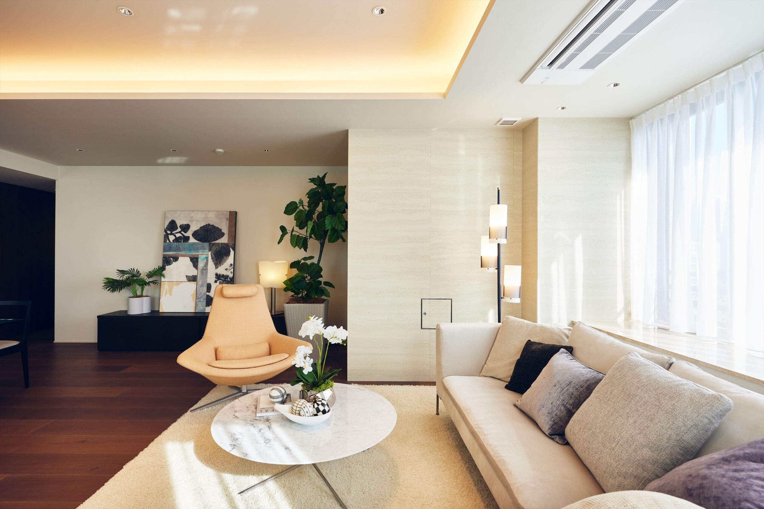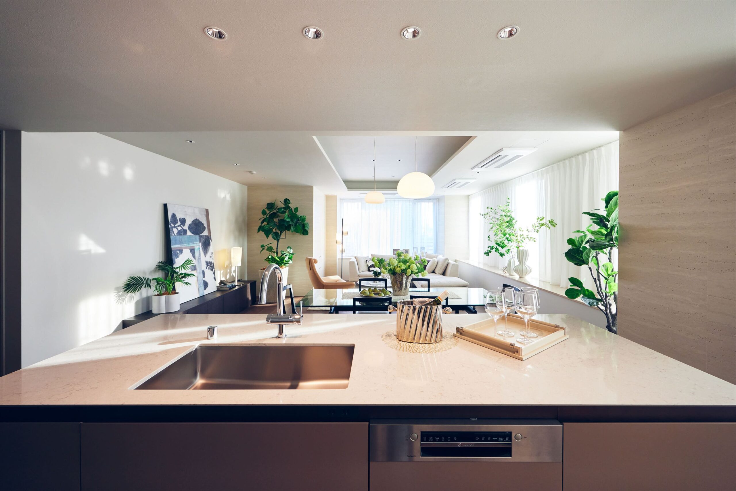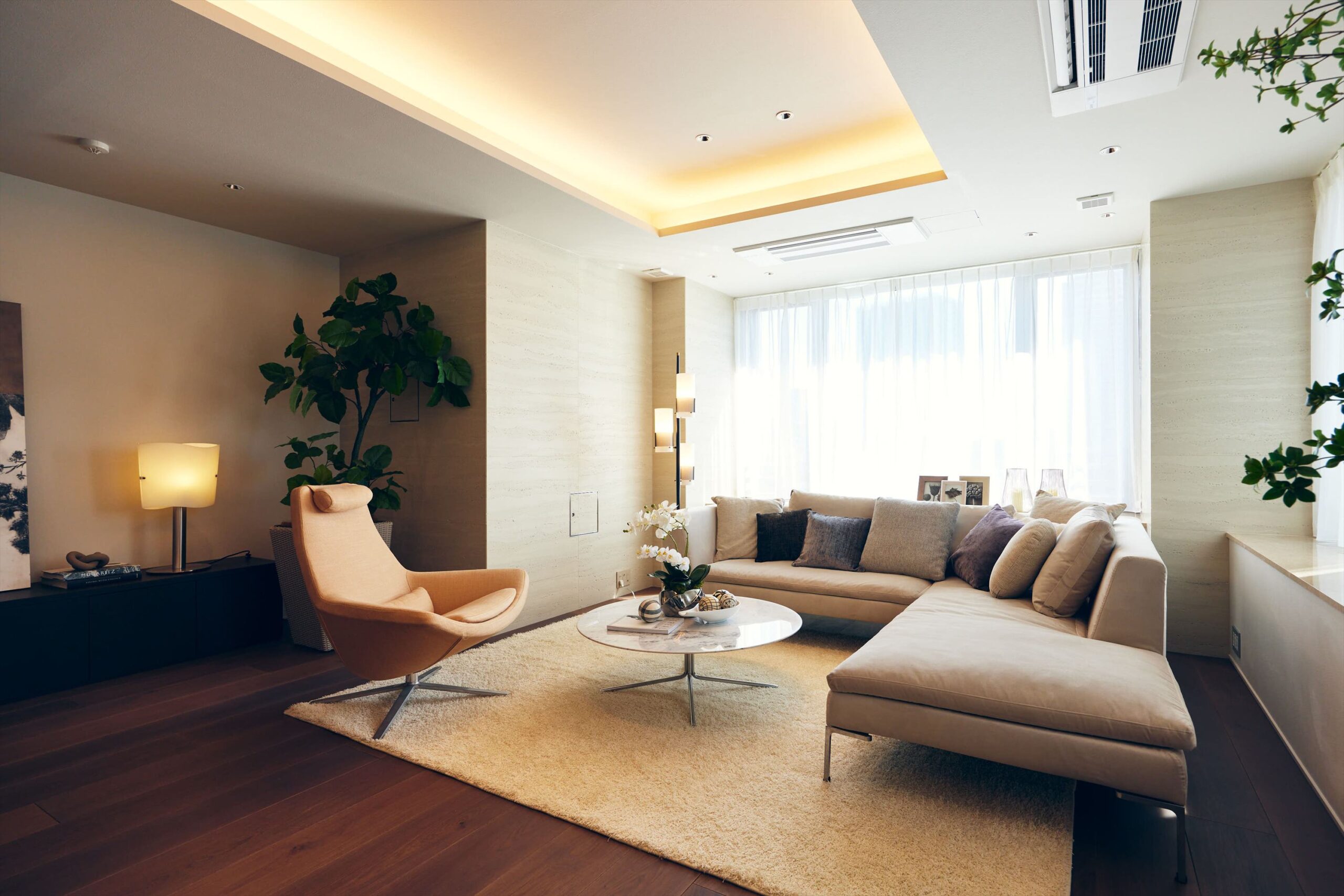 リビングは二方向を窓に囲まれた開放的な空間。光がたっぷりと回り込むことで、広さそのものがいっそう引き立ち、都心の住まいであることを忘れるほど伸びやかな時間が流れます。家族でくつろぐひとときにも、ゲストを迎える場としても、余裕ある美しさを感じさせてくれます。