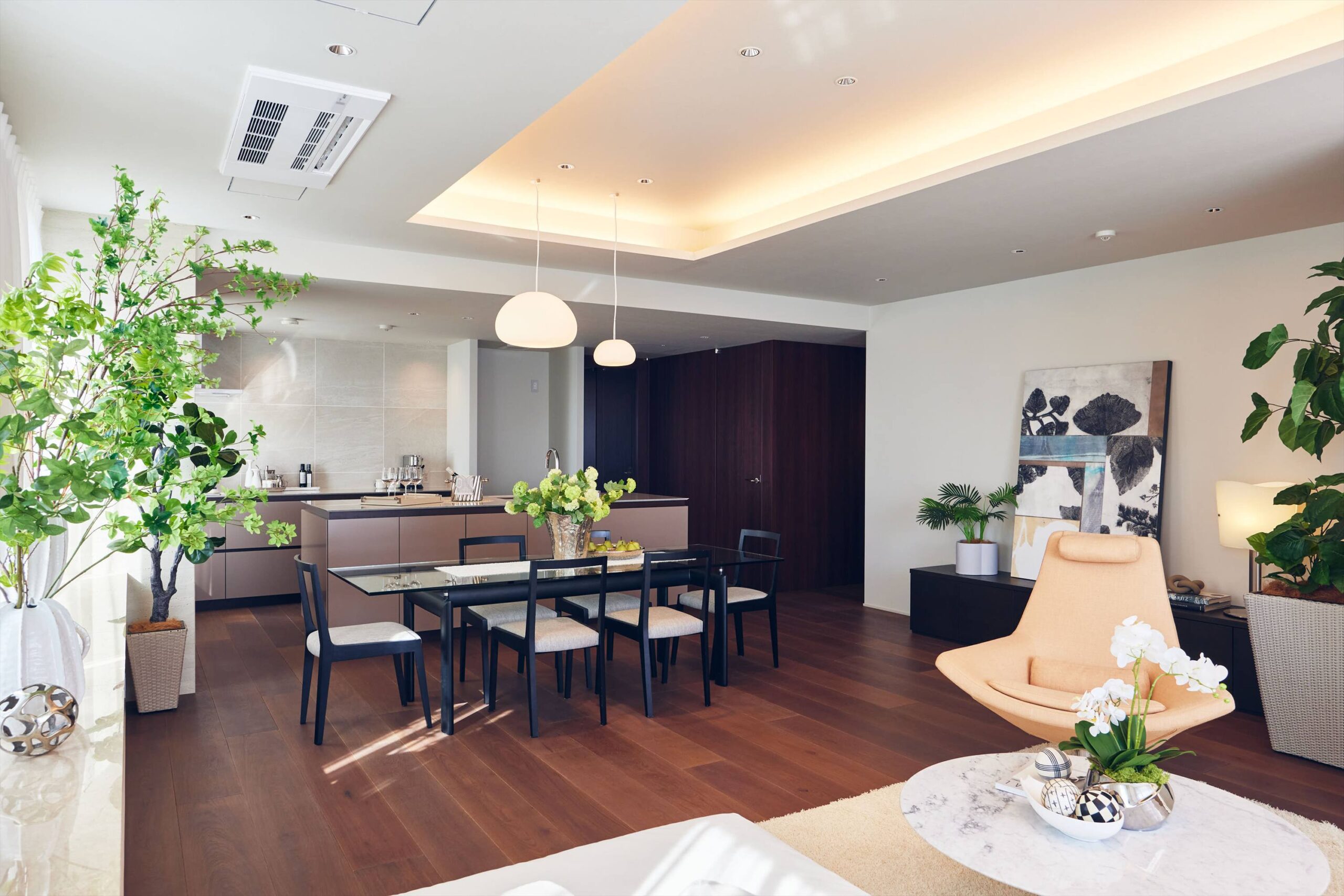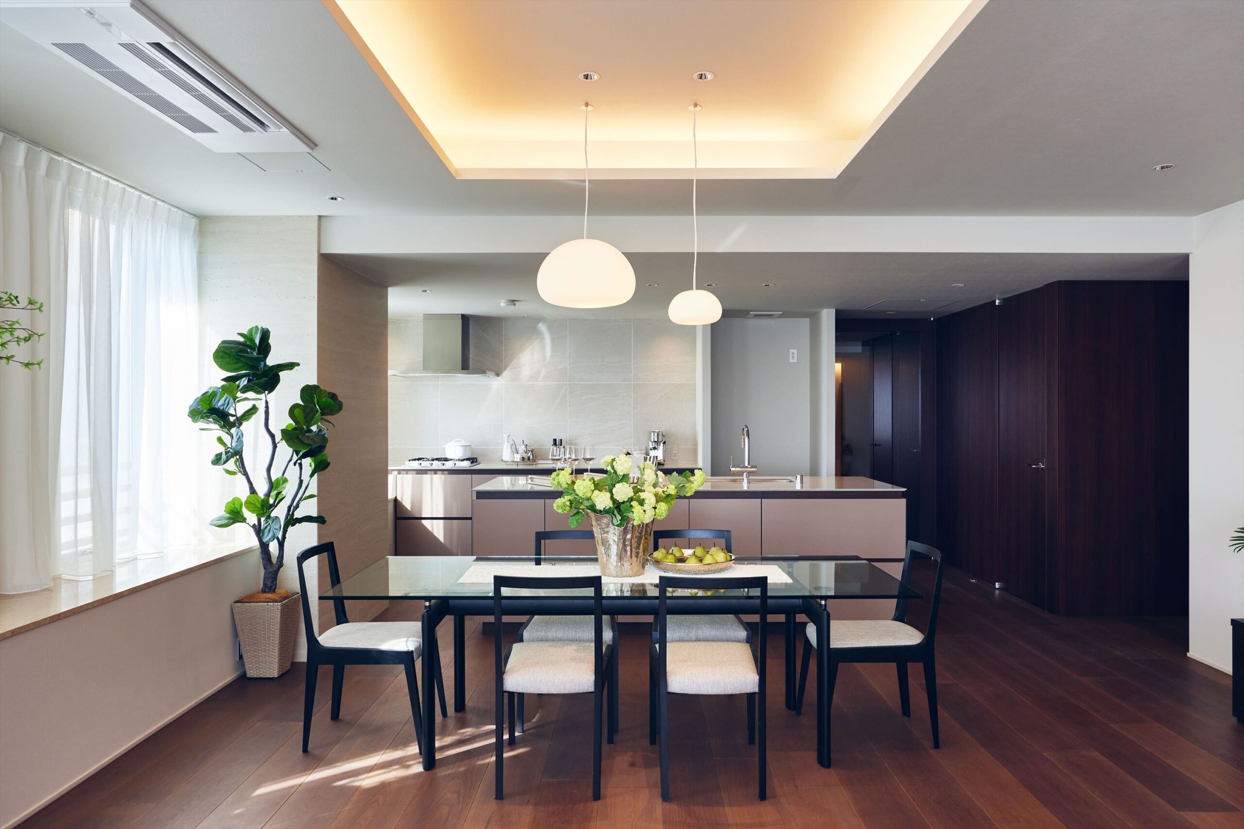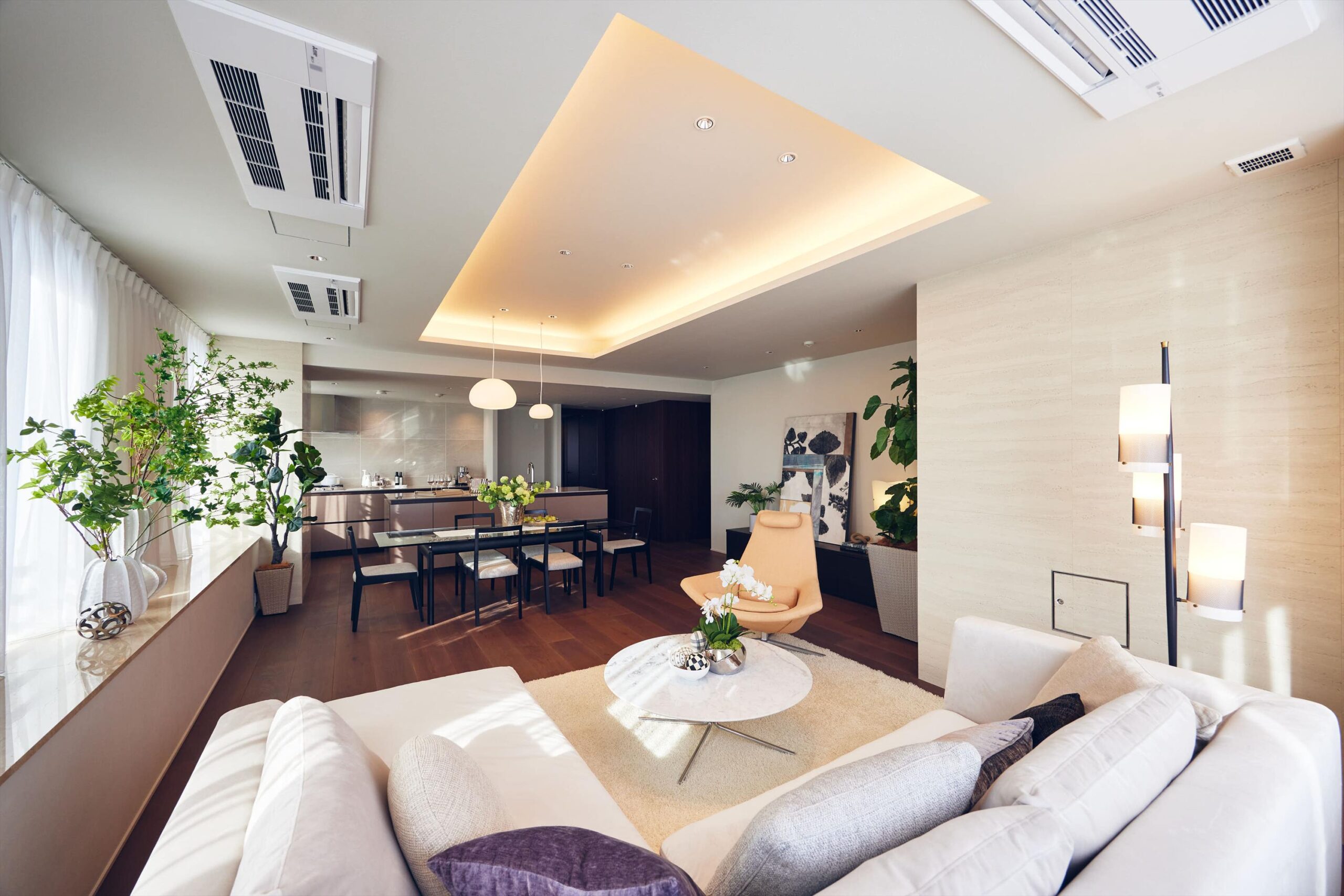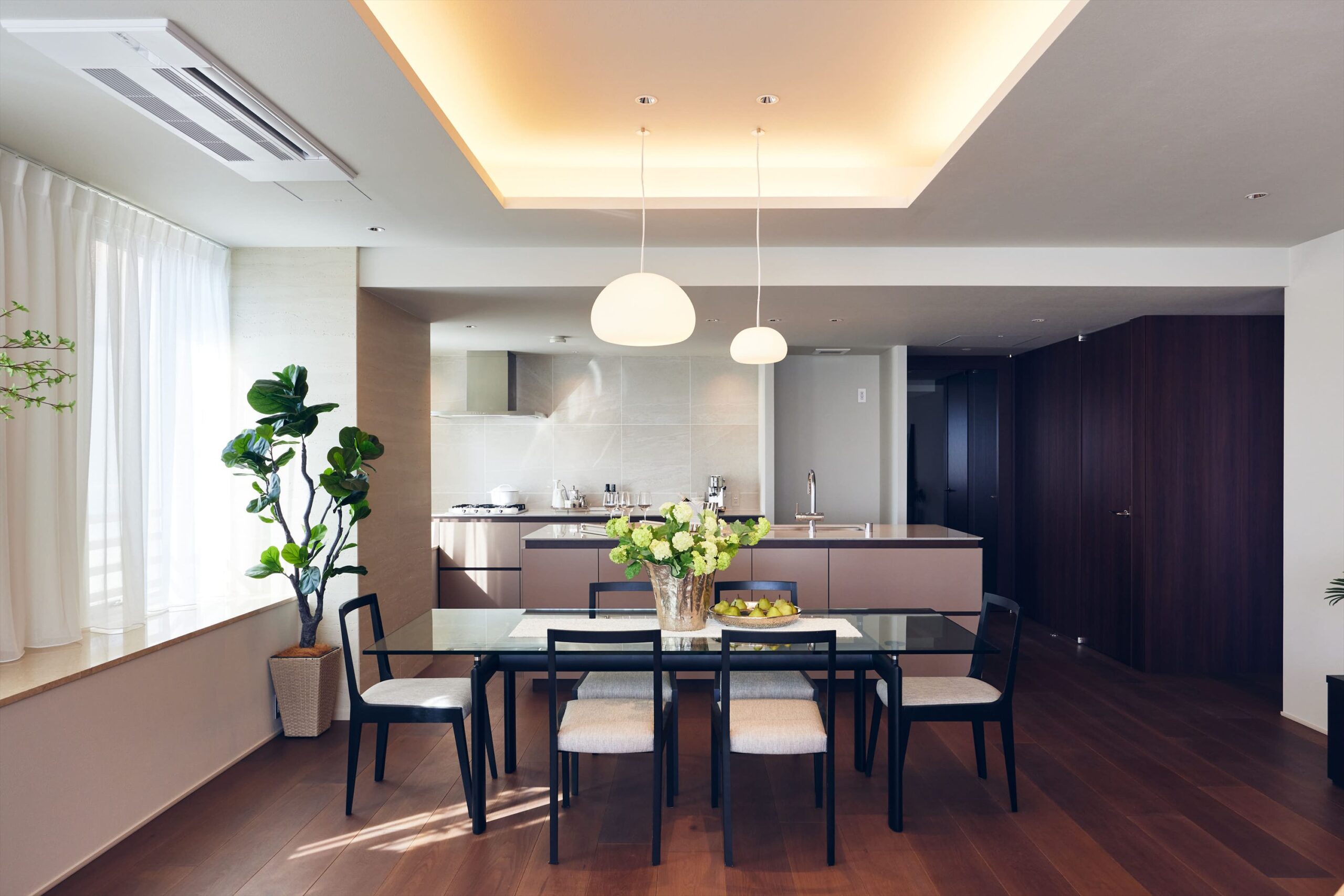 リビングは二方向を窓に囲まれた開放的な空間。光がたっぷりと回り込むことで、広さそのものがいっそう引き立ち、都心の住まいであることを忘れるほど伸びやかな時間が流れます。家族でくつろぐひとときにも、ゲストを迎える場としても、余裕ある美しさを感じさせてくれます。