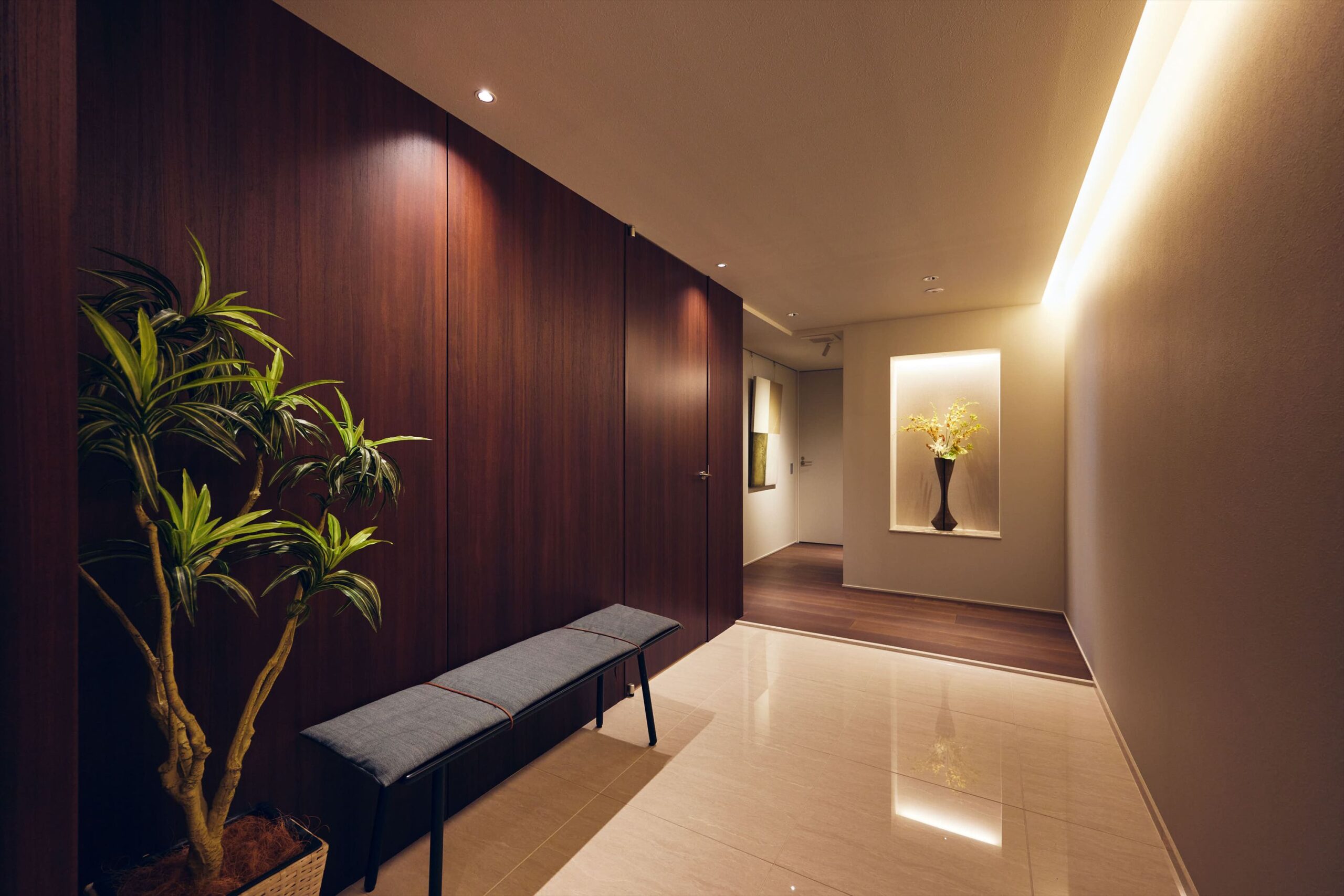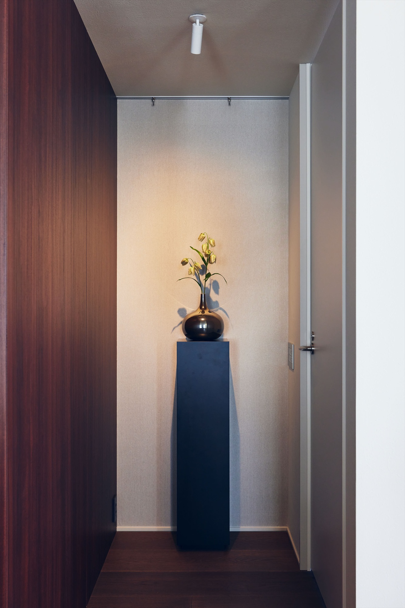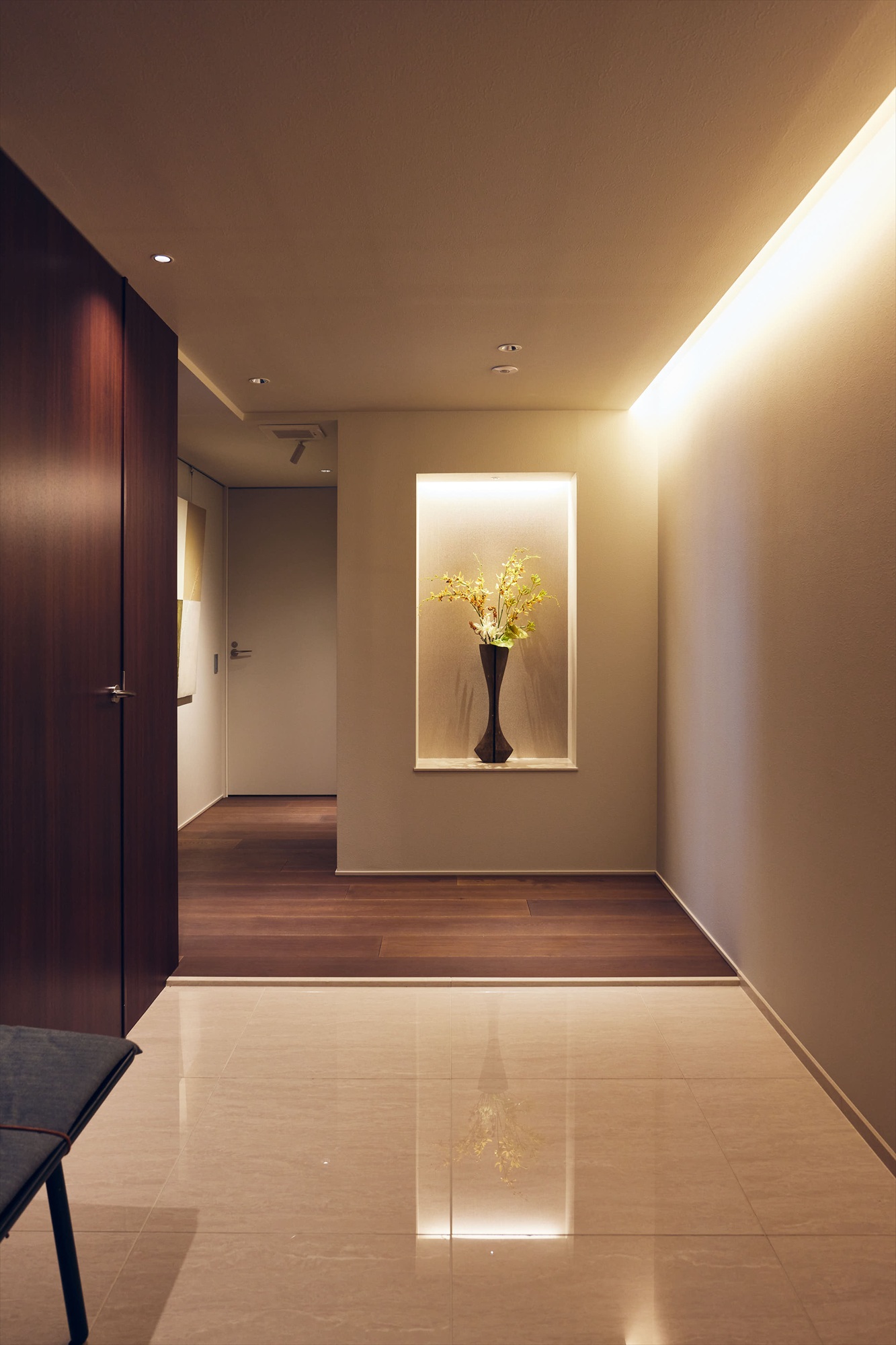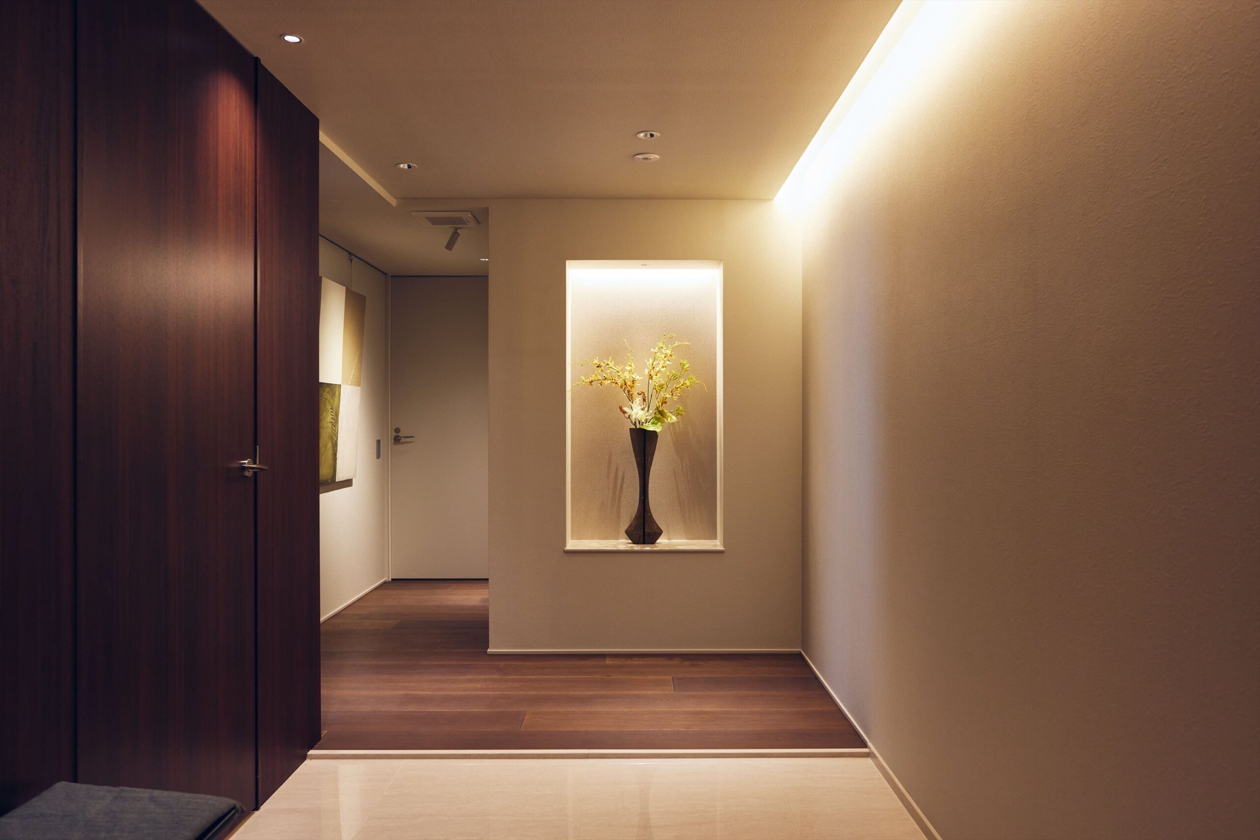 玄関は、元の間取りからゆとりをもって拡張し、私邸の格を印象づける迎賓の空間へと昇華されています。壁面に設けたニッチには、季節の花やアートを美しく装飾することができ、訪れる人を迎えるその瞬間から、住まい手の審美眼ともてなしの精神が静かに伝わります。加えてSICを備えることで、日常の機能を巧みに内包しながら、表の空間には揺るぎない整然さと気品が保たれています。