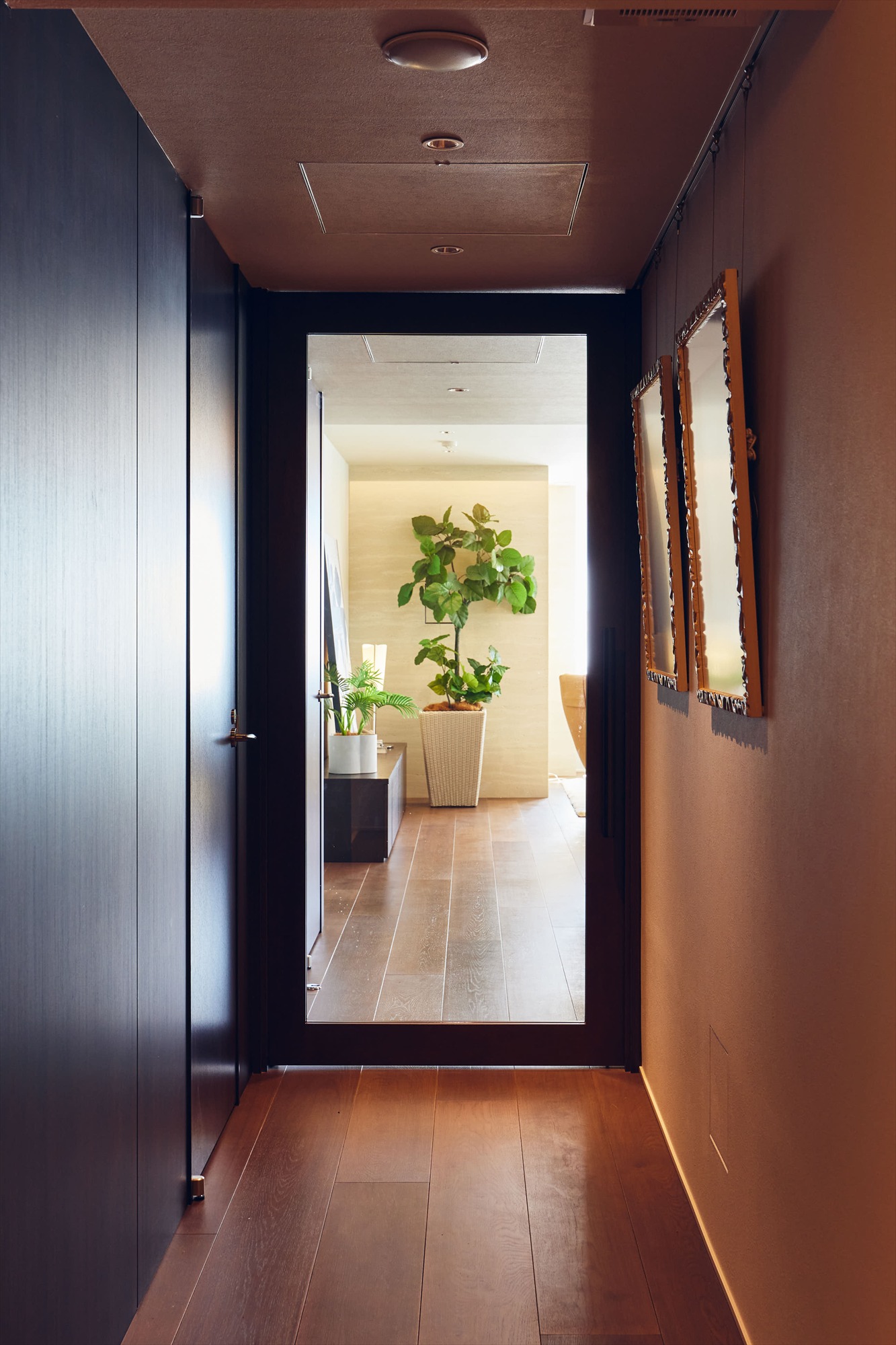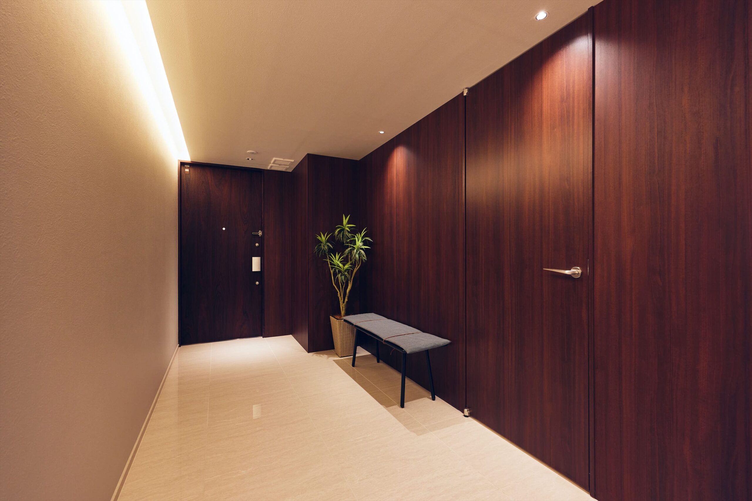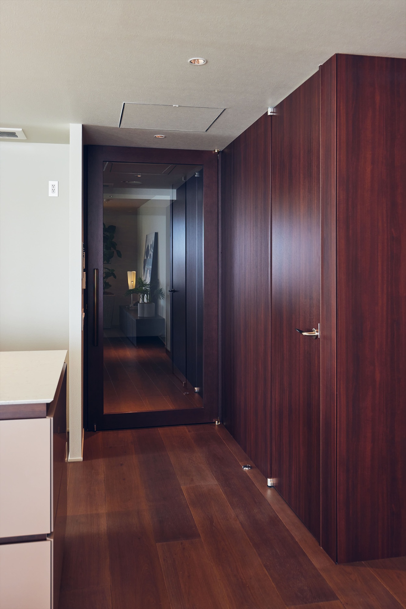 この住まいの魅力は、単なるラグジュアリーではなく、建物全体のデザイン思想が室内まで一貫していること。共用部のコンセプトを受け継ぎ、室内にはマホガニー調の木目パネルを壁面に採用。深みのある表情が、空間に重厚感と静かな高級感をもたらします。三色の塗料を巧みに掛け合わせ、別誂えで仕上げた突板フローリングが、空間に唯一無二の陰影と品格を宿します。躯体の柱には、共用廊下と呼応するようにトラバーチン柄タイルを施し、住戸内においても建築としての統一感を崩しません。一歩室内に足を踏み入れると感じるのは、“住戸”ではなく“私邸”という印象。素材が語る品格が、日常のひとときにまで静かな美しさを添えてくれます。