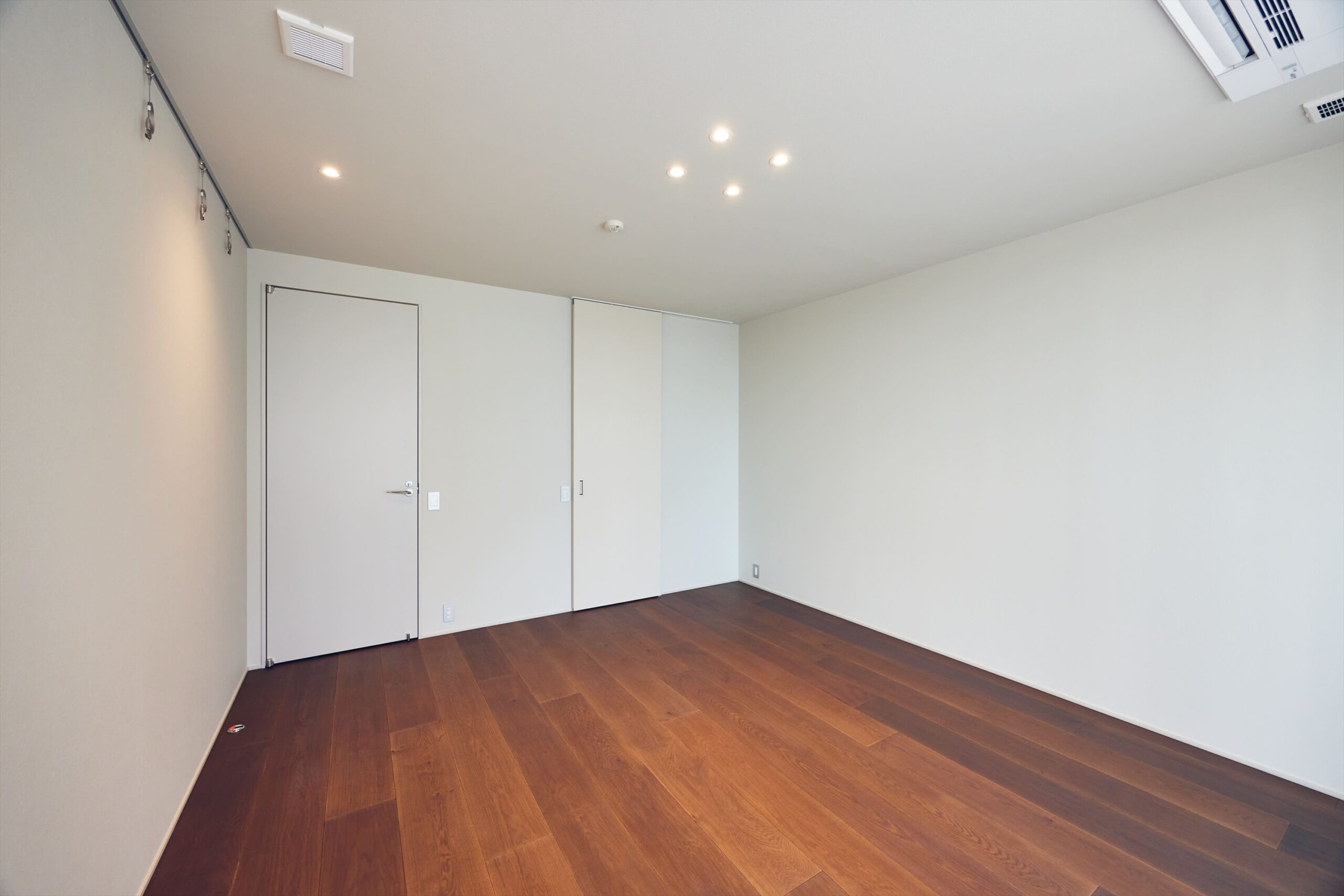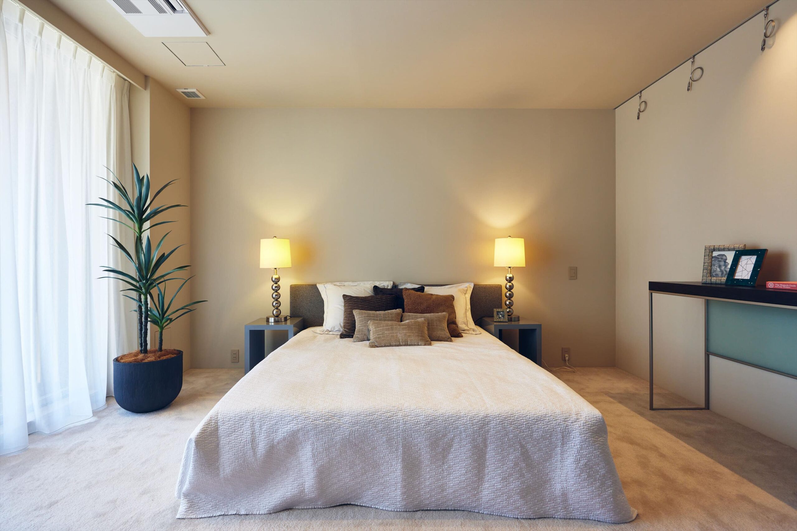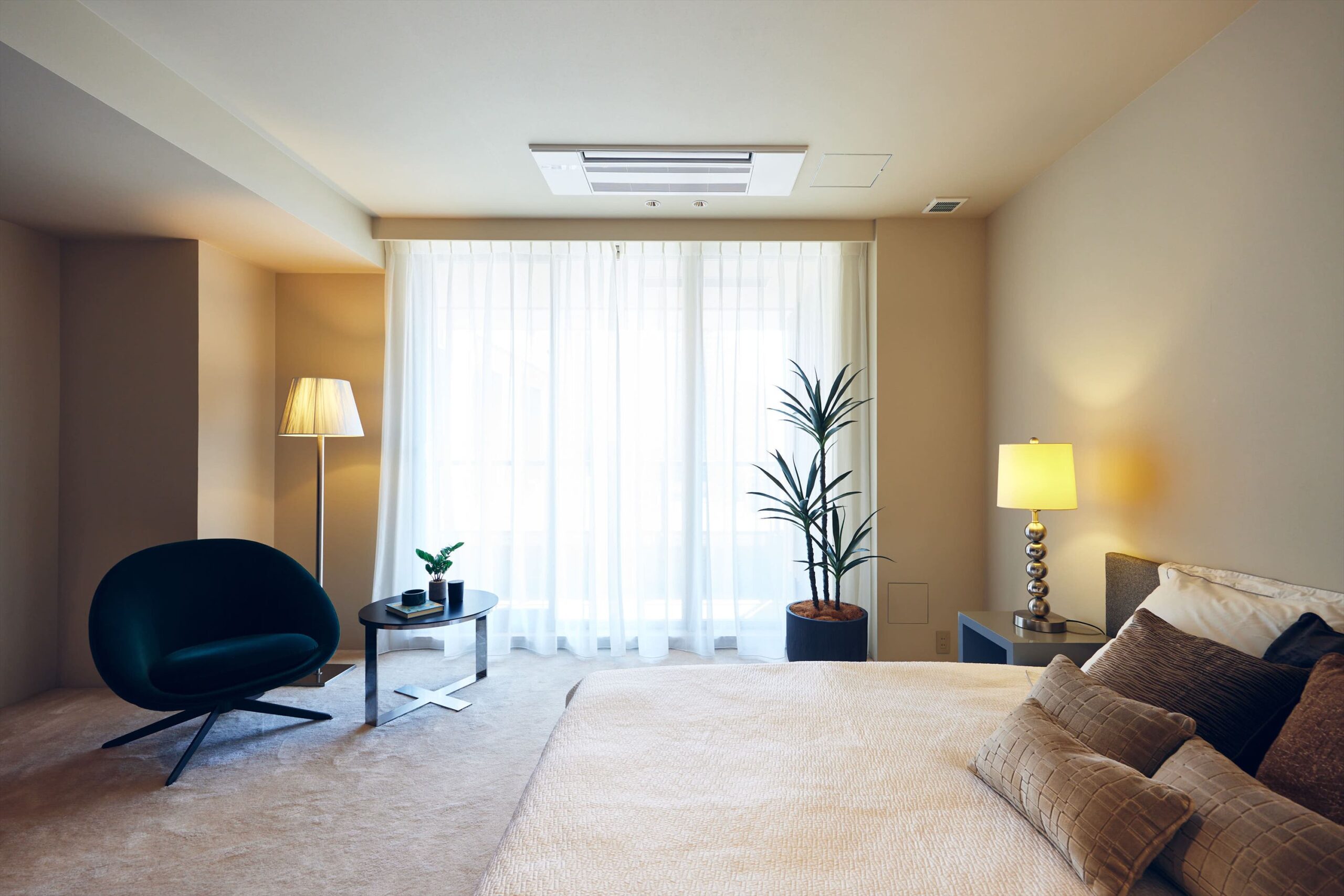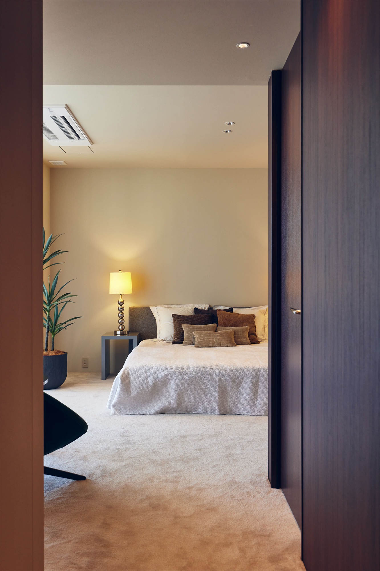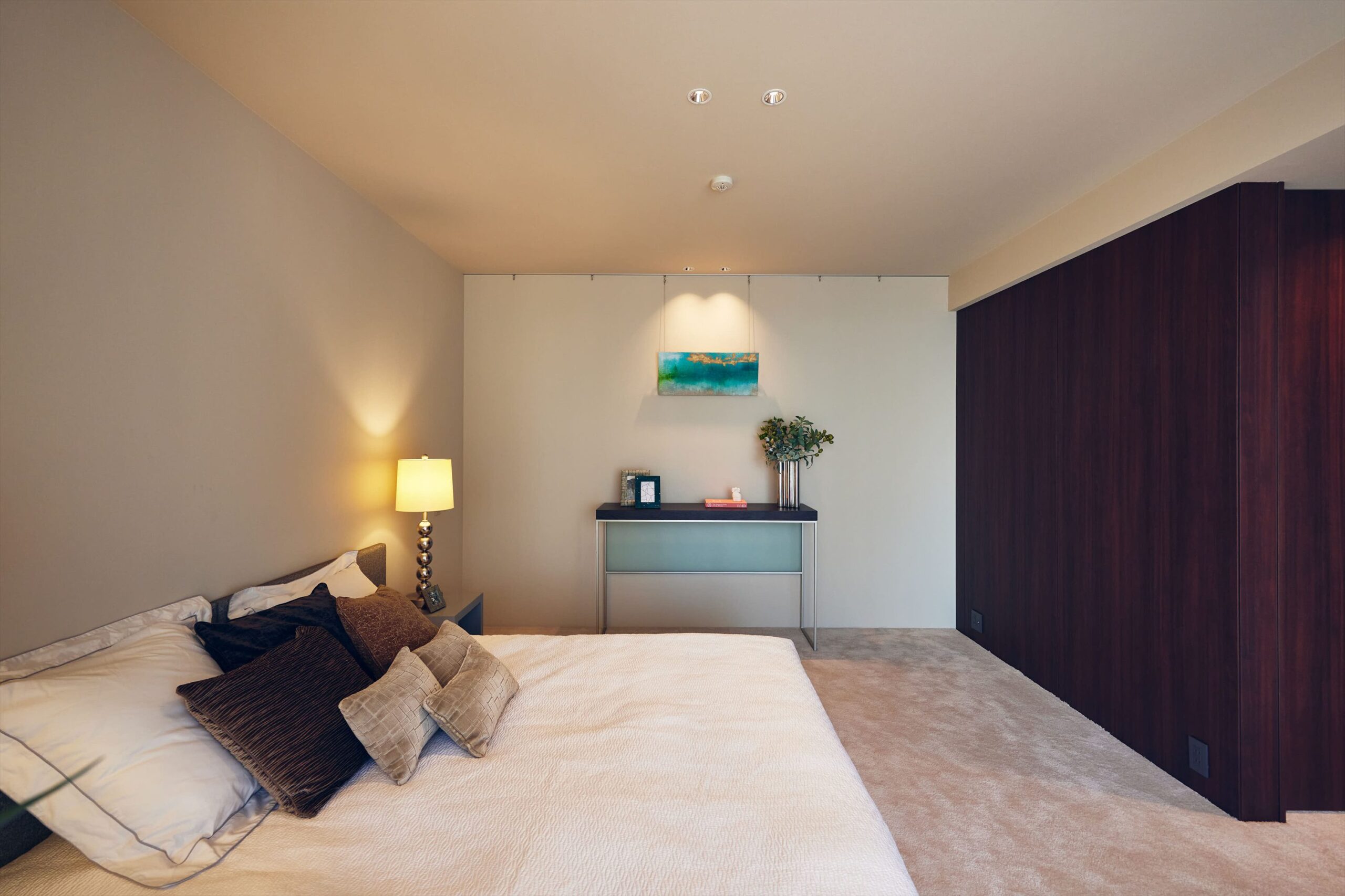 主寝室は、外へ開くパブリックな空間とは別に、自身のための静かな時間を完結できる構成。足元にはやわらかなカーペットを敷き込み、ホテルライクな静けさと上質さを演出。華美ではないのに深く落ち着ける、その絶妙な設えが、一日の終わりをゆるやかに整えてくれます。