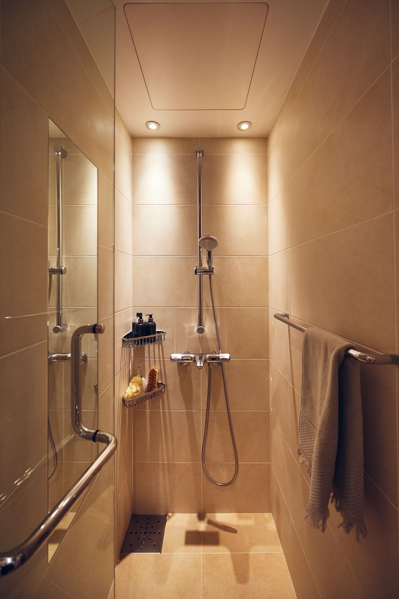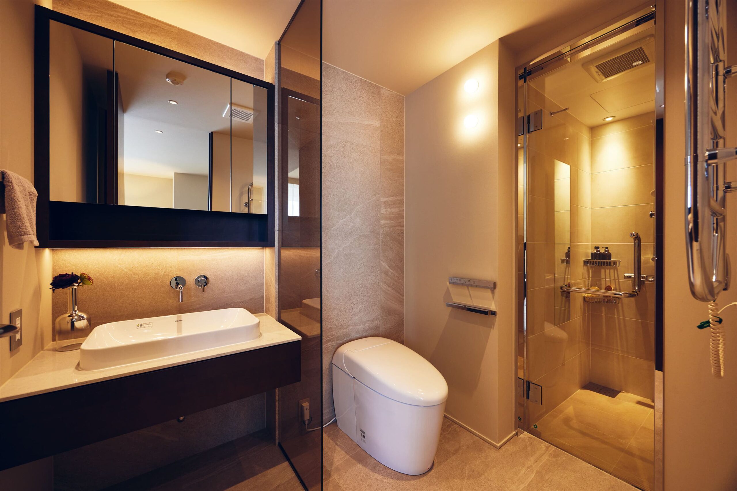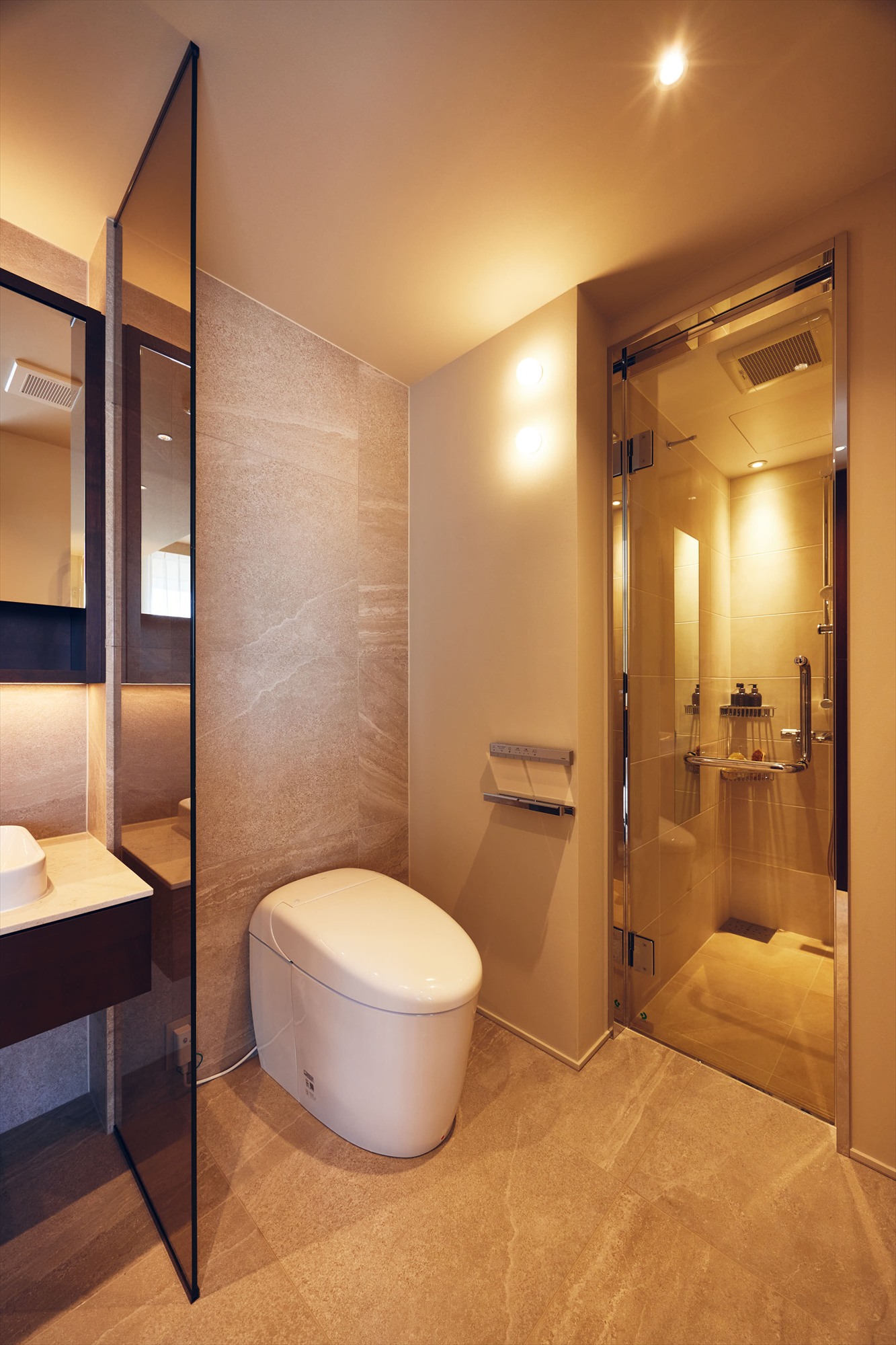 また、主寝室内にトイレ・洗面・シャワールームを備え、朝の支度も夜のリセットも、この一室の中で静かに完結します。さらにその先には、ゆとりあるWICが緩やかにつながり、身支度から収納までが自然な流れで整う設えに。プライベートな時間を外へ開かず、この空間の中で心地よく閉じられることも、この住まいならではの上質さです。