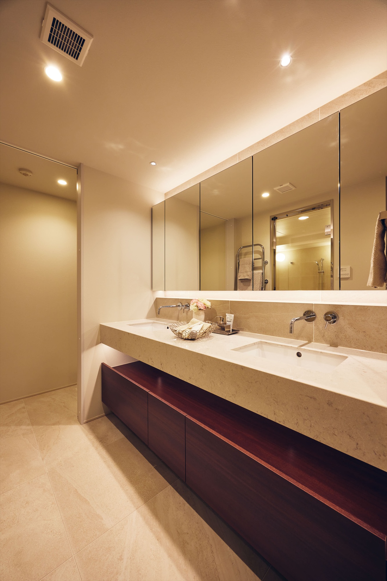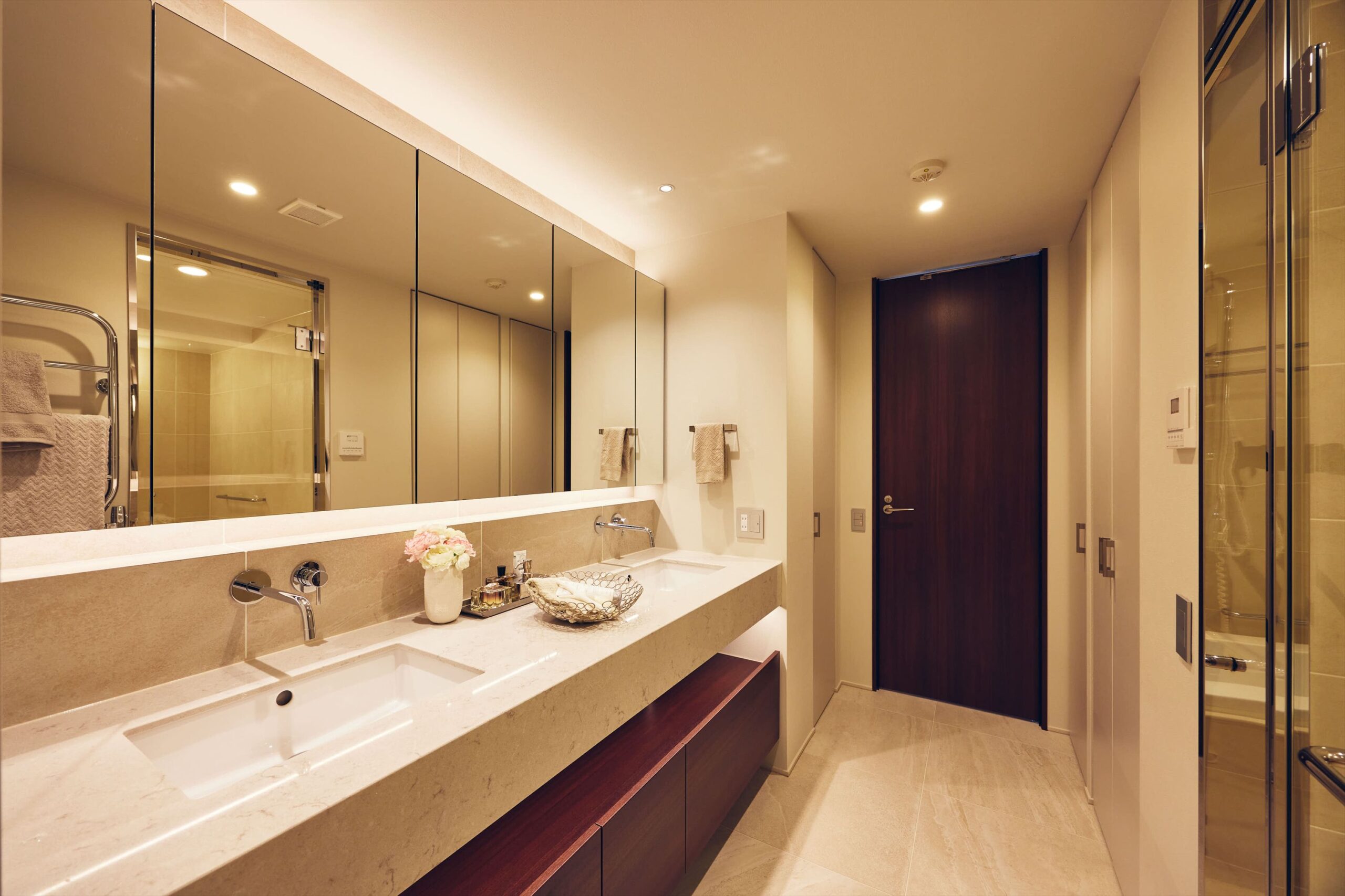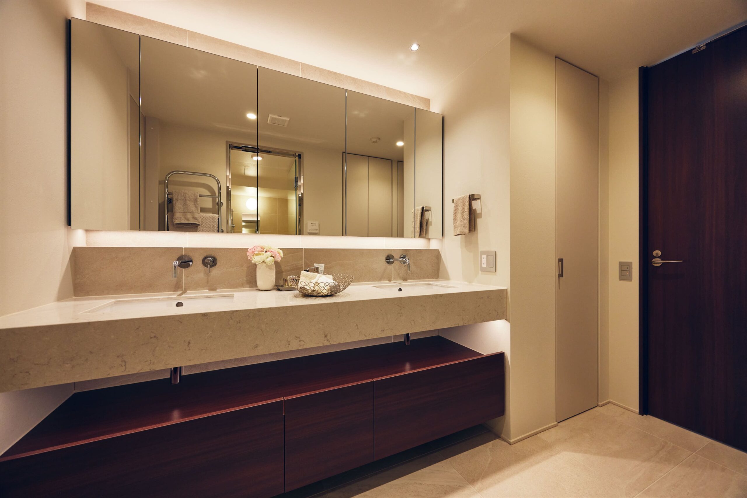 洗面は2ボウルを備えたホテルライクな仕様。ゆとりある設えに加え、緻密に計算された照明計画が、空間に華やかさと洗練をもたらしています。鏡に映る光の印象まで美しく整えられていることで、日常の所作が少し丁寧に感じられ、何気ない身支度の時間にも上質な余韻が宿ります。