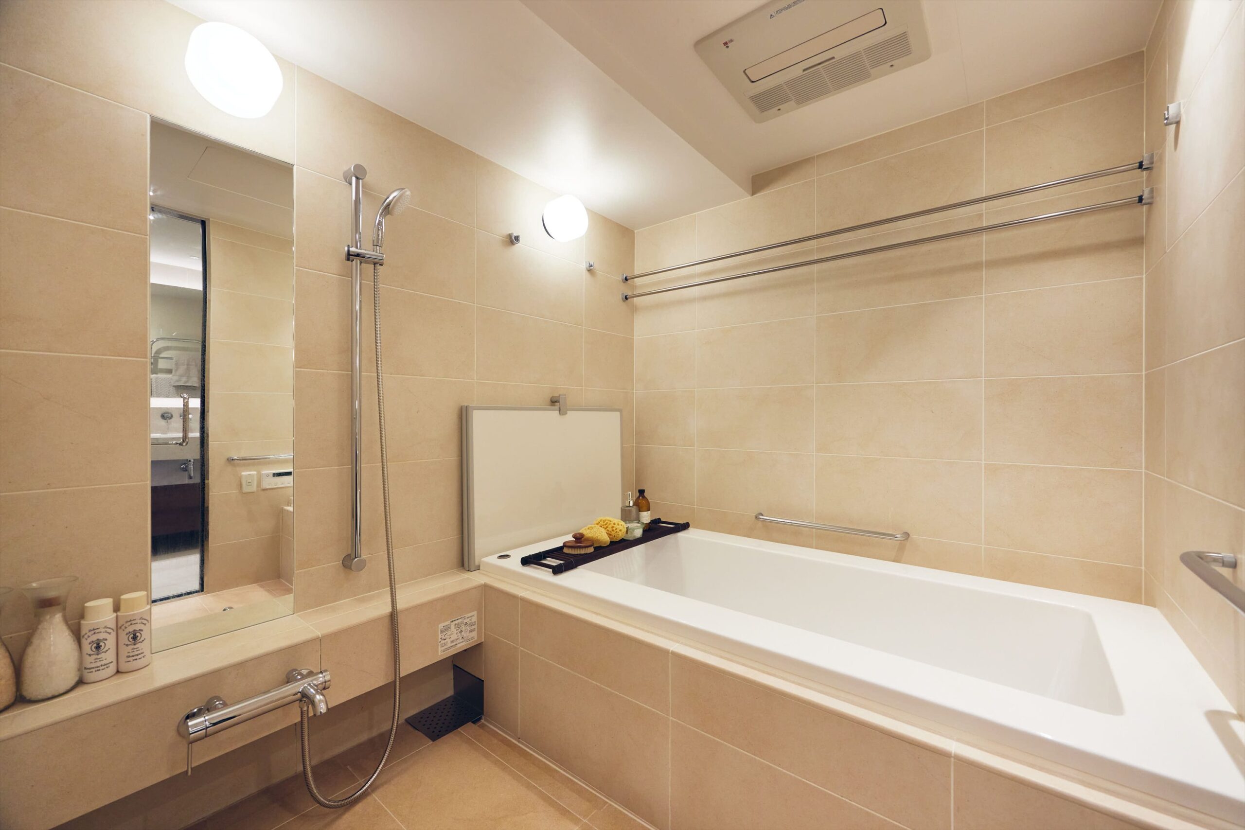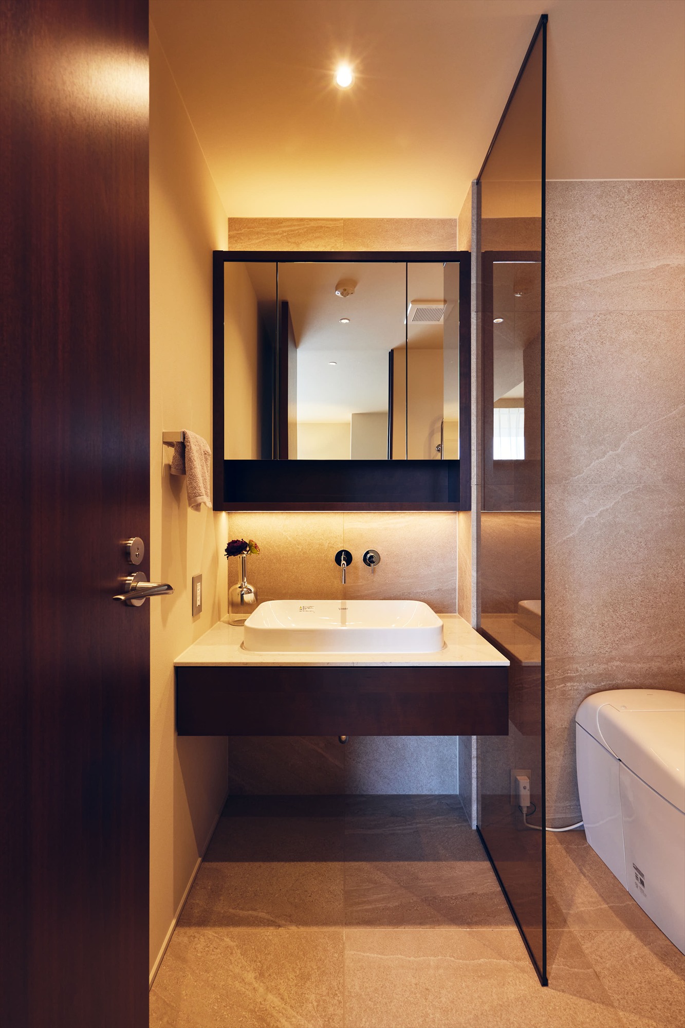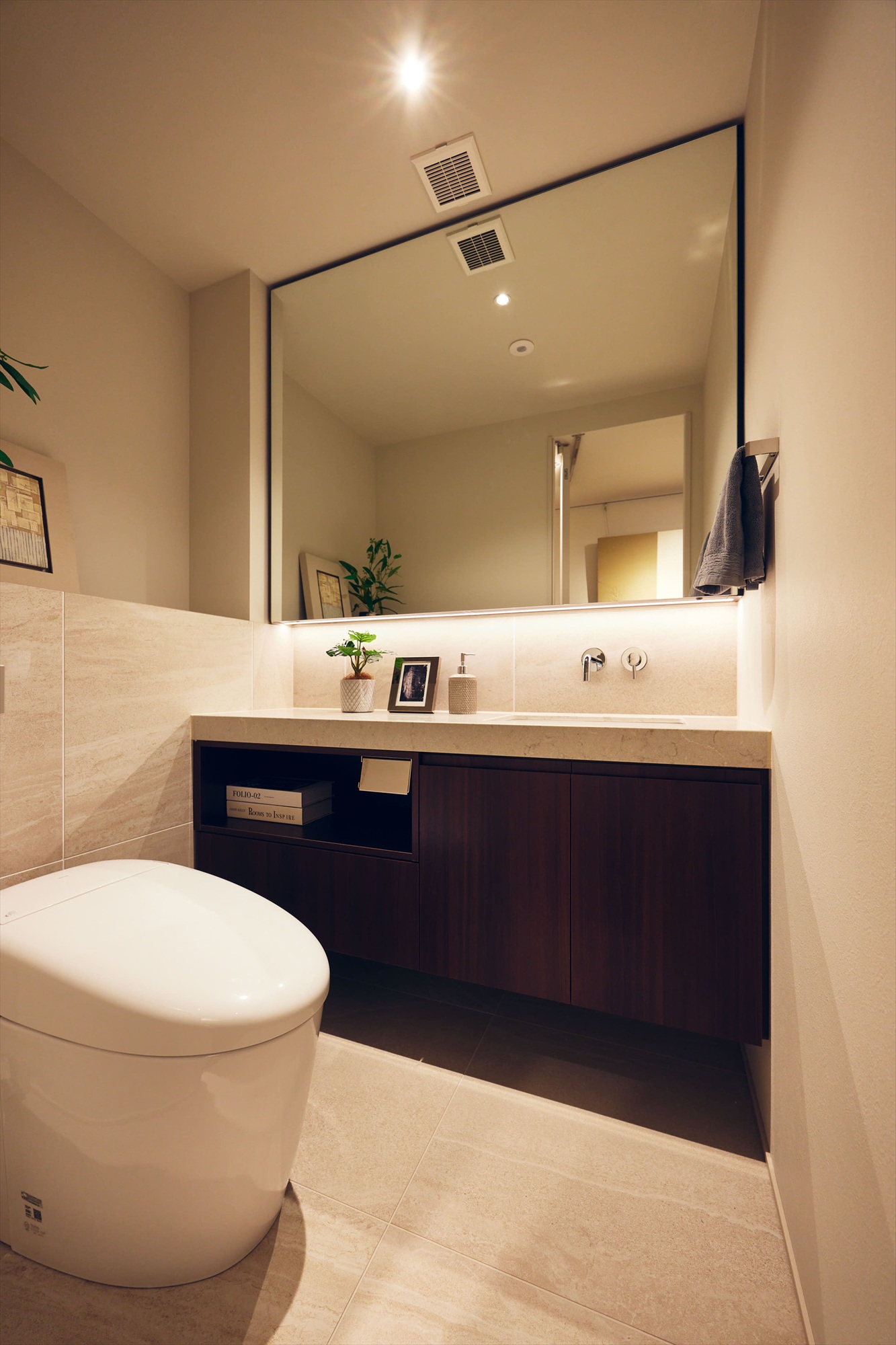 洗面は2ボウルを備えたホテルライクな仕様。ゆとりある設えに加え、緻密に計算された照明計画が、空間に華やかさと洗練をもたらしています。鏡に映る光の印象まで美しく整えられていることで、日常の所作が少し丁寧に感じられ、何気ない身支度の時間にも上質な余韻が宿ります。