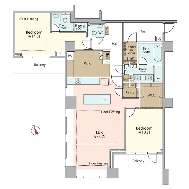 ゆとりある2LDKは、東京でのセカンドレジデンスとしても、迎賓性を重視する暮らしにも自然に寄り添うプランです。LDKは、ゲストを招いた際にも窮屈さを感じさせない伸びやかな空間。キッチンはLDKのほうを向いたⅡ型レイアウトで、調理と会話が自然につながり、ホームパーティーやアペリティフの時間も美しく成立します。