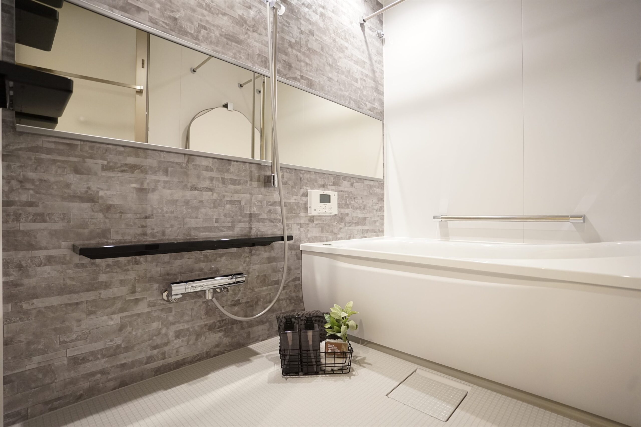 一日の疲れを癒すバスルーム。足を伸ばせる広々としたゆるリラ浴槽は頭と首をしっかり支えるとともに背中を包み込み、体にかかる圧力が分散されるので自然とリラックスする姿勢になります。浴室の床はTOTOのホッカラリ床を採用しており、ひざまずいても痛くないので、お手入れ中の動作もスムーズ。浴室乾燥機能付きなので、雨の日や花粉の季節も快適にお洗濯することができ、ヒートショック防止にも役立ちます。