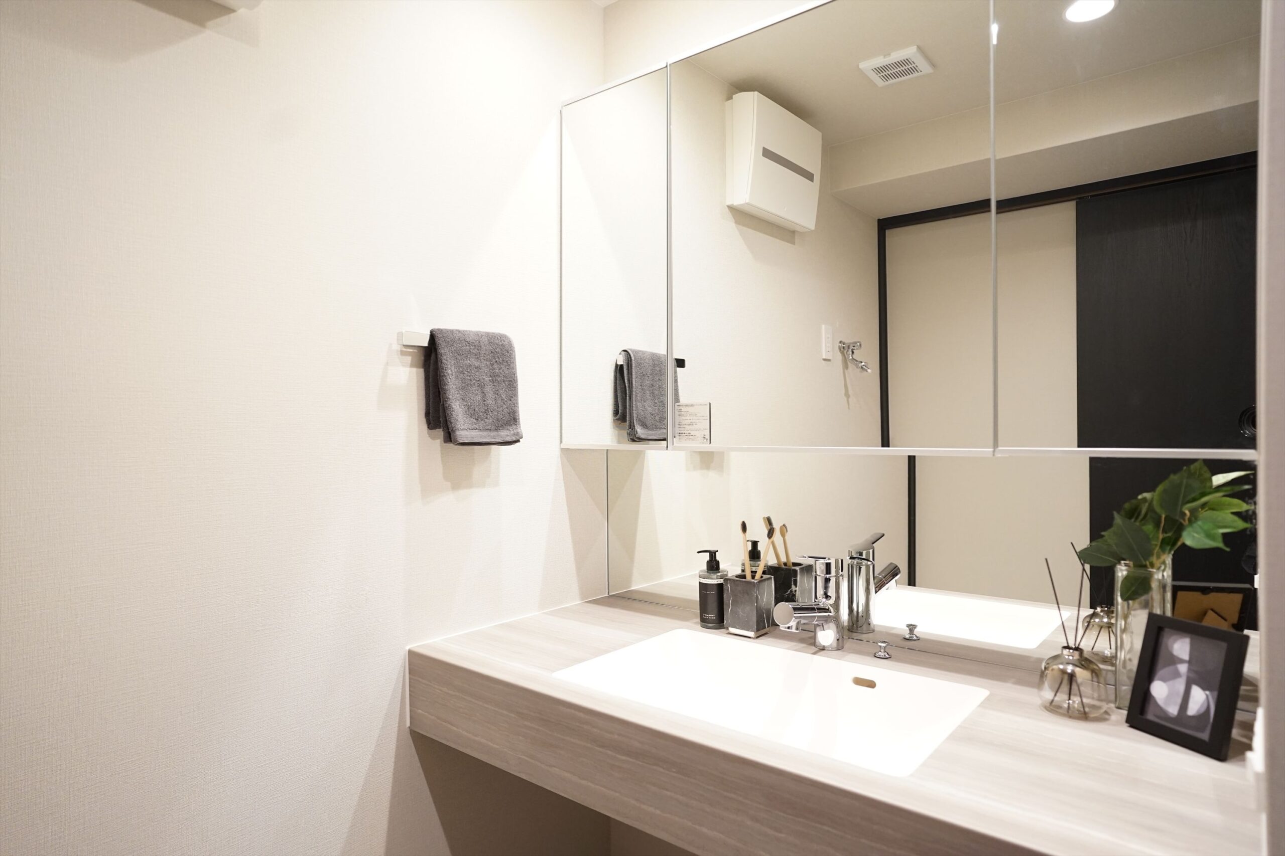 洗面にはAICAのスマートサニタリーを採用。美しさと実用性を兼ね備えたポストフォームカウンターは、作業スペースが広く、朝の時間にゆとりをもたらします。歯ブラシなどは三面鏡裏の収納スペースを、タオルや洗剤などはカウンター横の収納スペースを活用すれば、洗面室をすっきりと保つことができます。