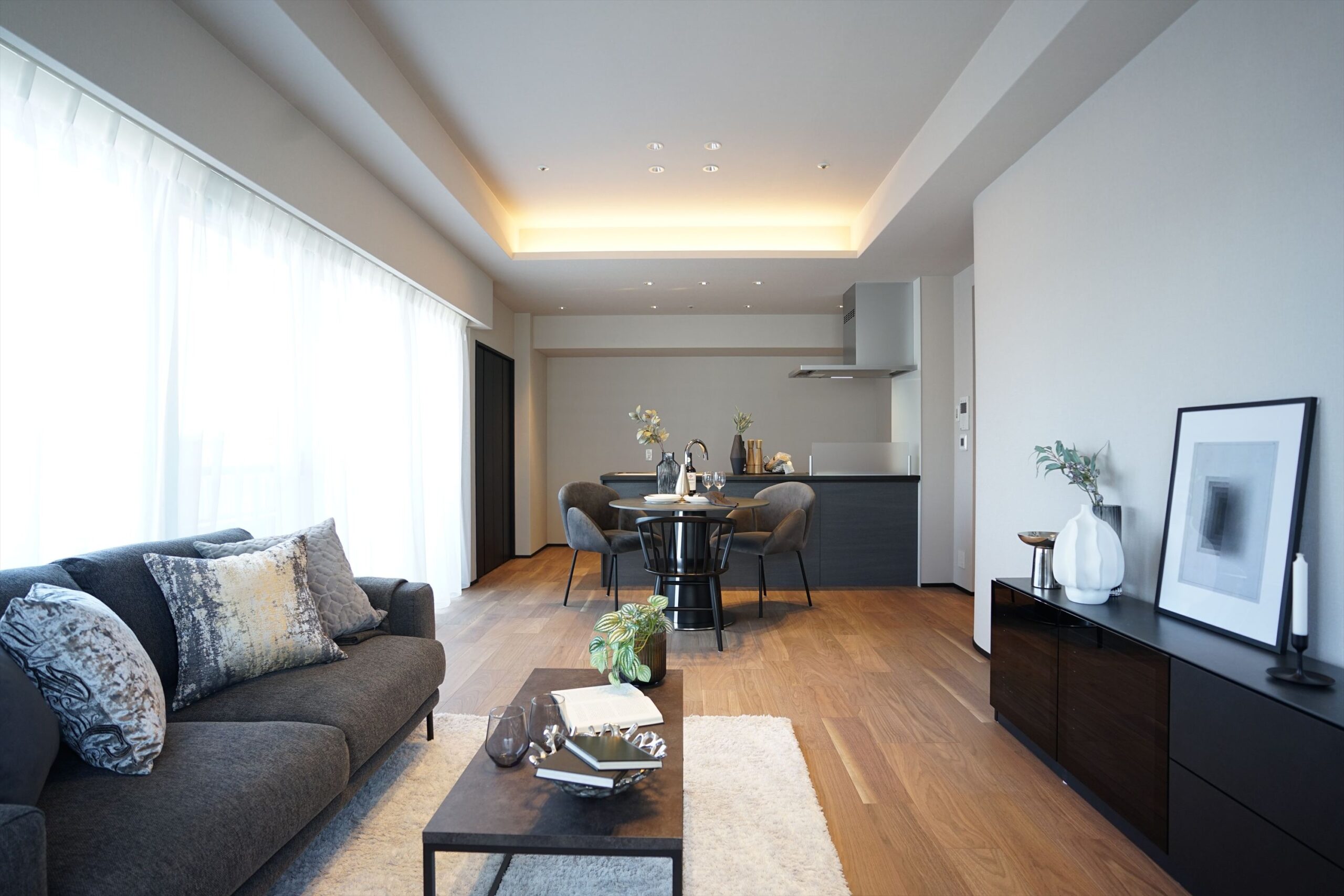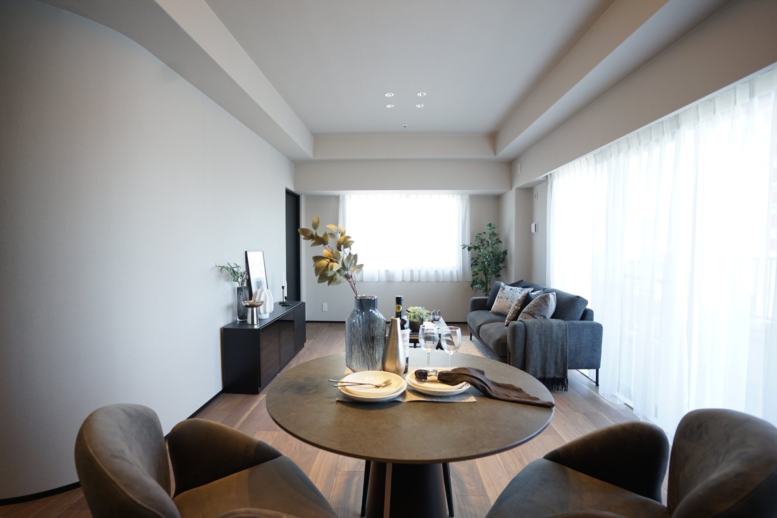 ガラス戸を開けた瞬間に広がる、やわらかなアーチが印象的で、落ち着いたカラーで引き締められた開放感あるLDK。「ライオンズマンション大阪スカイタワー」は、都心の利便を享受しながら、住まいの中では穏やかな時間を大切にしたい方にふさわしい住まいです。新町という街の心地よさを、そのまま日常の中に取り込める一邸です。