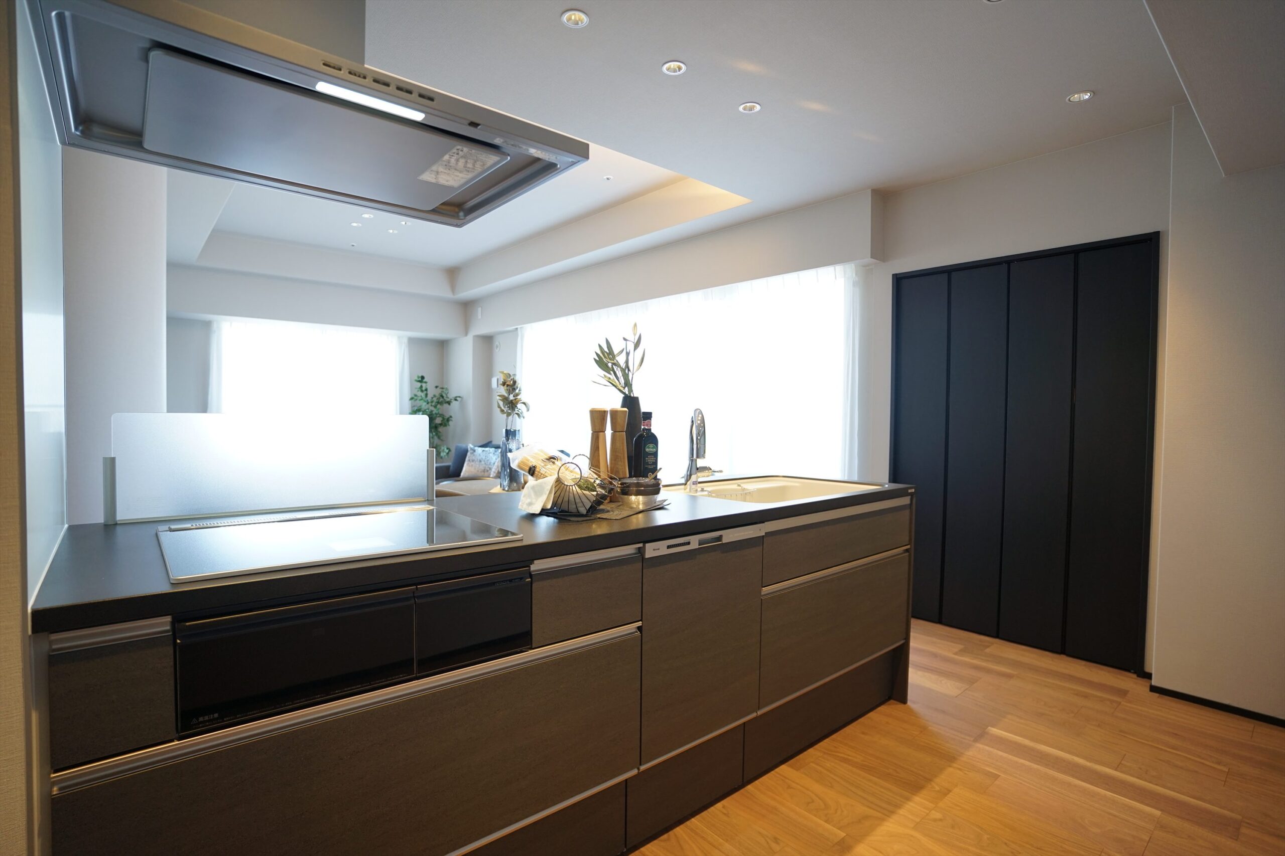 アーバンモダンカラーに馴染む対面キッチンのワークトップにはテノールカウンターを採用。表面硬度が高く、エンボス調表面加工で点接触となるため傷にも強く、目立ちにくい仕様です。また、汚れが染み込みにくい表面性能のため、汚れを落としやすくお掃除が楽になります。シンクはカウンターとの繋ぎ目がないため汚れがたまる心配もありません。そして、大容量の収納スペースと深型の食洗機が、家事の効率化を助けます。